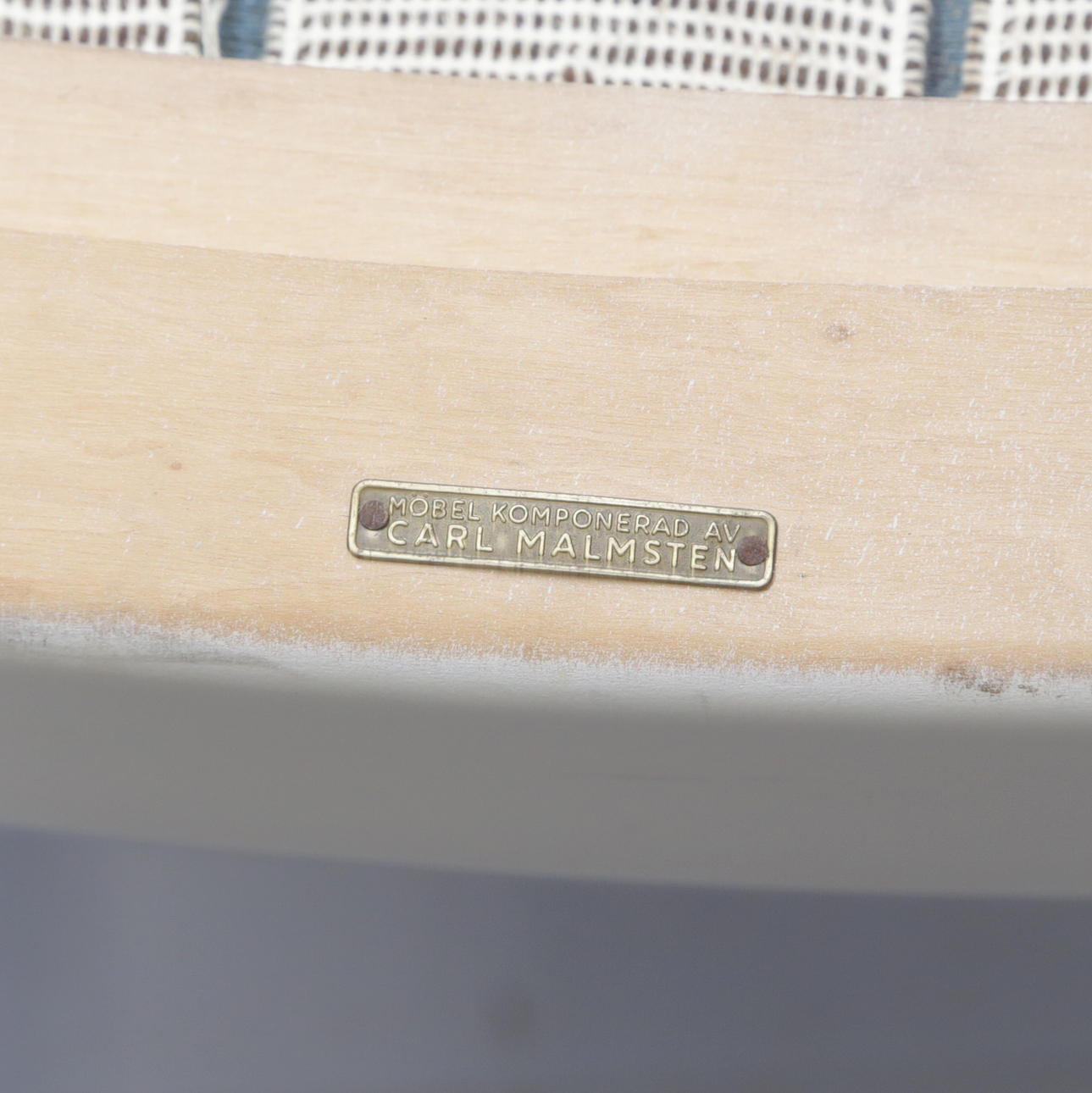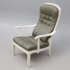 4331351. CARL MALMSTEN. FÅTÖLJ, trä/textilkuddar. brickmärkt.