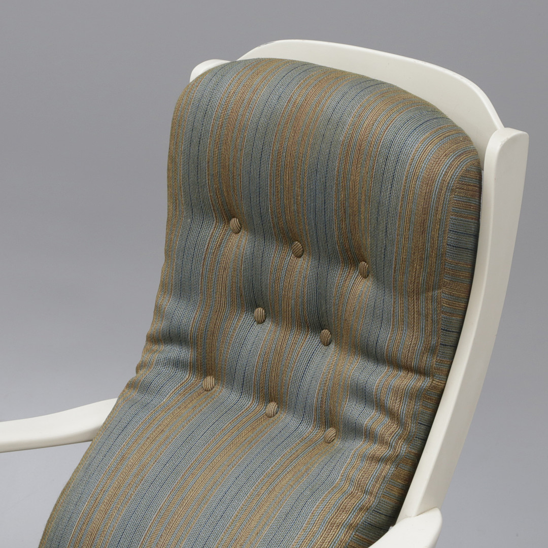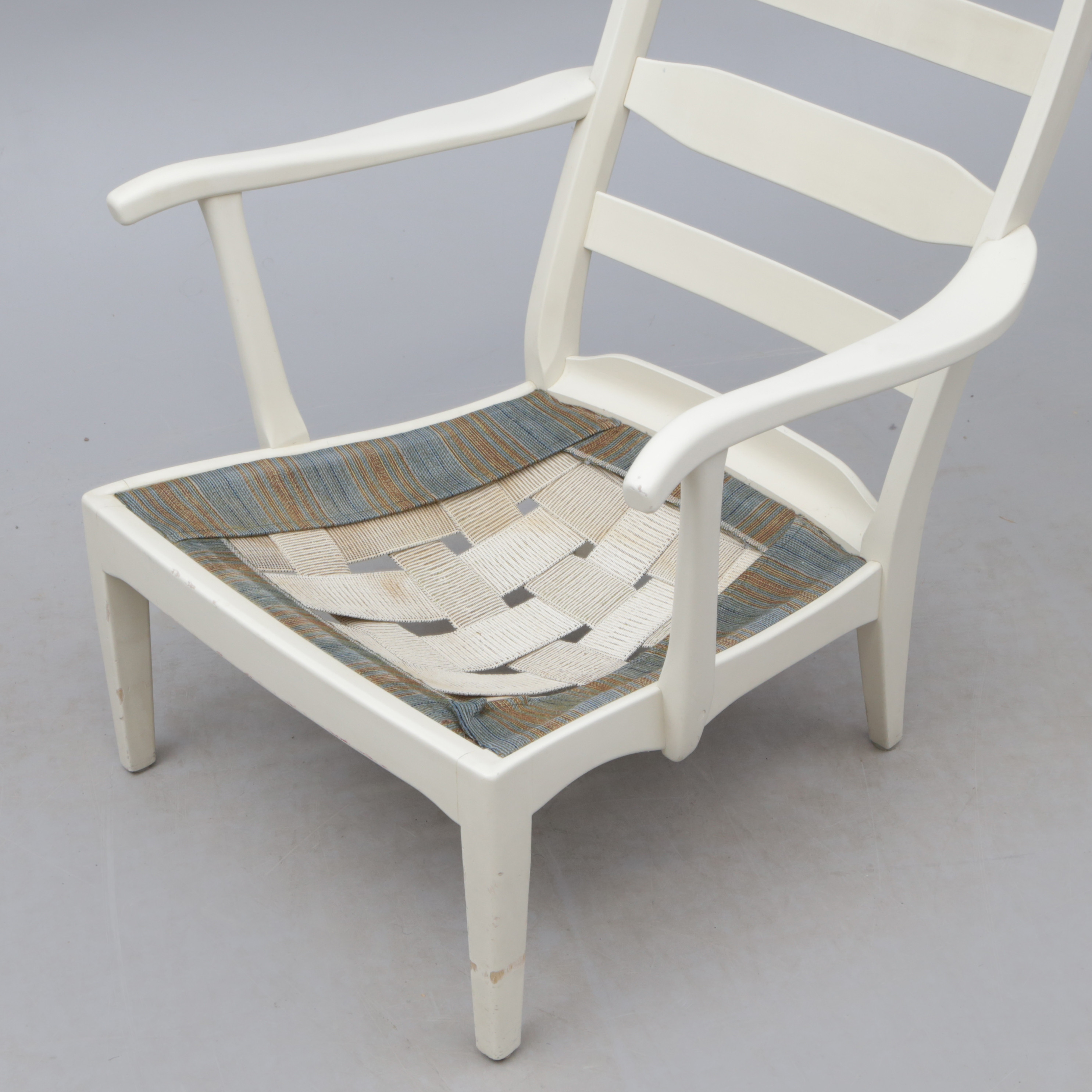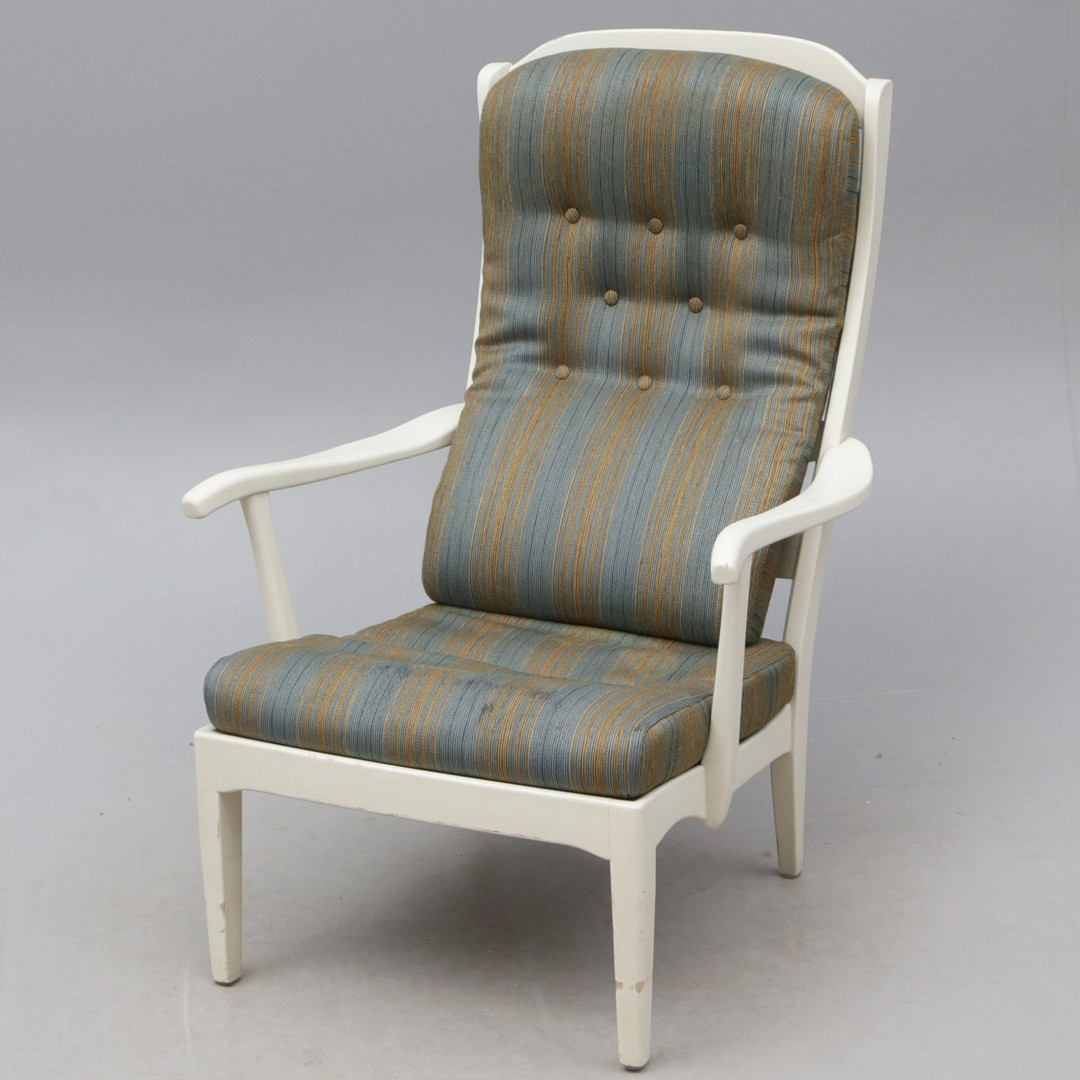 4331351. CARL MALMSTEN. FÅTÖLJ, trä/textilkuddar. brickmärkt.