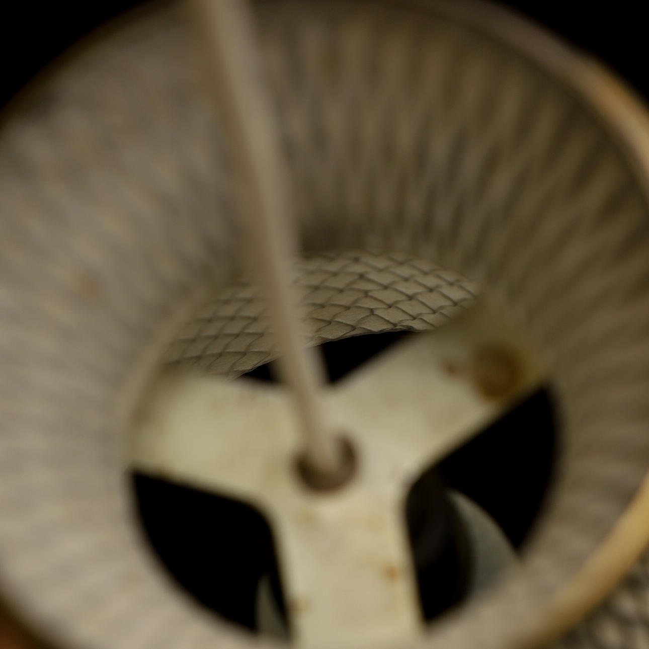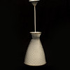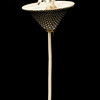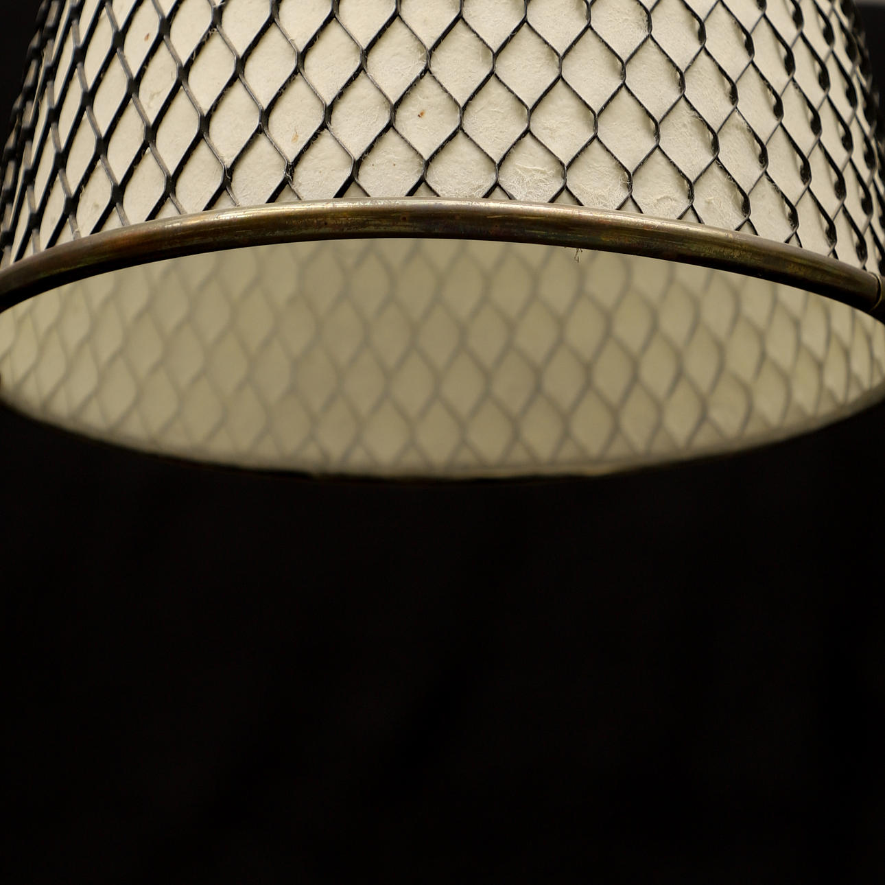 Skärm och takkopp med svart metallnät. Invändigt klädd. Diameter ca 21, höjd 62 cm.