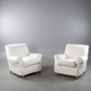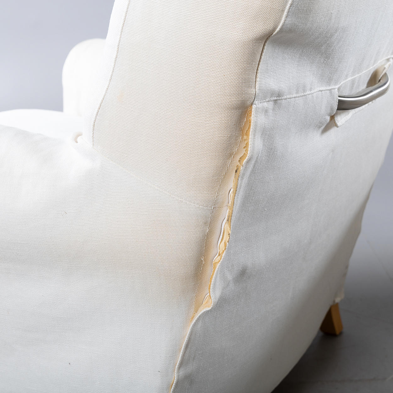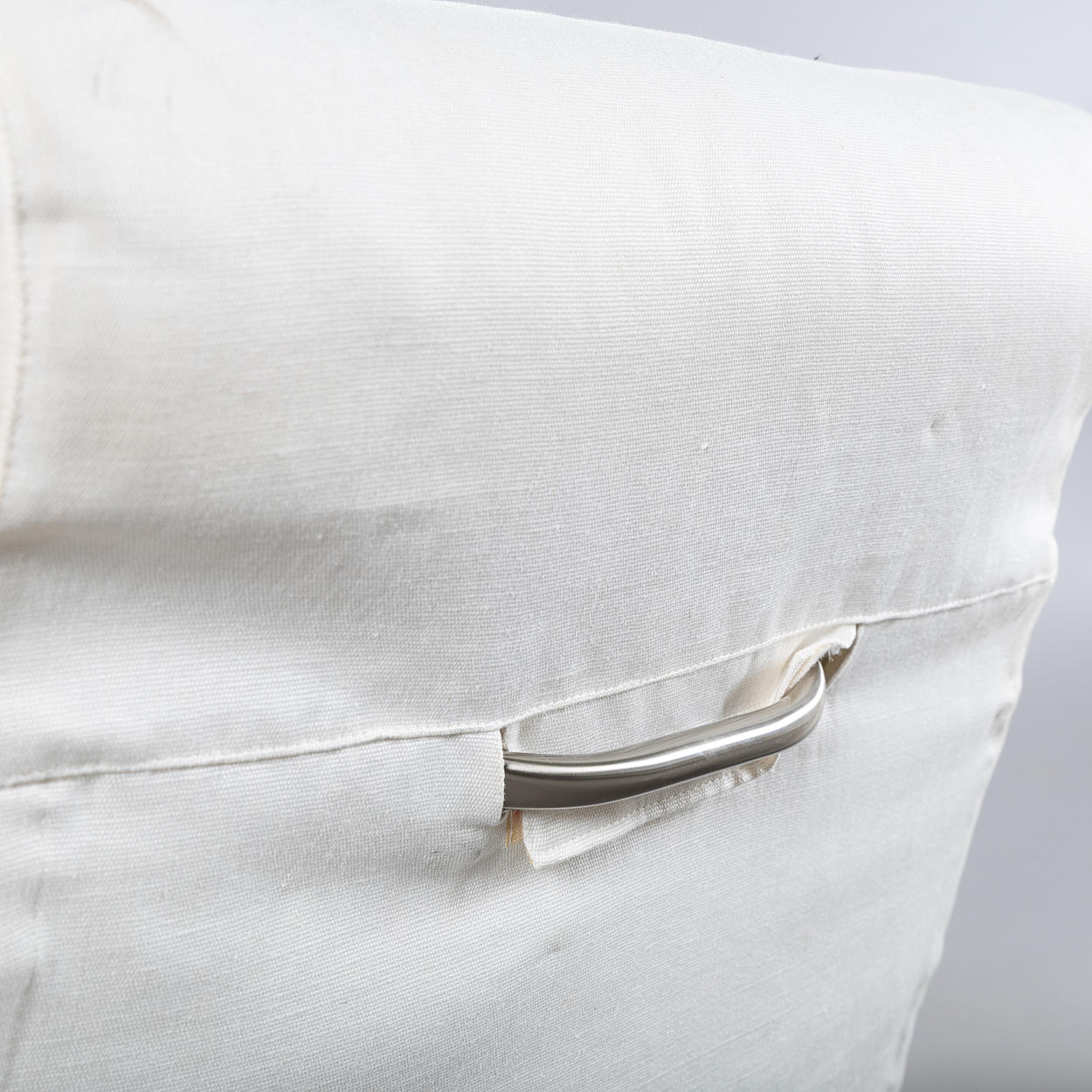 Etikettmärkta, vit klädsel, avtagbar, främre ben med hjul, handtag bakom rygg, höjd ca 84, bredd 90, sitthöjd 43 cm.