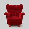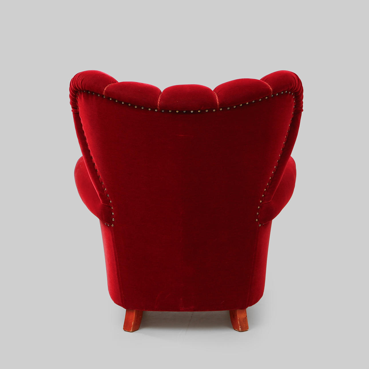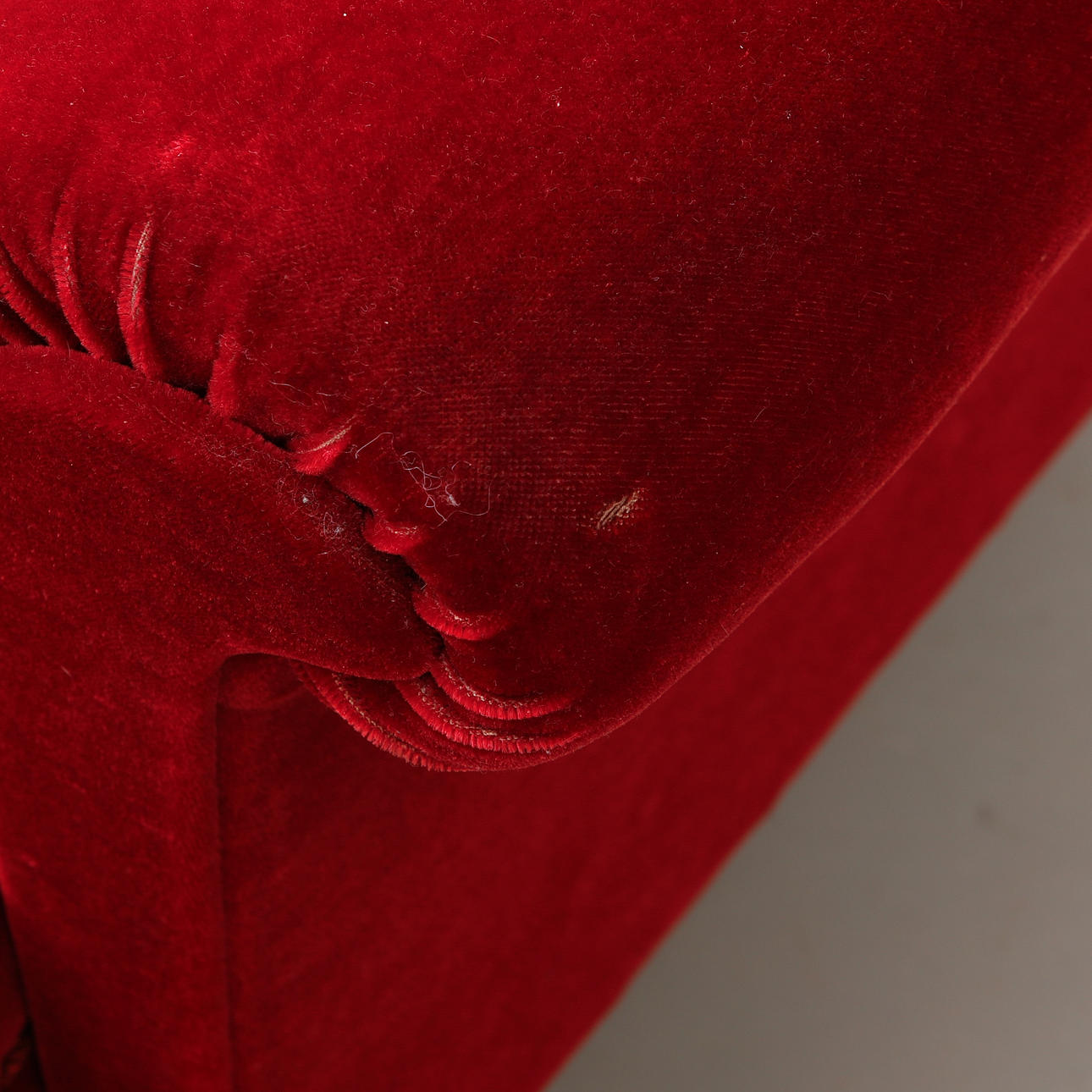 Röd plyschklädsel med djuphäftad rygg. På kulfötter och ben i betsat trä. Bredd ca 90 cm, sitthöjd ca 40 cm, rygghöjd ca 95 cm.