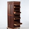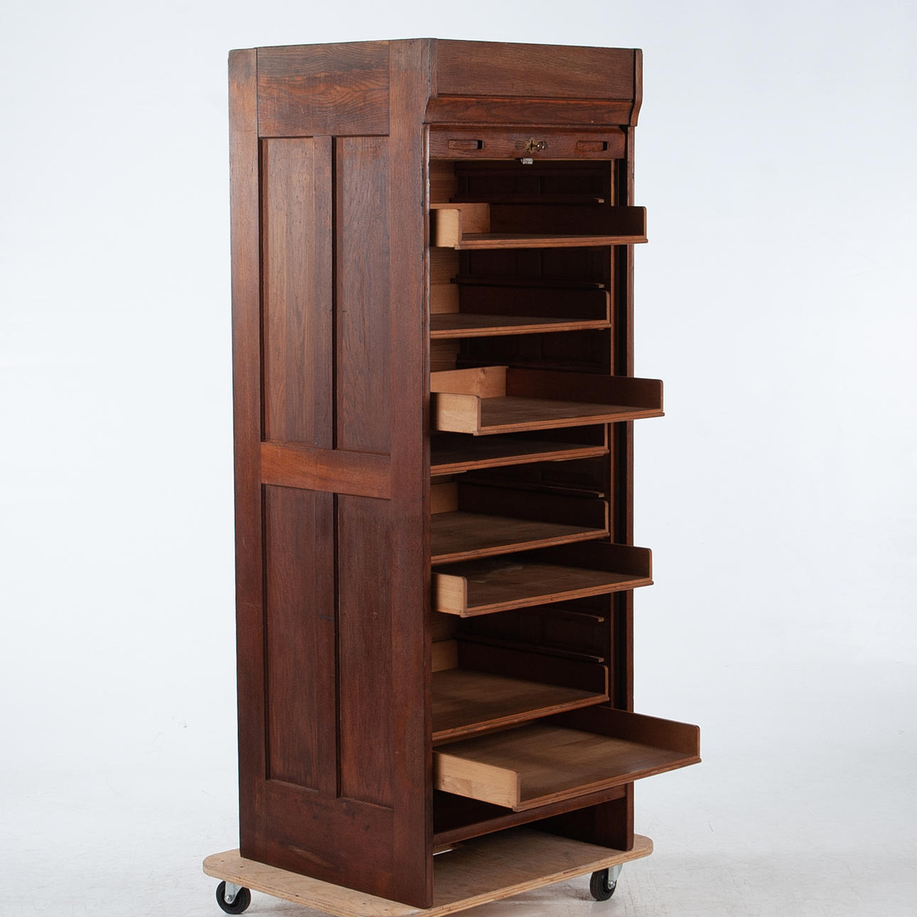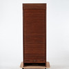 Jalusiskåp i trä med vertikal rullfront och invändigt åtta utdragbara hyllplan, utfört i fanerat trä med stomme i massiv furu. 1900-talets mitt.