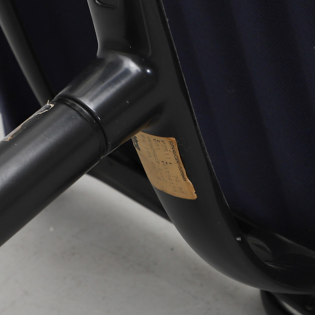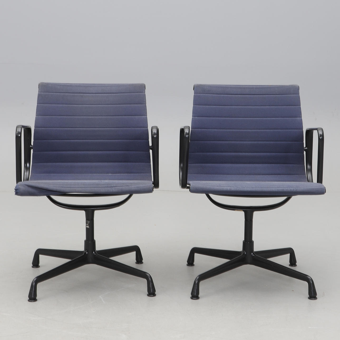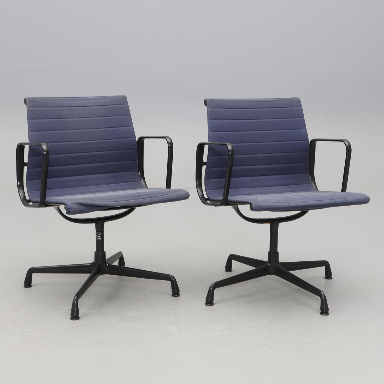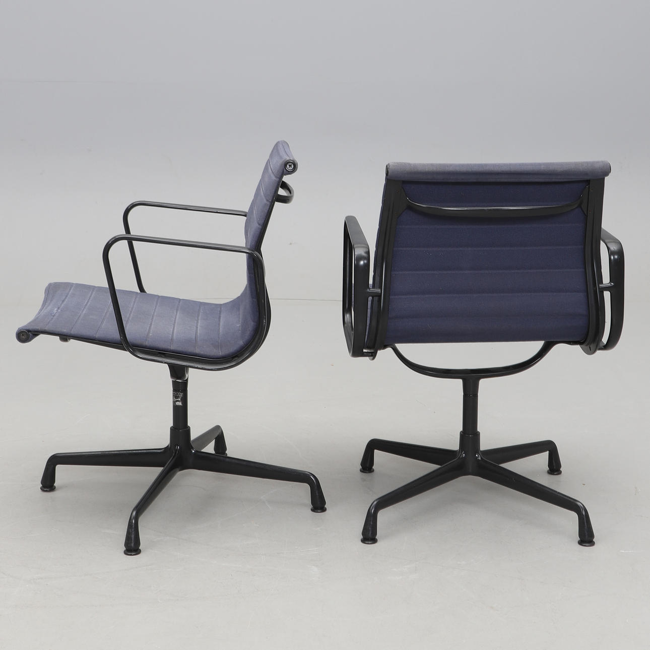 Svartlackerad aluminium. Mörkblå textilklädsel. Fyrdelad snurrbar fot. Etikettmärkt. Bredd 58, djup 65, rygghöjd ca 80, sitthöjd 44 cm.
