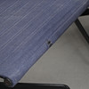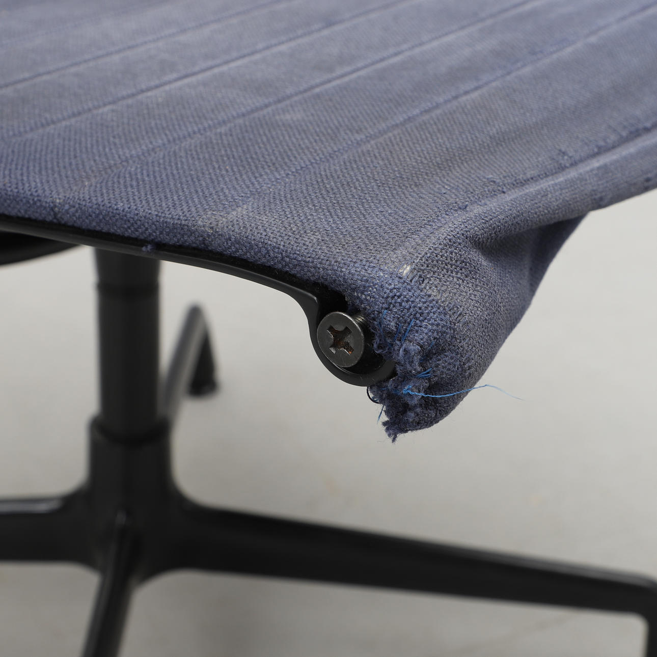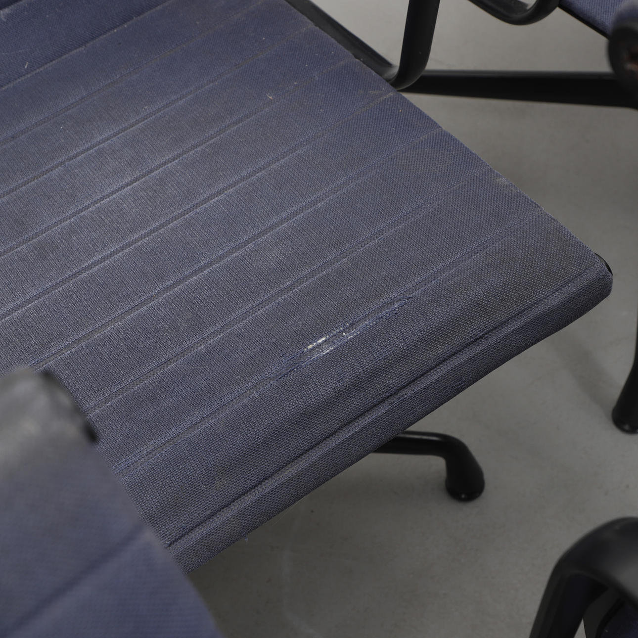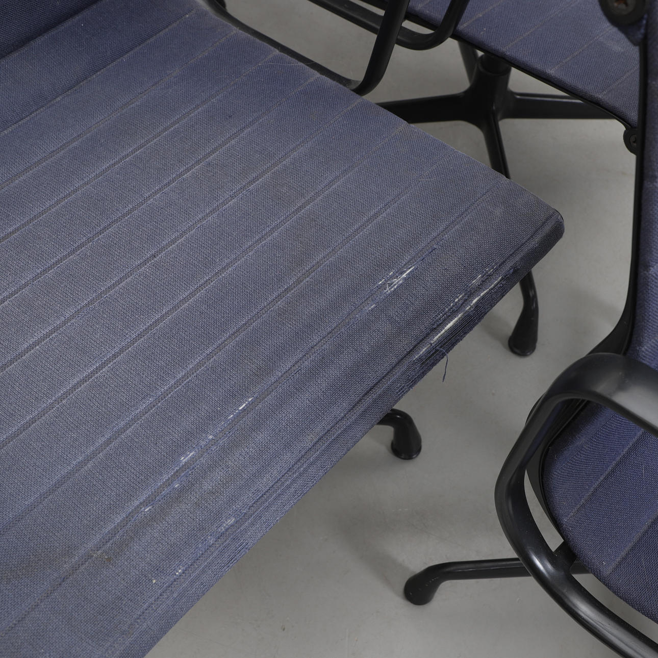Svartlackerad aluminium. Mörkblå textilklädsel. Fyrdelad snurrbar fot. Etikettmärkt. Bredd 58, djup 65, rygghöjd ca 80, sitthöjd 44 cm.