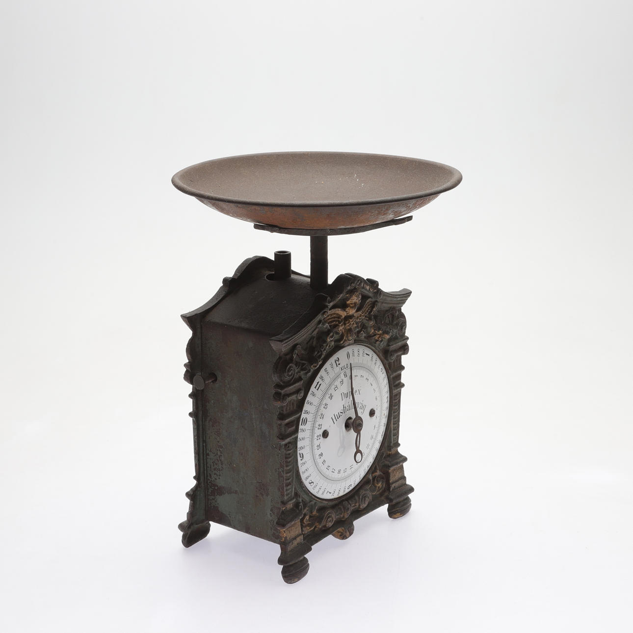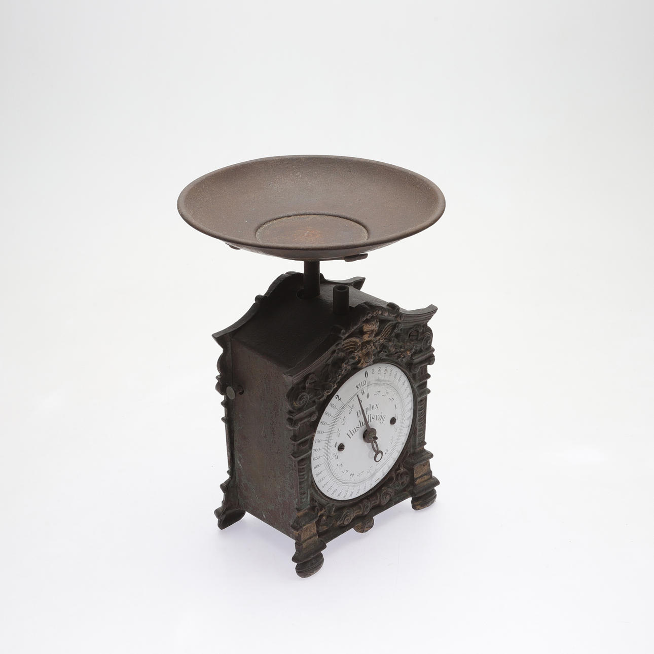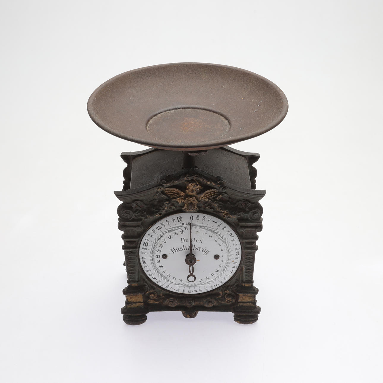 Målat gjutgods. Emaljerad tavla. Lös skål, diam 23 cm. Total höjd 32 cm.
