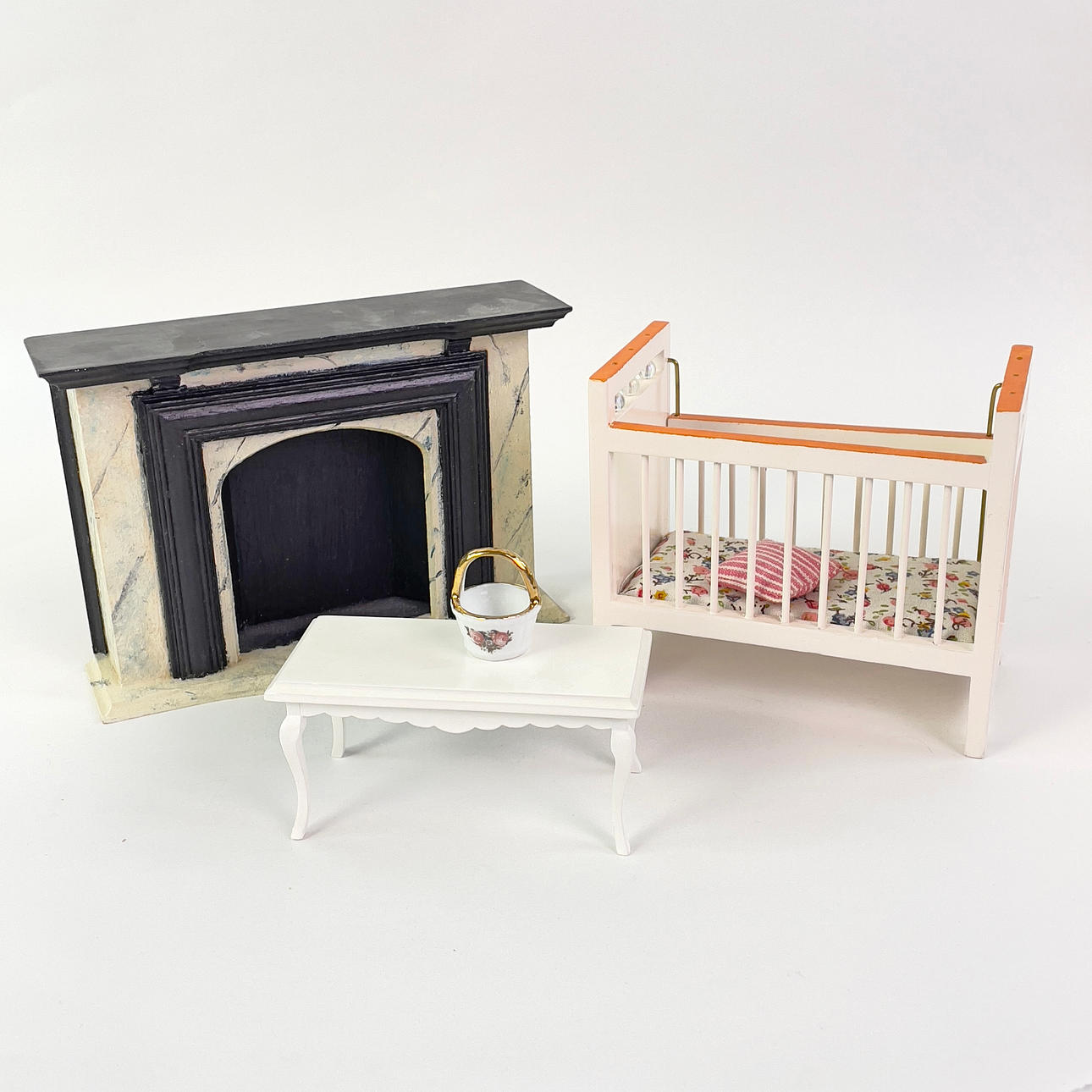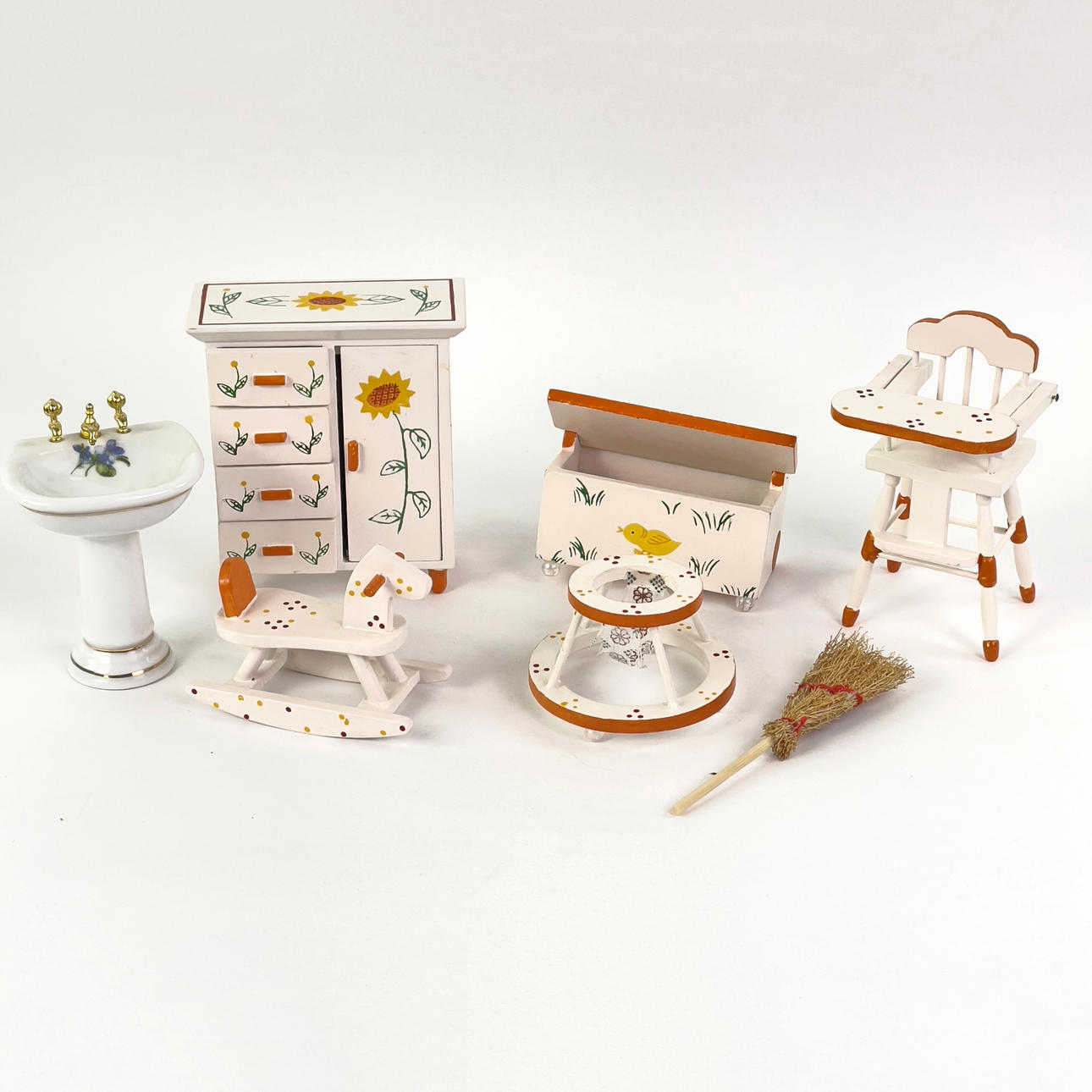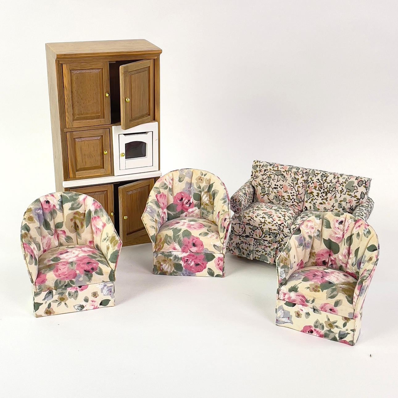Parti dockmöbler och inredning till dockskåp.