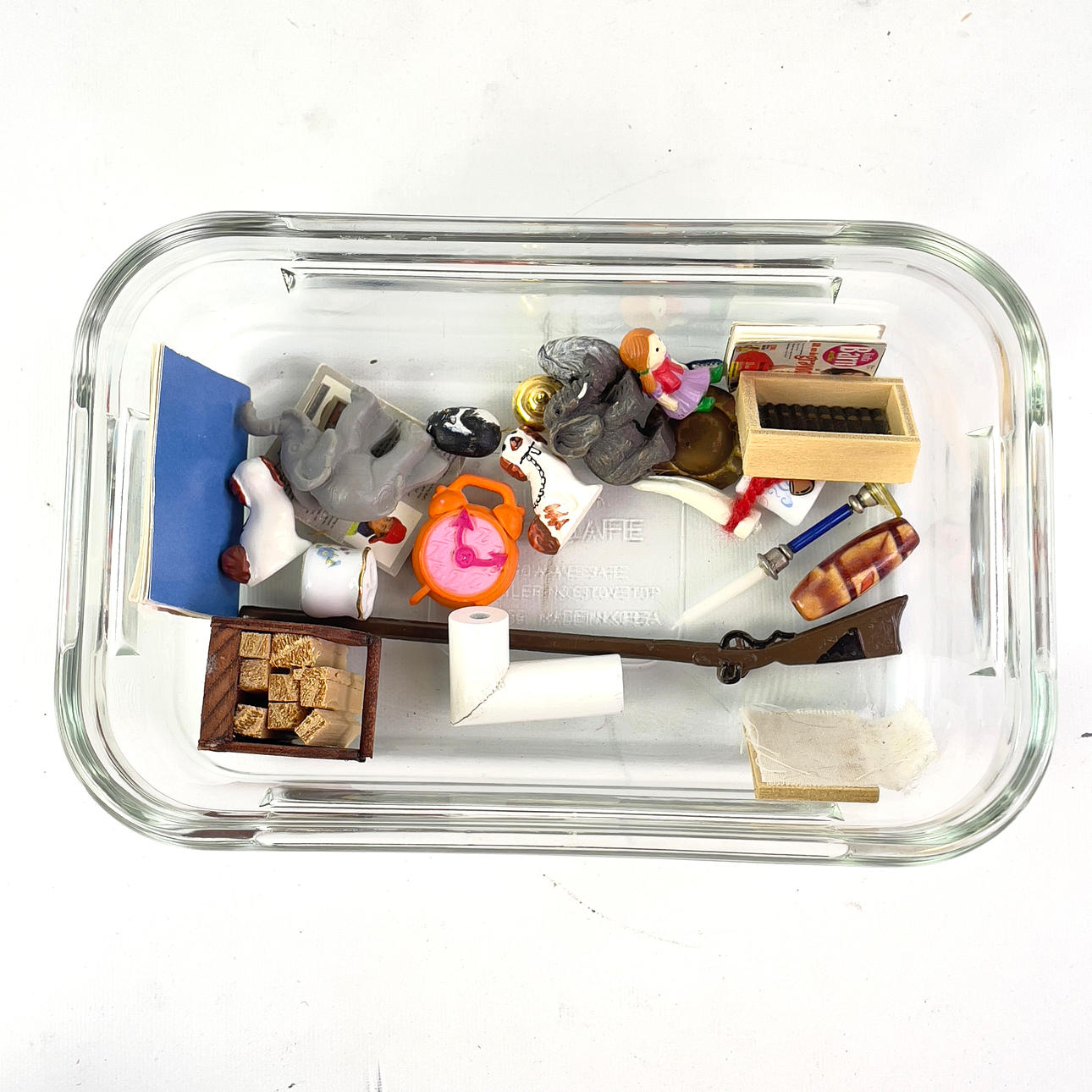 Ca 45 delar, varav en låda med mindre inredningsföremål samt en docka.