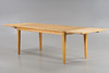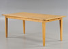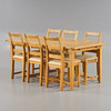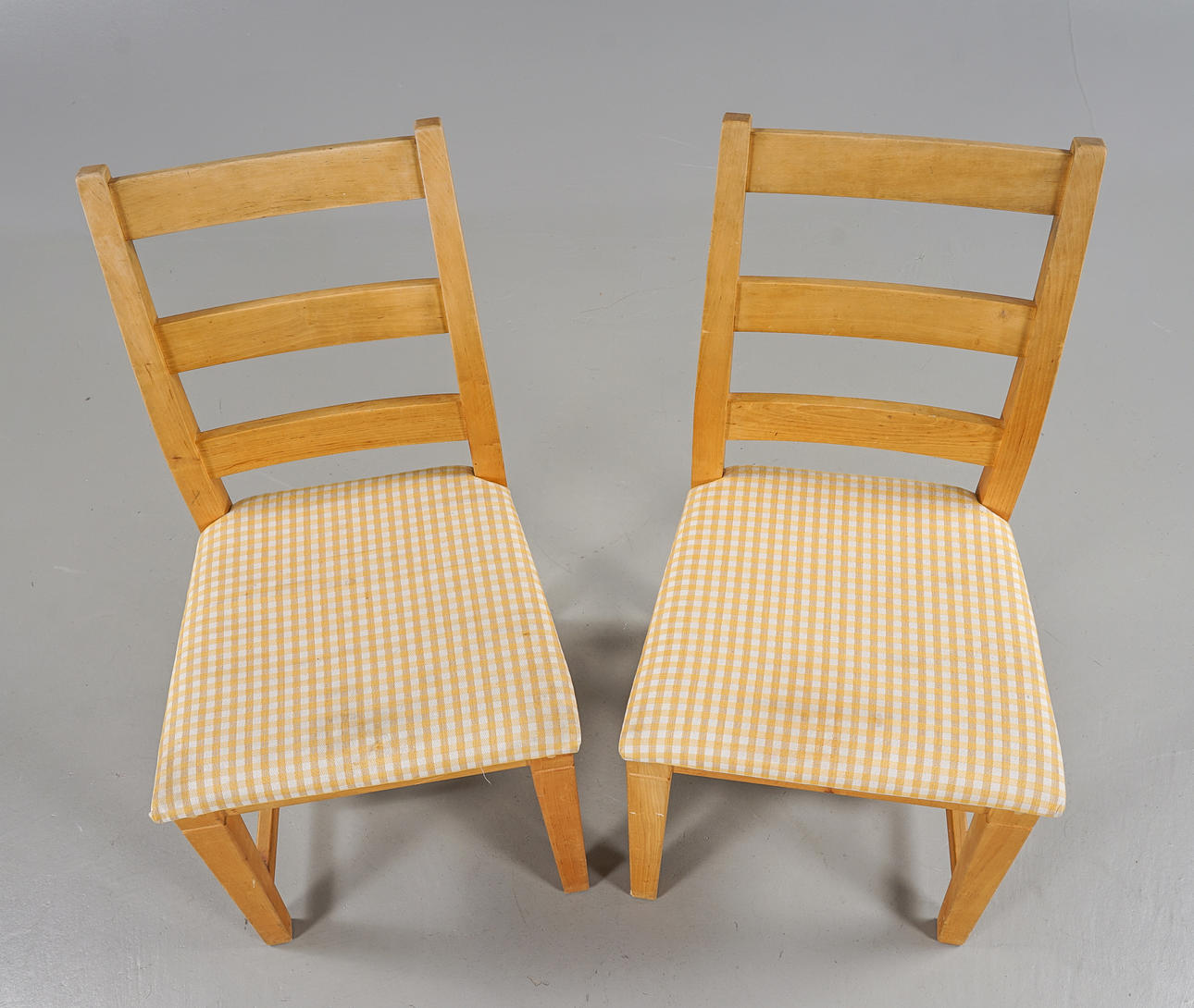 Massiv björk. 6 stolar, bord med 2 tilläggsskivor.