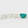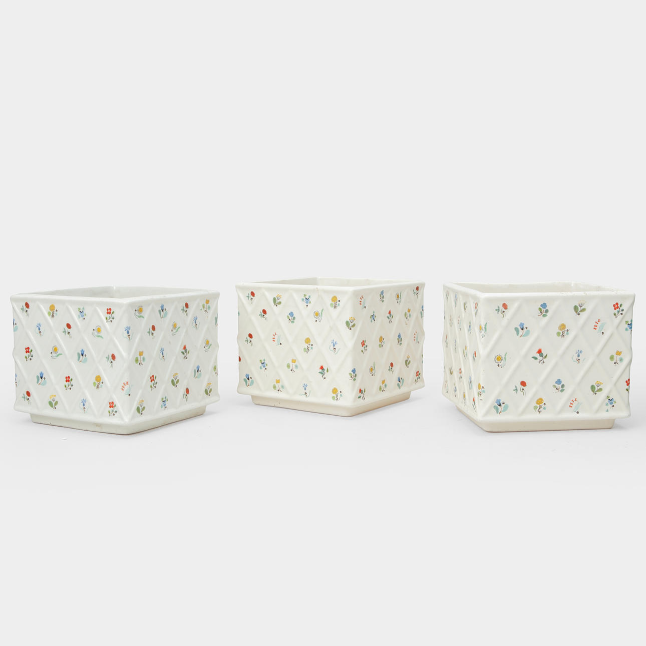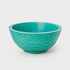 Grönglaserad skål i stengods av Wilhelm Kåge. Dia. ca 22,5 cm, höjd ca 10 cm. Tre ytterfoder "Gustavsbergs blommor" i flintgods. Mått ca 13 x 13 x 11 cm.