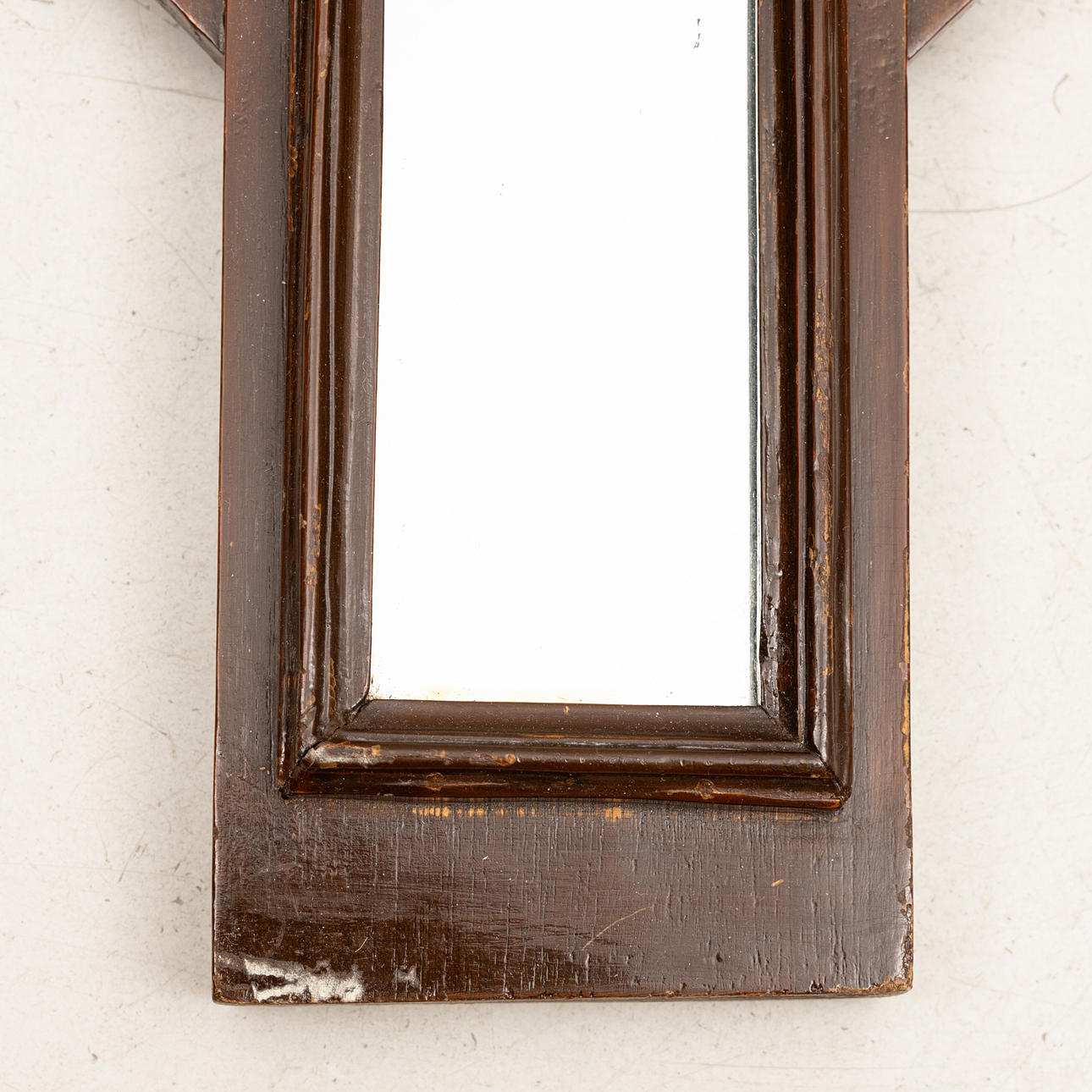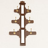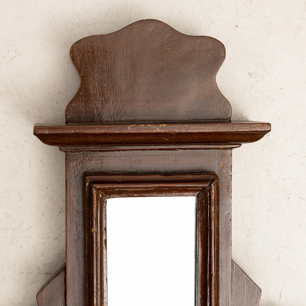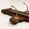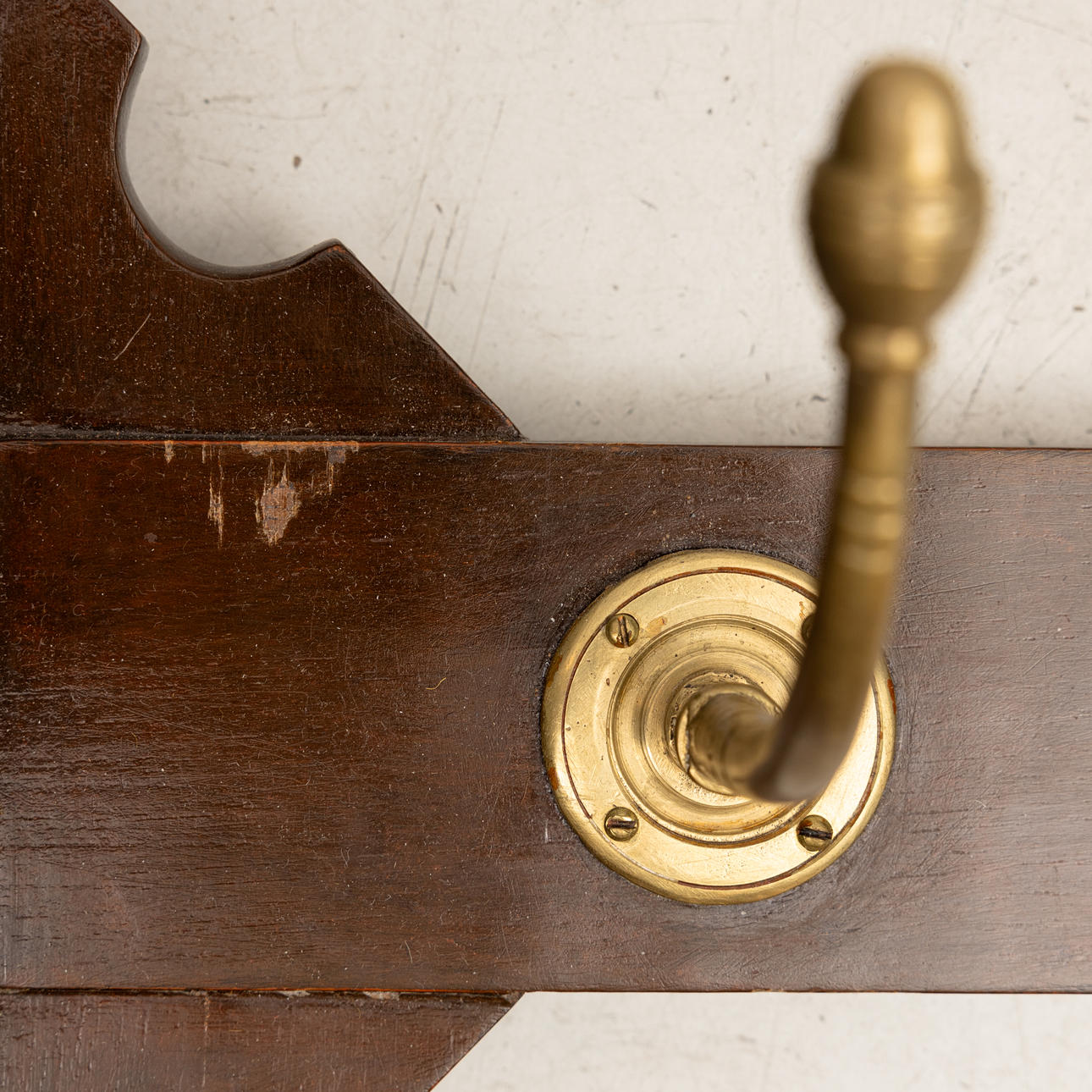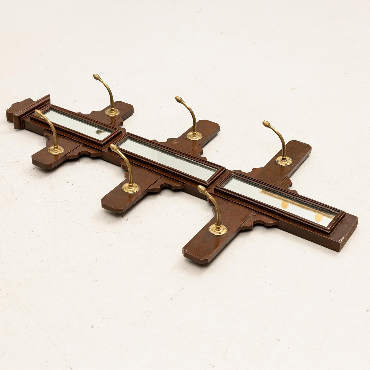 Flankerande sex mässingskrokar. Brunmålat trä. Höjd 116, bredd 42,5-62 cm.