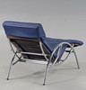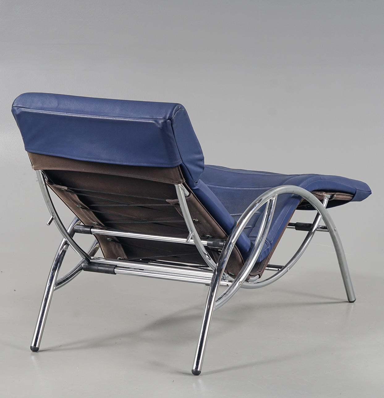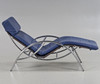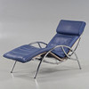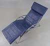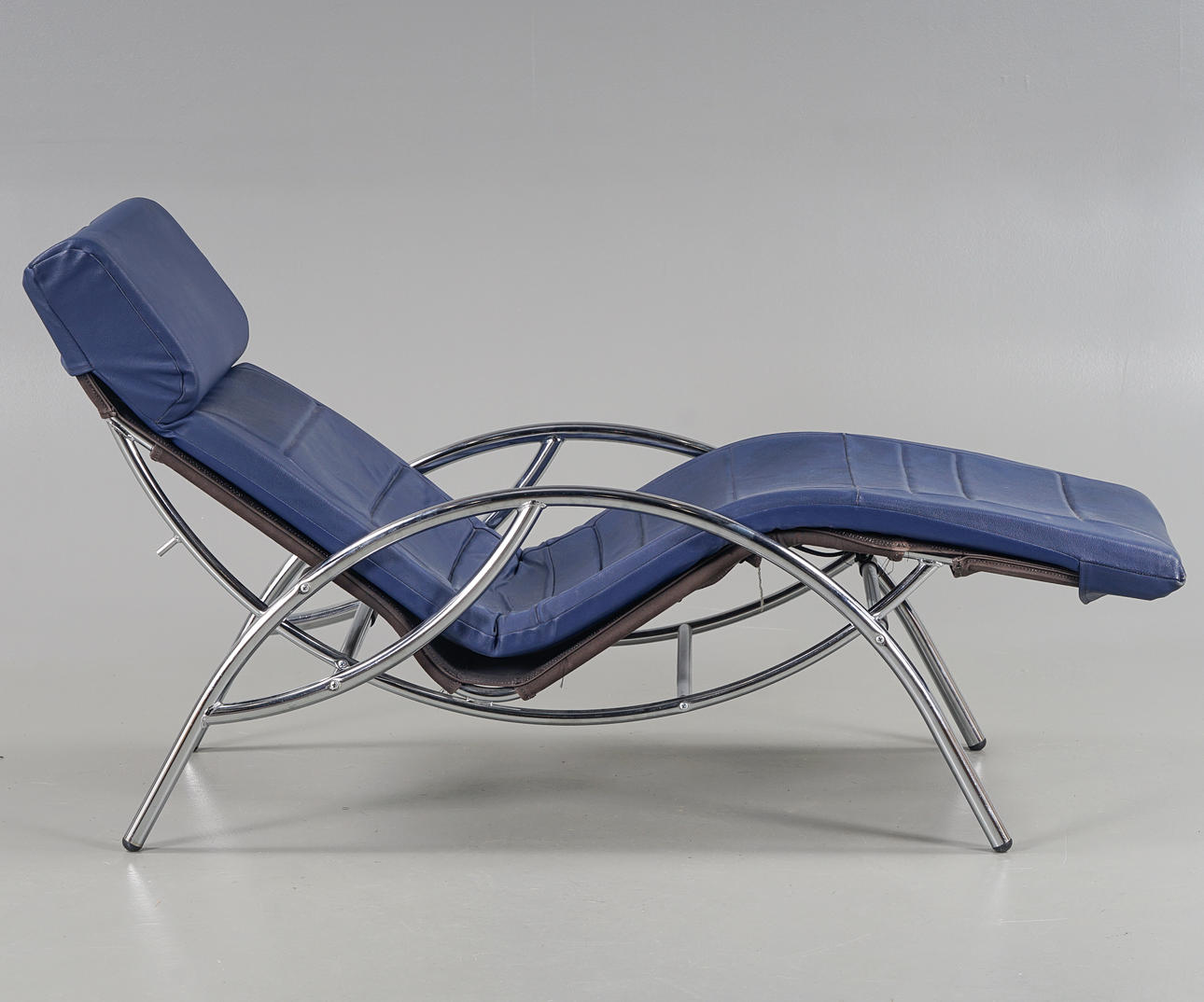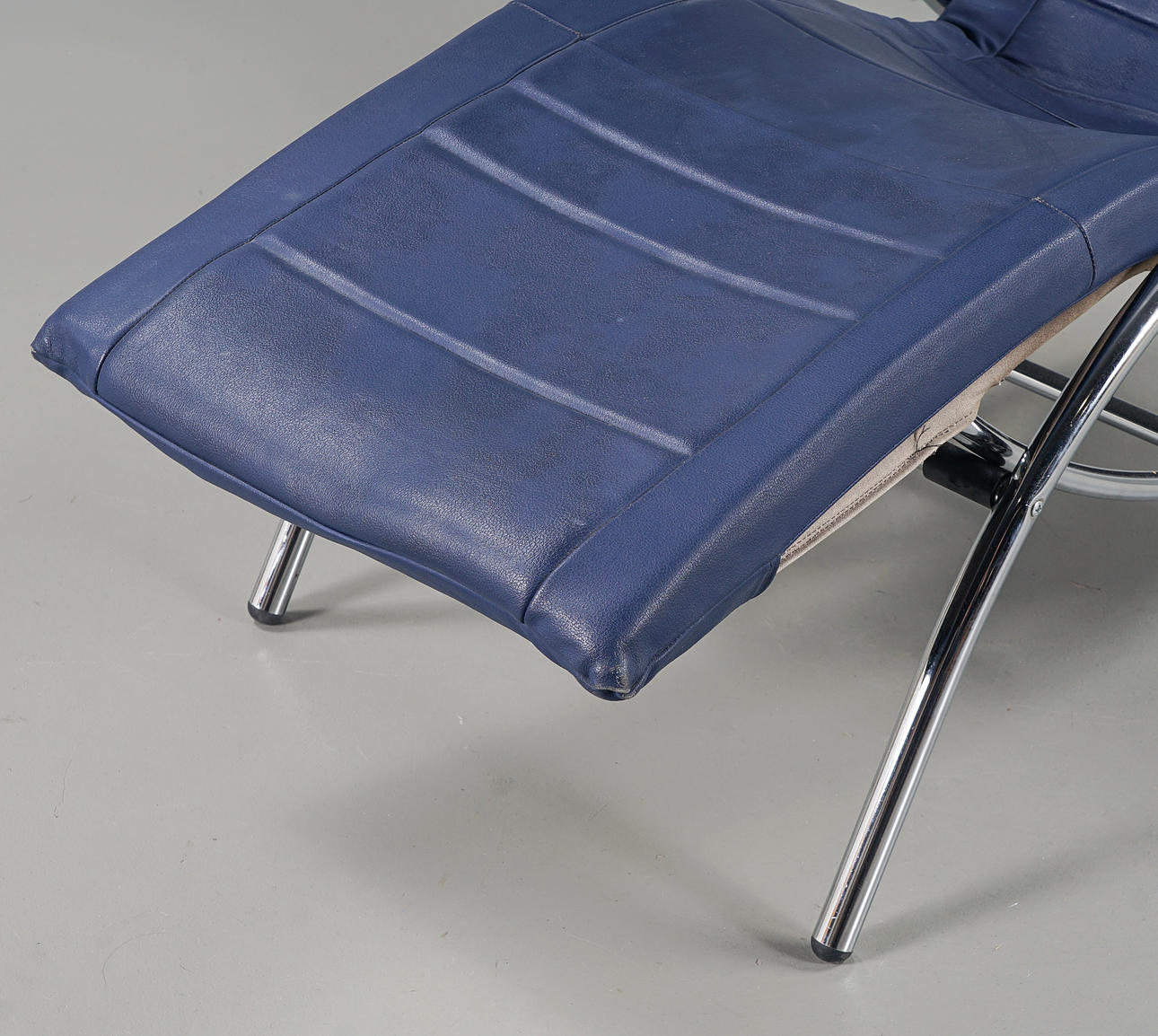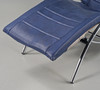 Kromad stomme, ställbara sits, dyna med blå skinnklädsel.