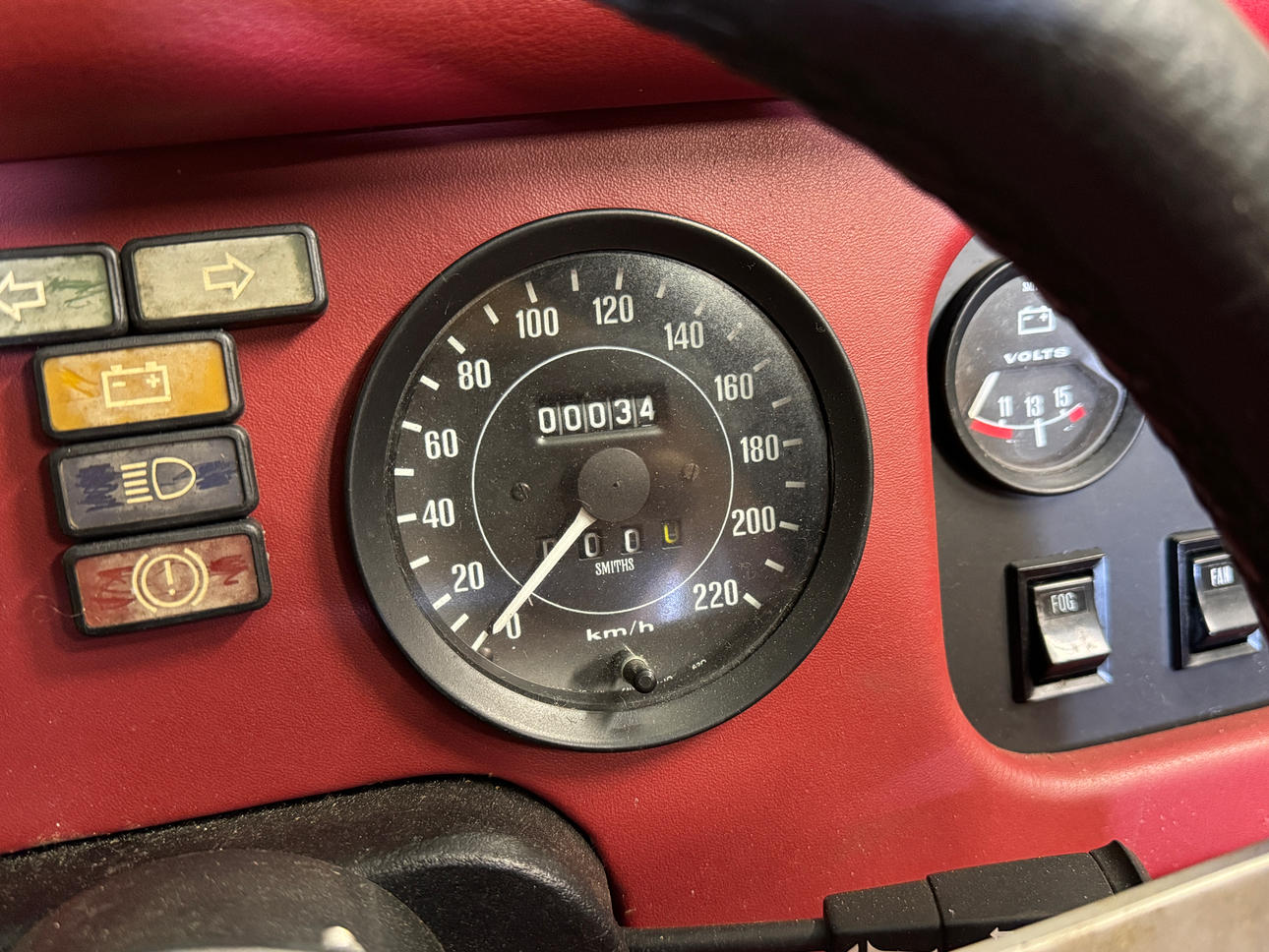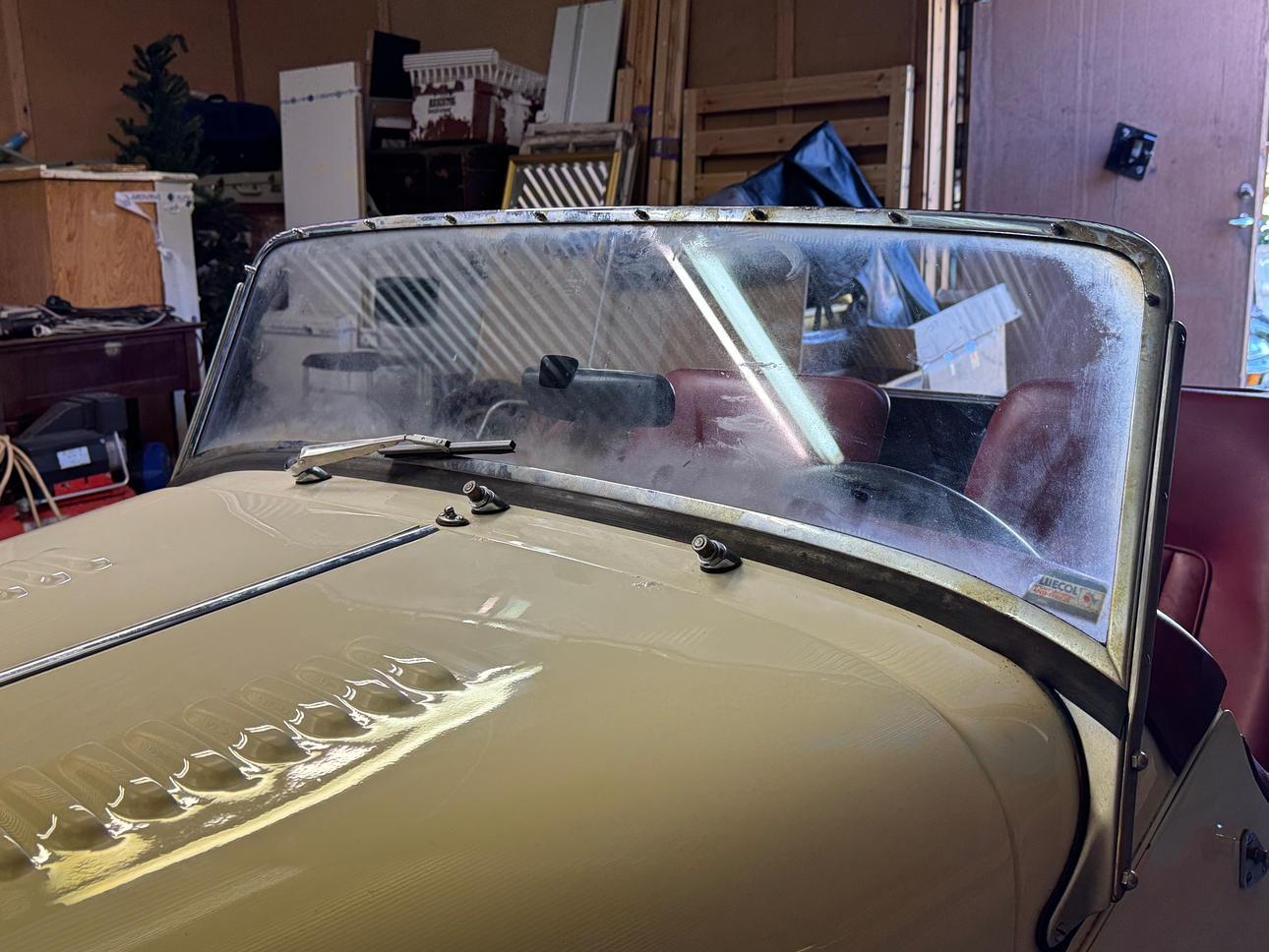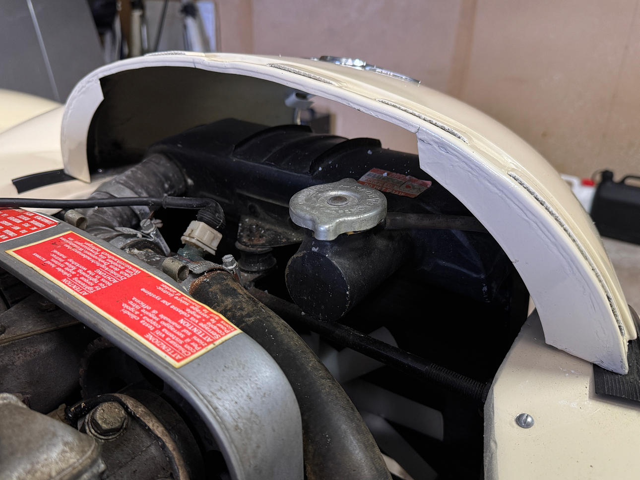 Vid inspektion har vi noterat små nyansskillnader i färgen, vilket indikerar att omlackering har utförts. De ursprungliga lackerade delarna uppvisar tecken på ett mindre professionellt utförande, medan de omlackerade delarna framstår som mer välgjorda. Även textilremsan vid motorhuven har målats över.