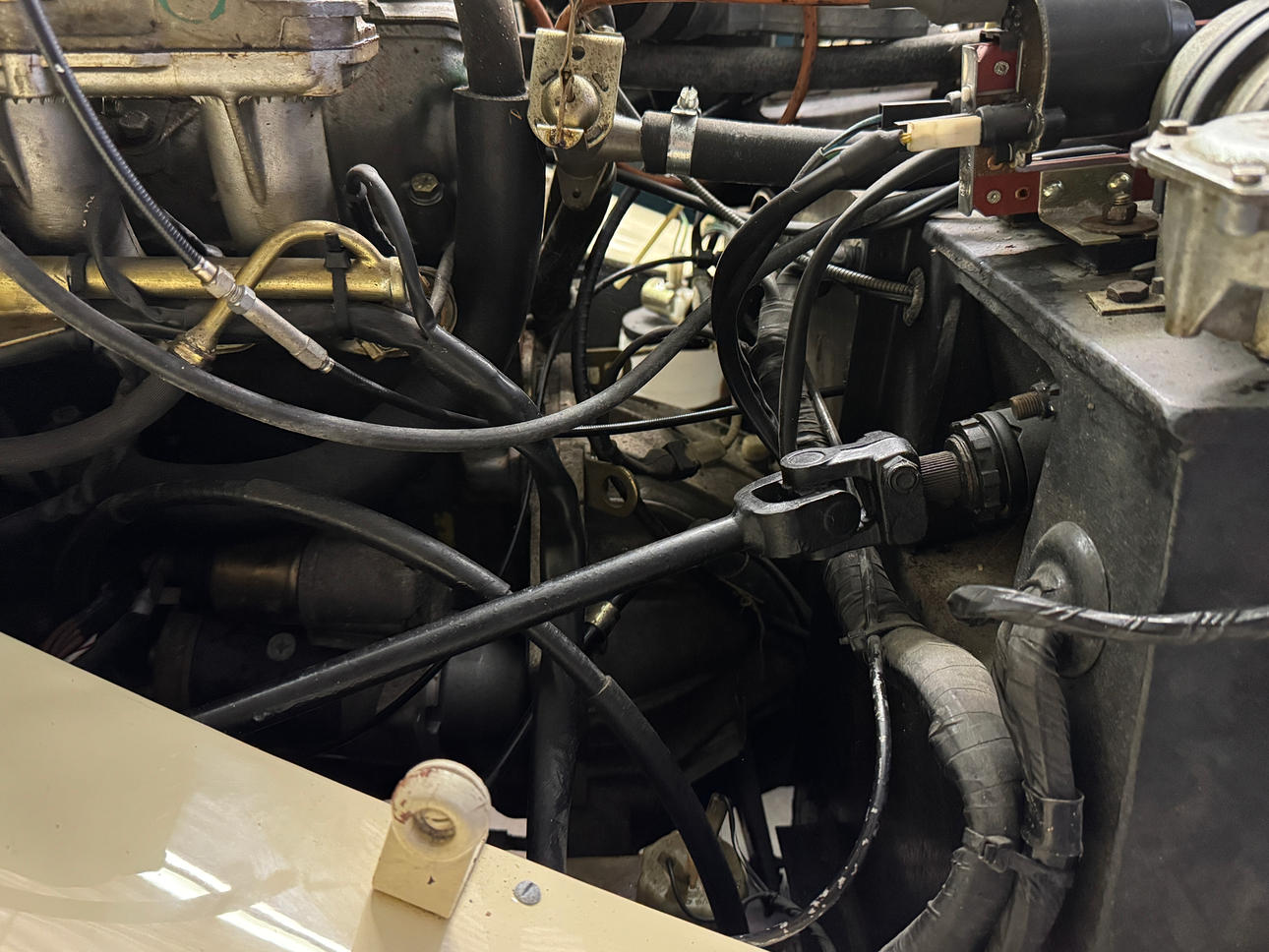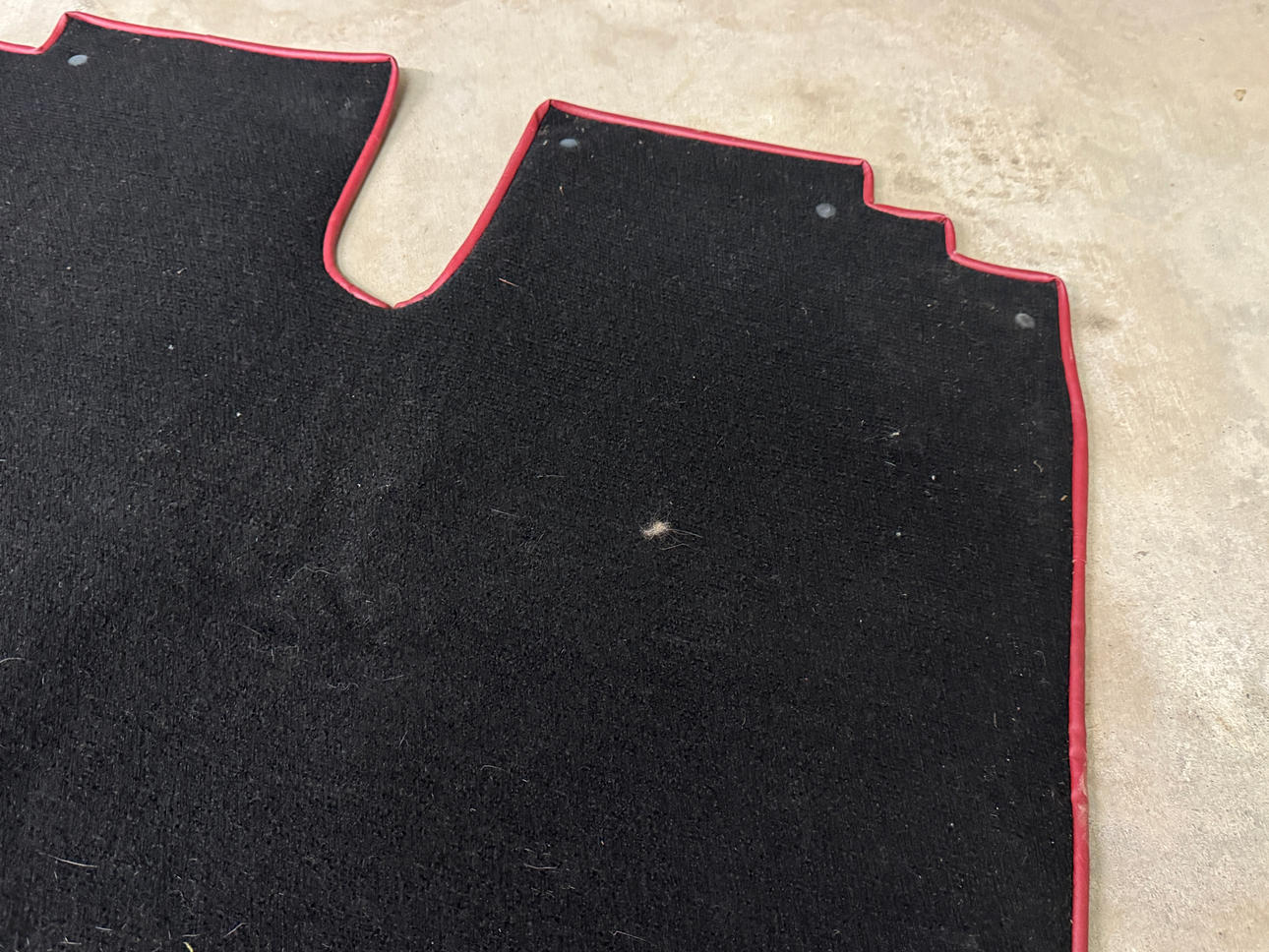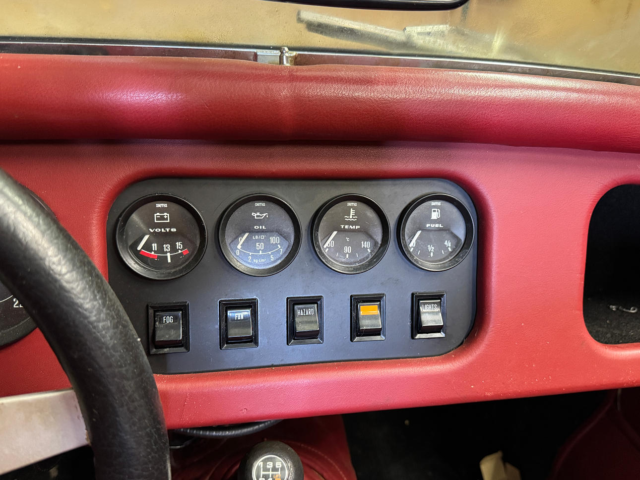 Vid inspektion har vi noterat små nyansskillnader i färgen, vilket indikerar att omlackering har utförts. De ursprungliga lackerade delarna uppvisar tecken på ett mindre professionellt utförande, medan de omlackerade delarna framstår som mer välgjorda. Även textilremsan vid motorhuven har målats över.