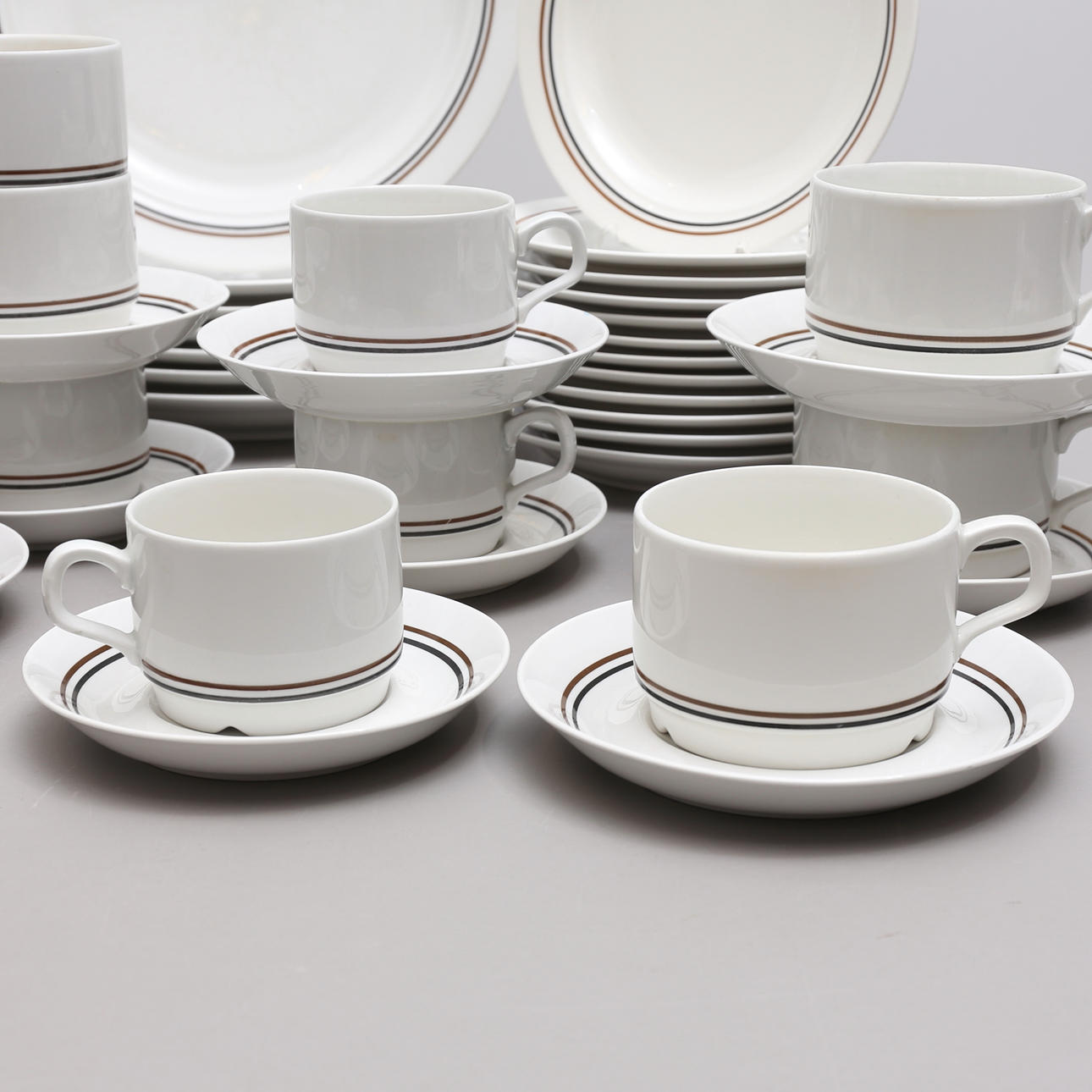 12 koppa med 9 fat, koppens höjd ca 5,5 cm, fatens diameter ca 13,5 cm