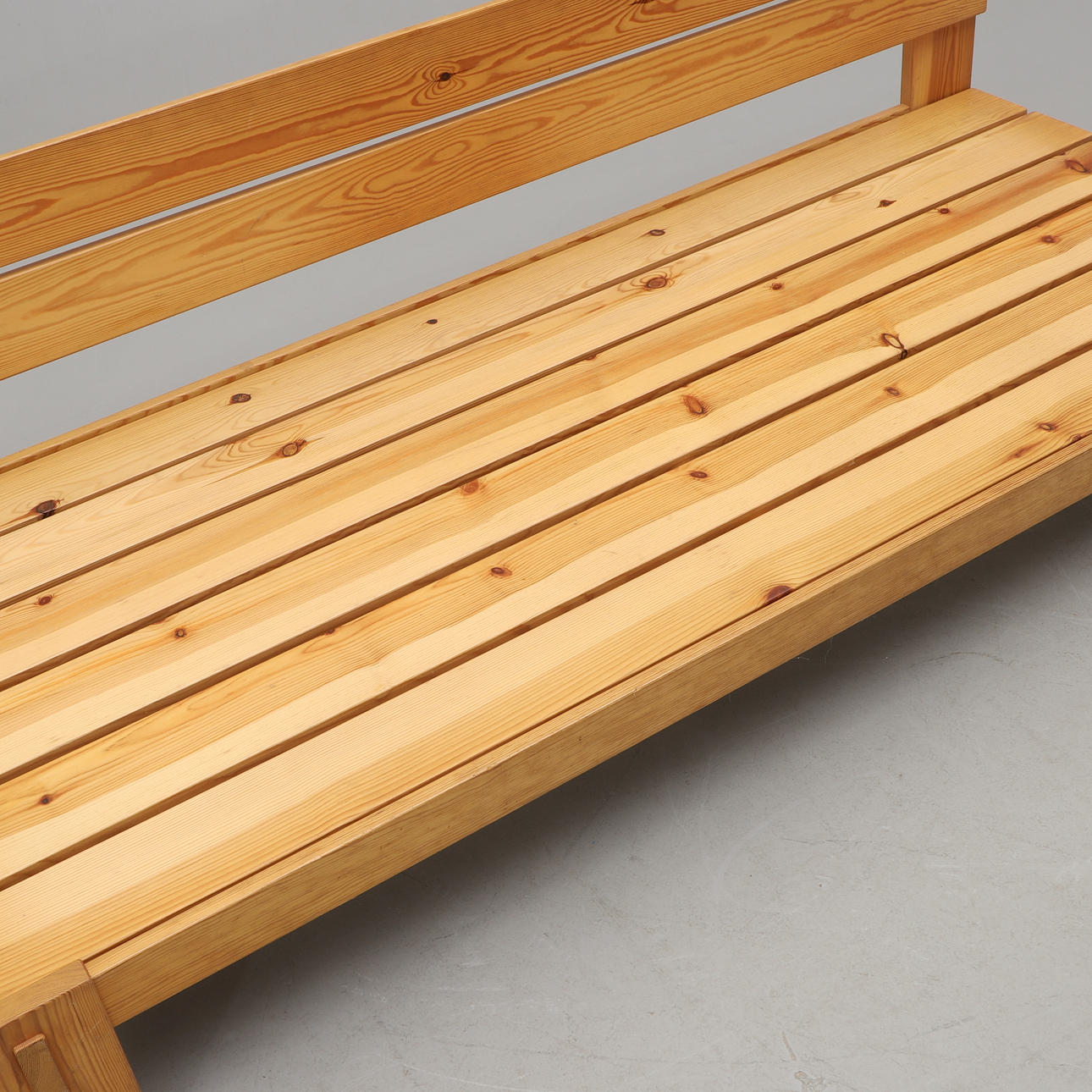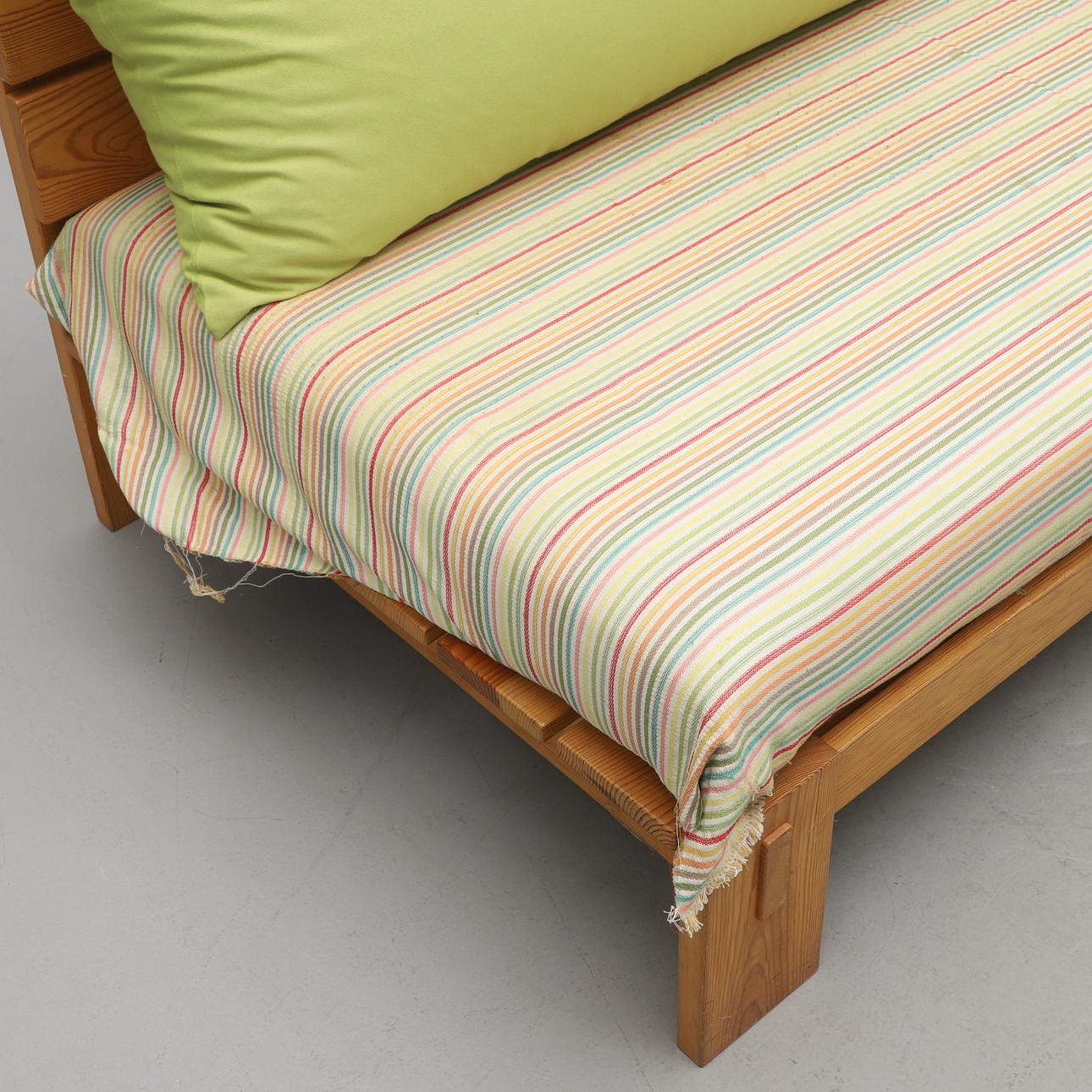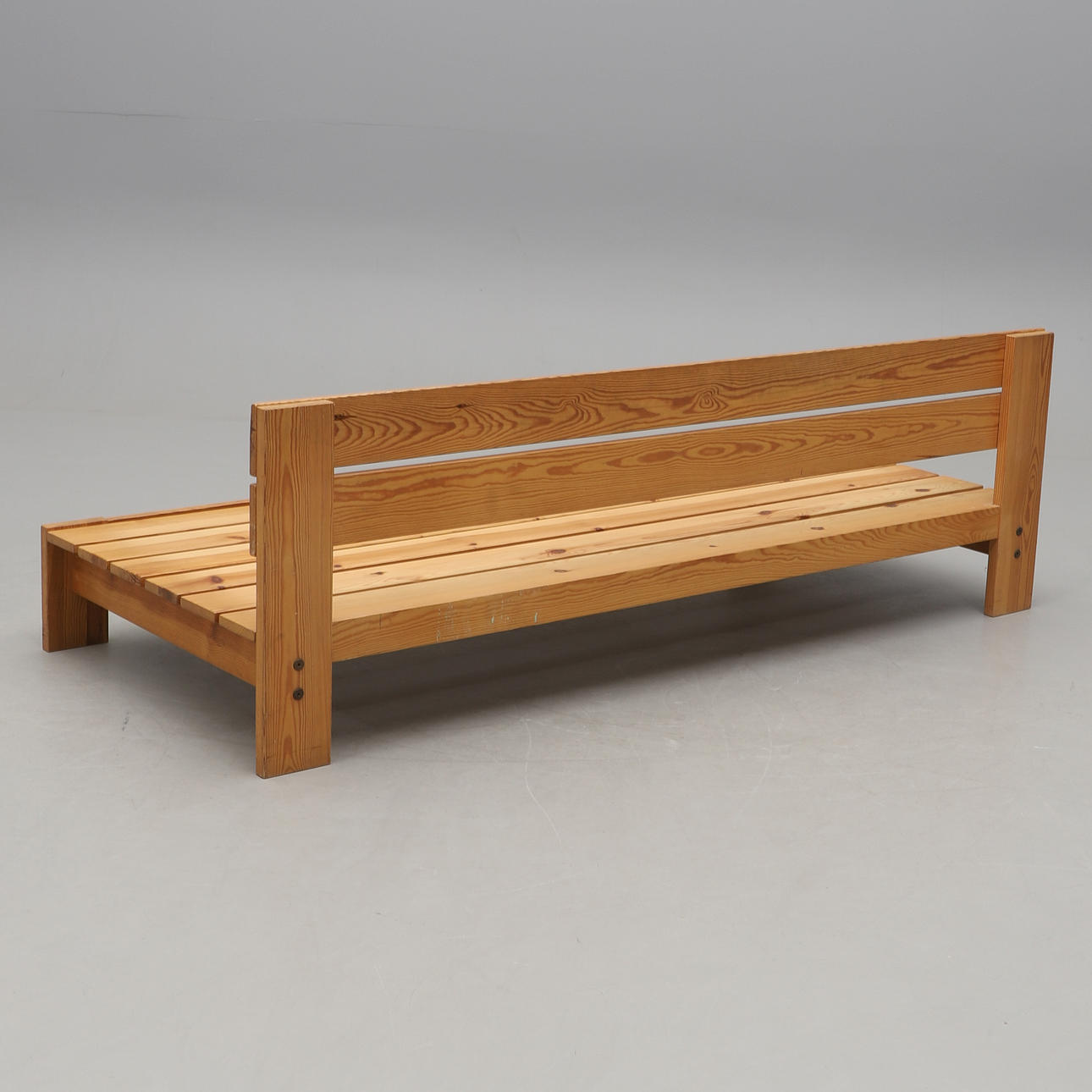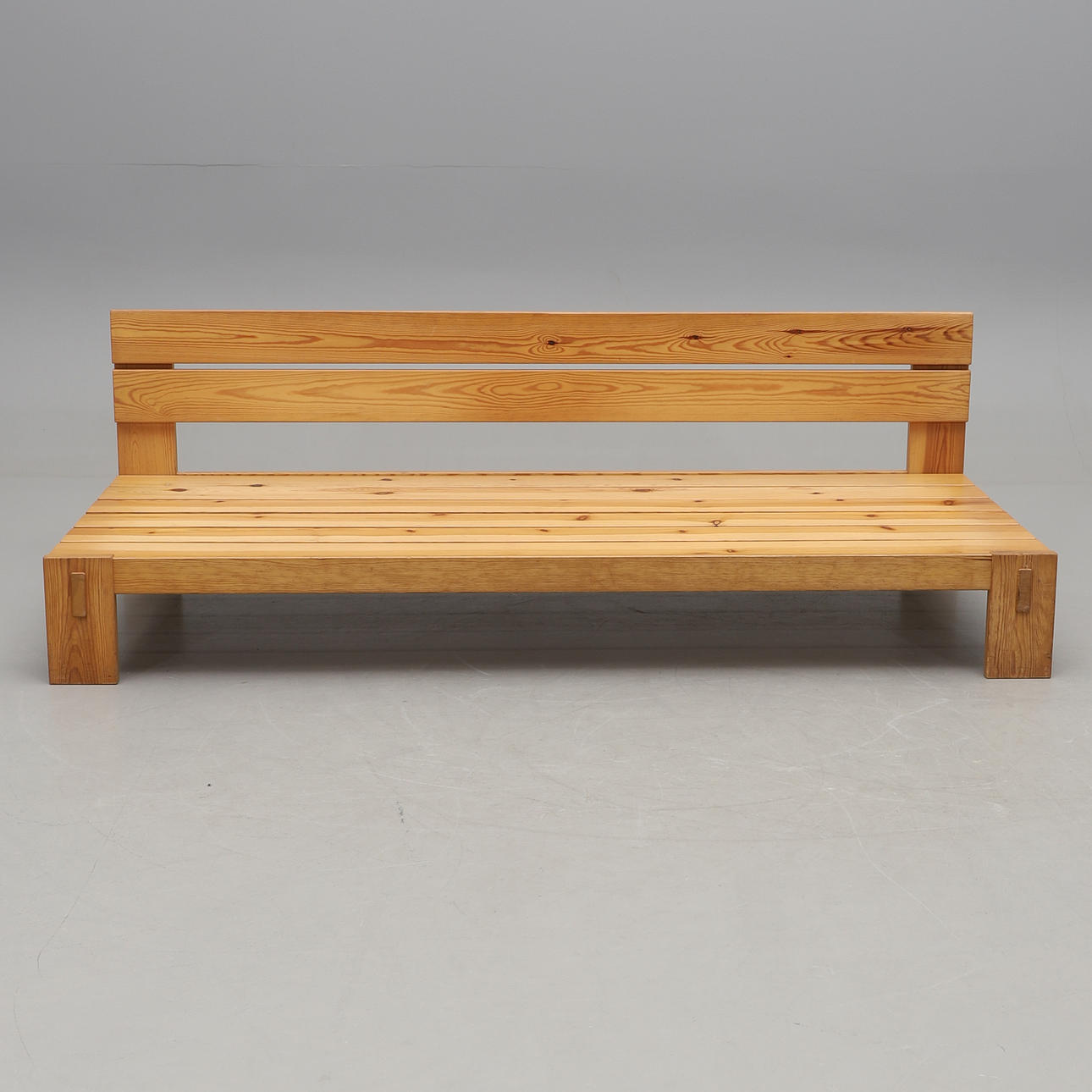 Stomme av furu. Lösa dynor. Längd 195, bredd 85, rygghöjd 62, sitthöjd 40 cm.