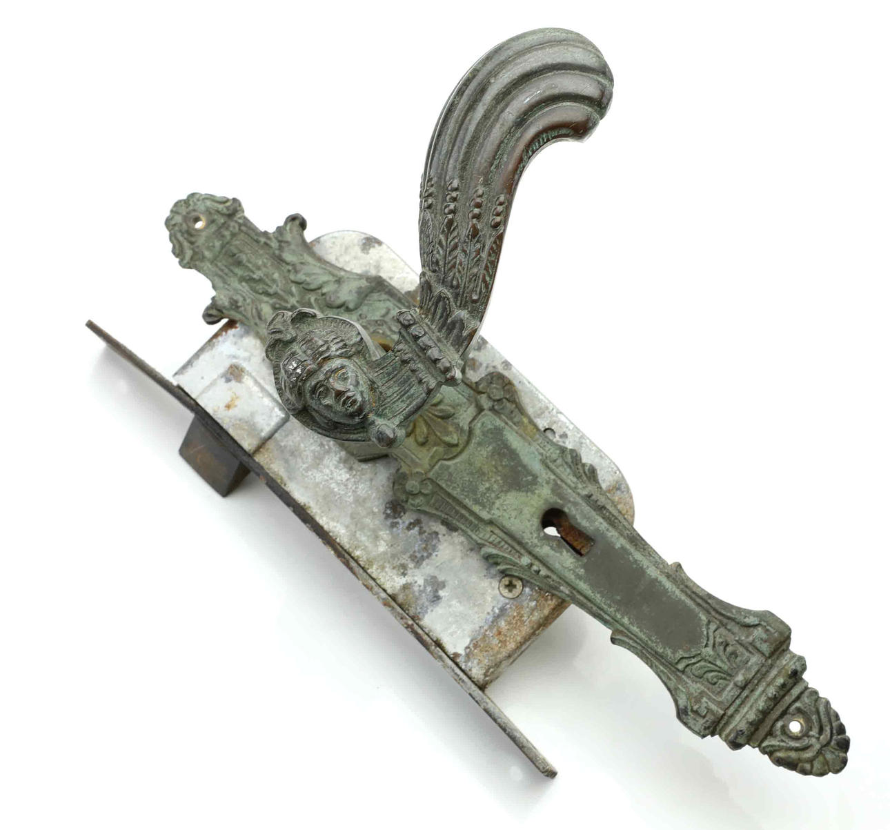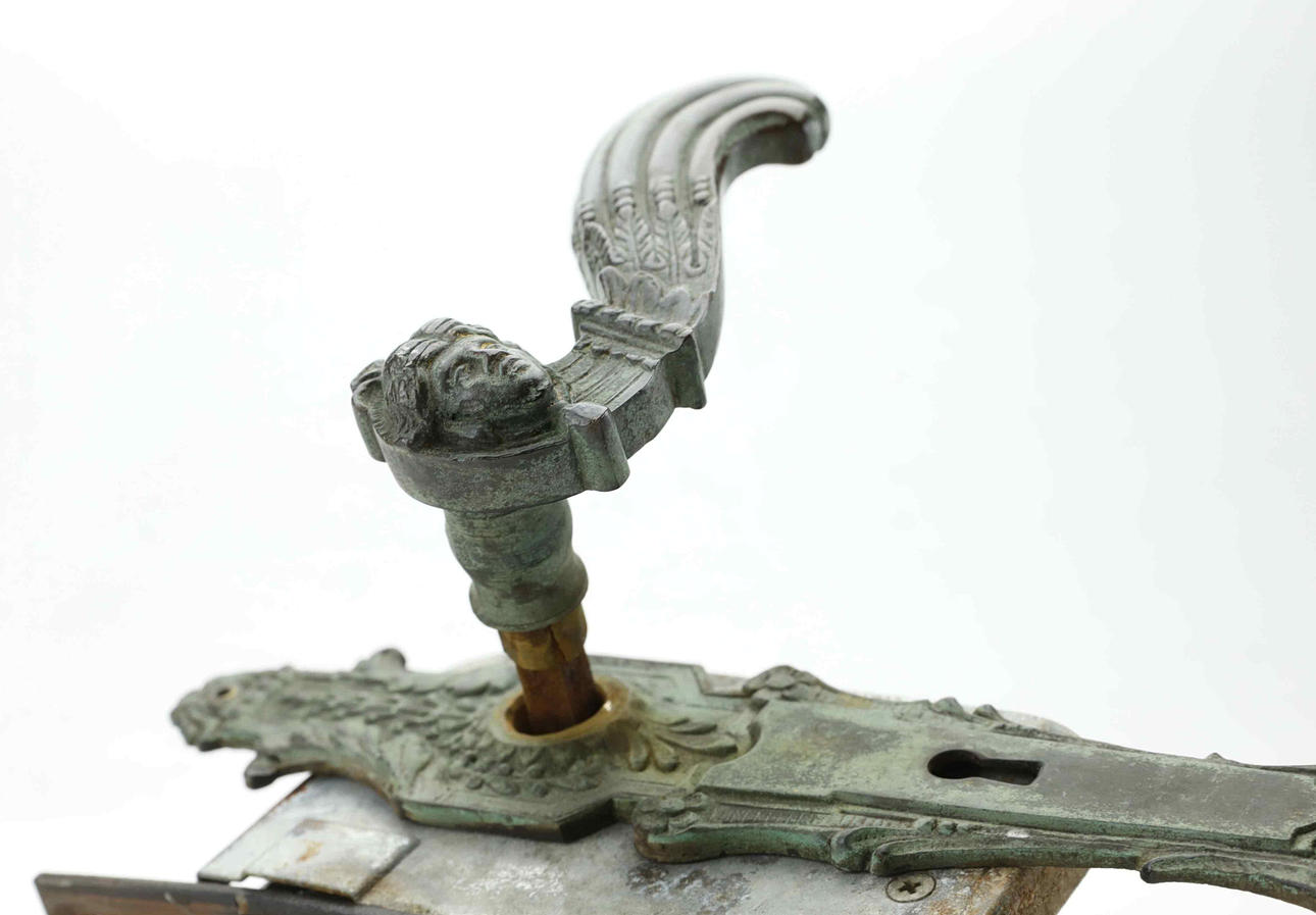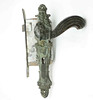 Grönpatinerad gjutjärn. Reliefdekor av kvinna. Beslaget och handtaget: Höjd ca 27 cm Bredd 15 cm.