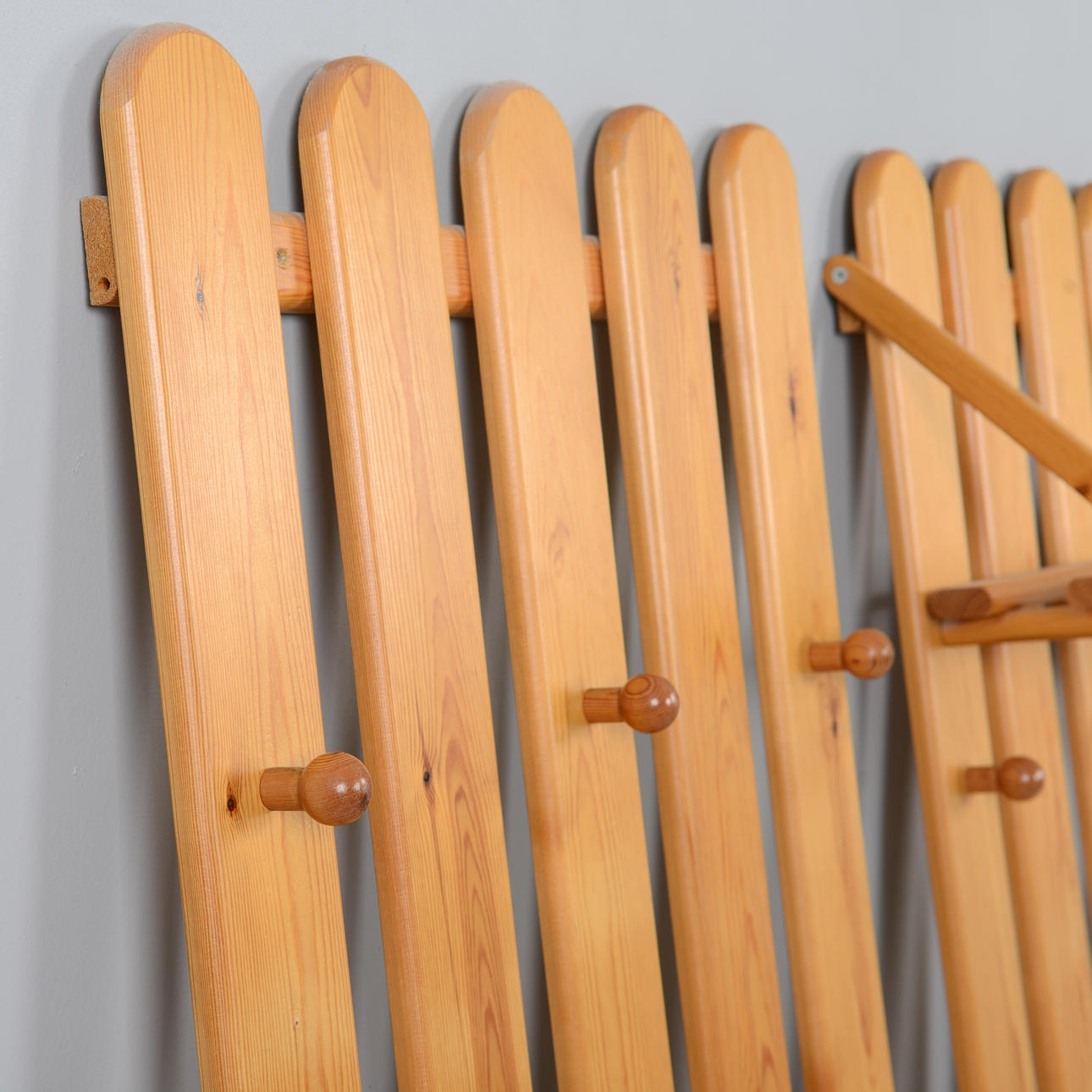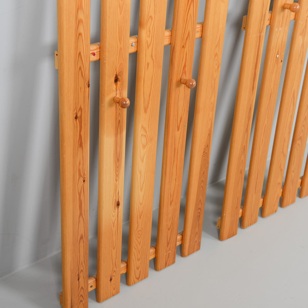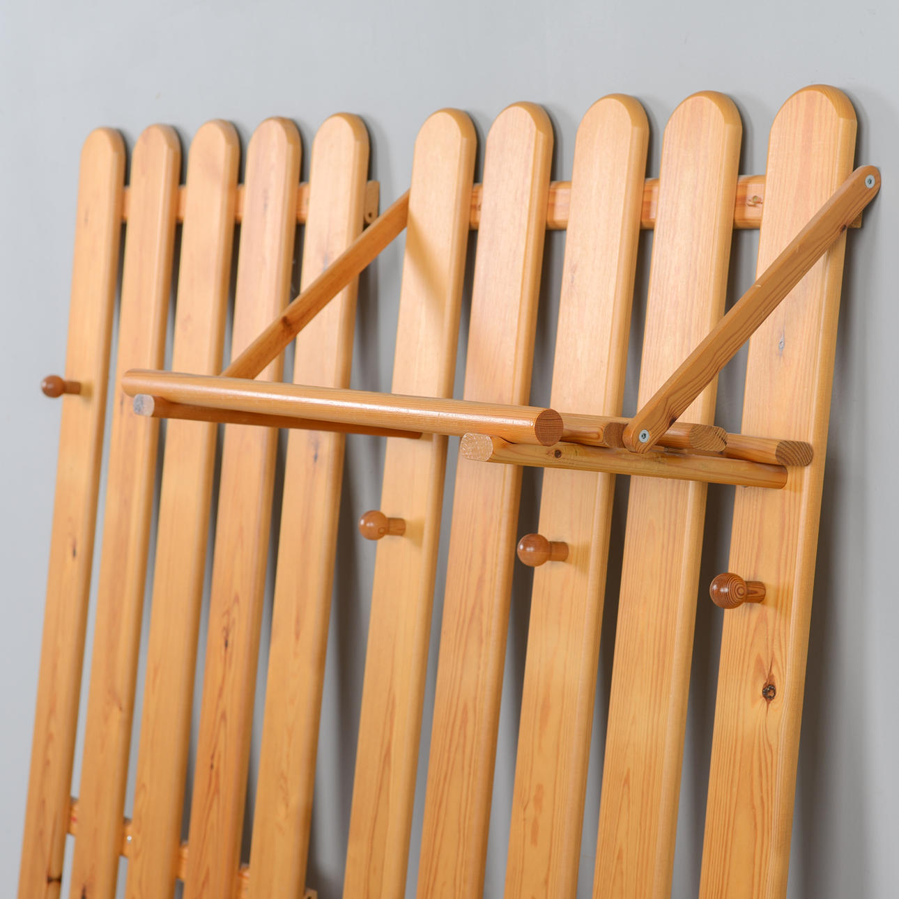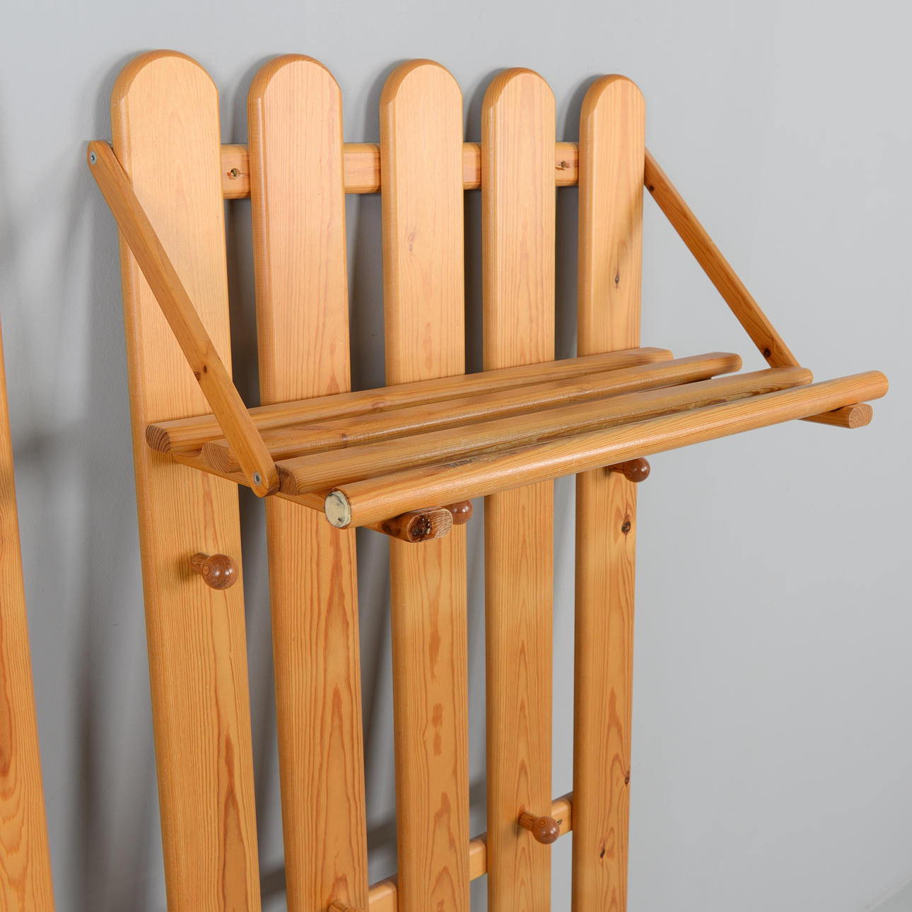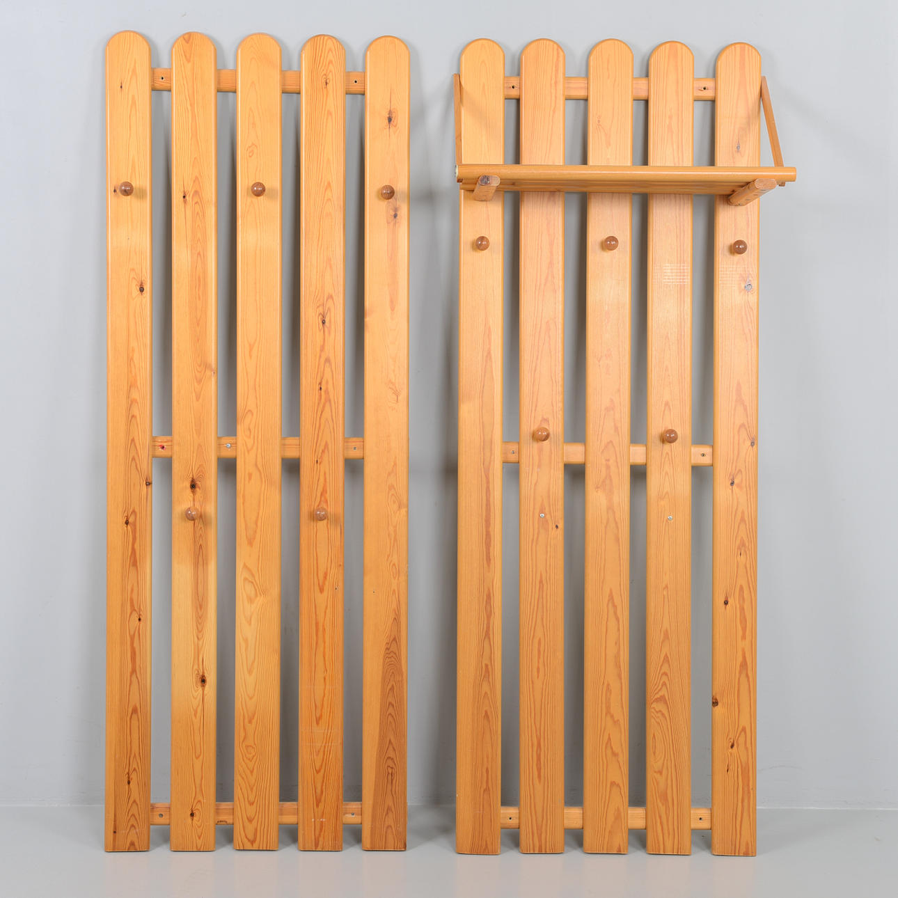 Två klädhängare med hatthylla. Furu. Höjd 163 cm, bredd 63 cm.