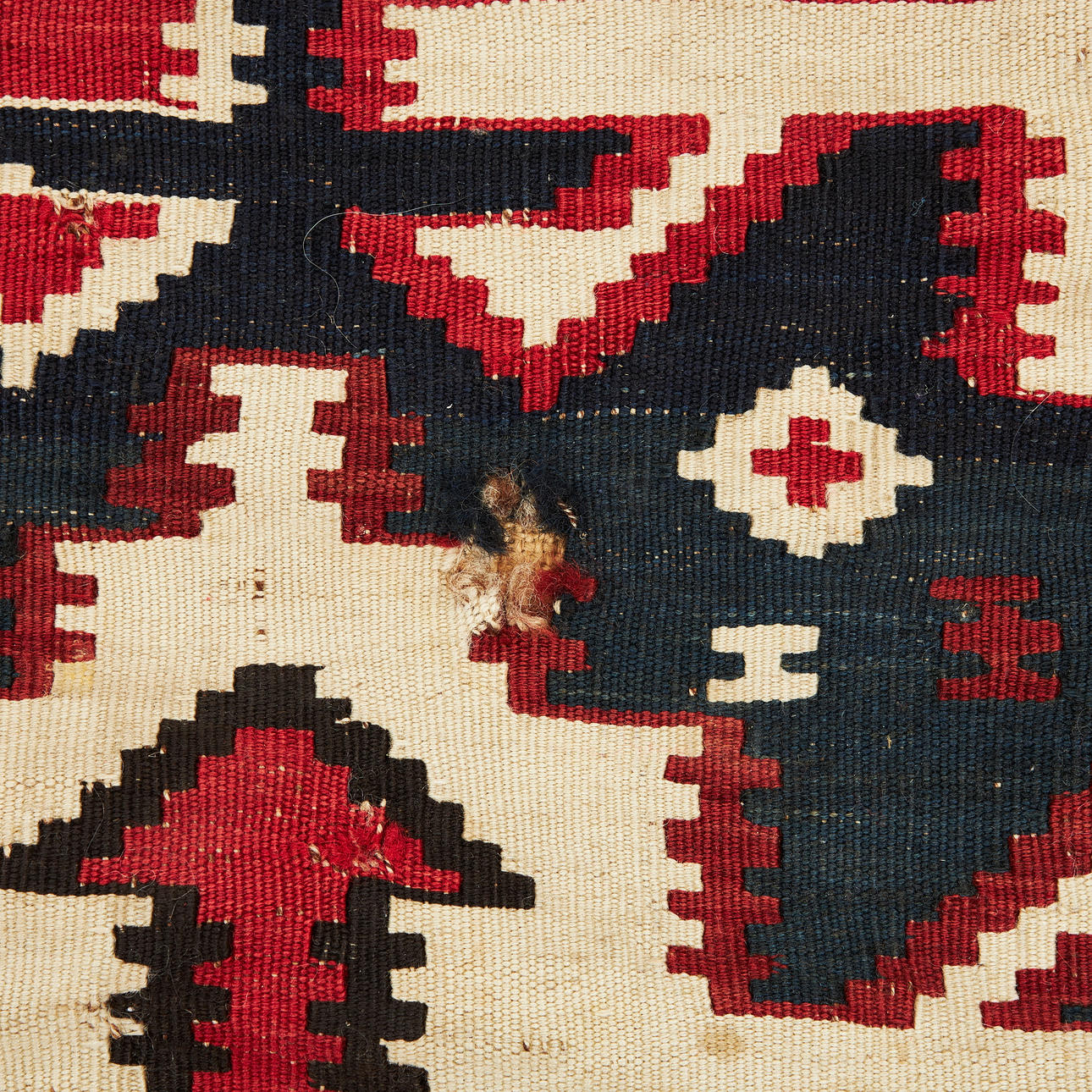 Bruksslitage, skada, fläckar, tidigare lagningar förekommer, uppfodrad på juteväv.