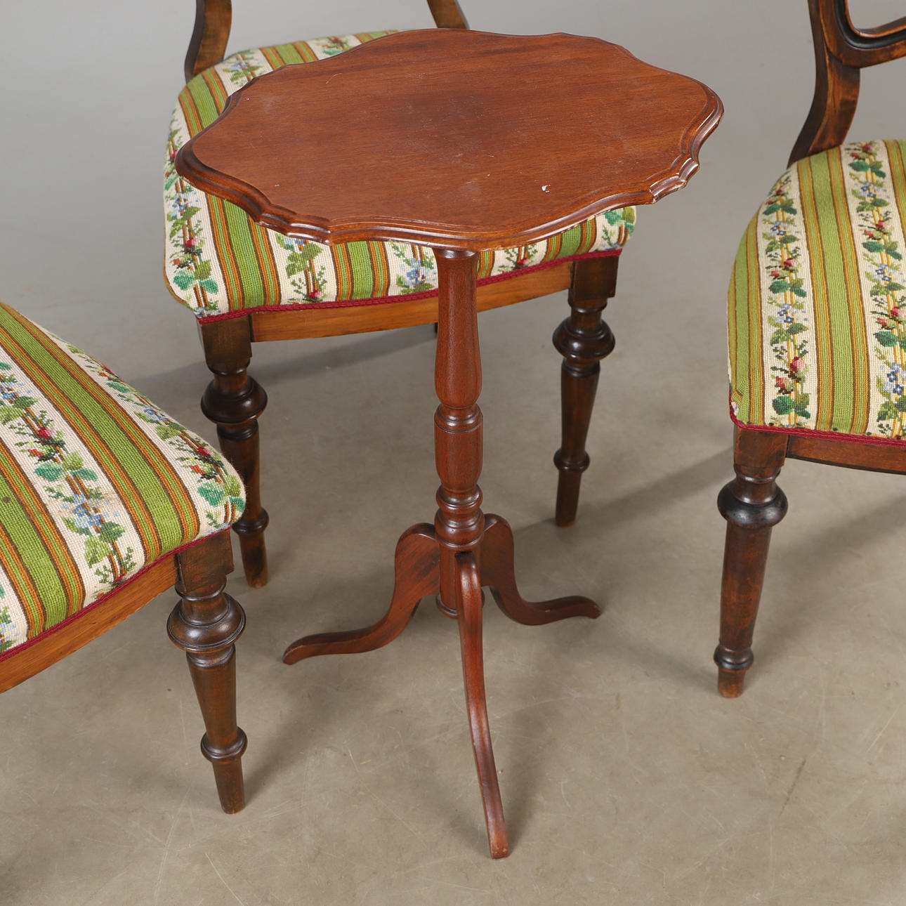 Bordets längd 43, bredd 32, höjd 69 cm Stolarnas längd 46, bredd 44, höjd 89 cm.