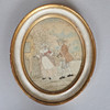 Det ovala broderiet som föreställer uppvaktande par, i en oval och glaserad ram, skrivet med bläck a tergo ”Edith S. Saround? 1885', 26cm hög, 22cm bred.