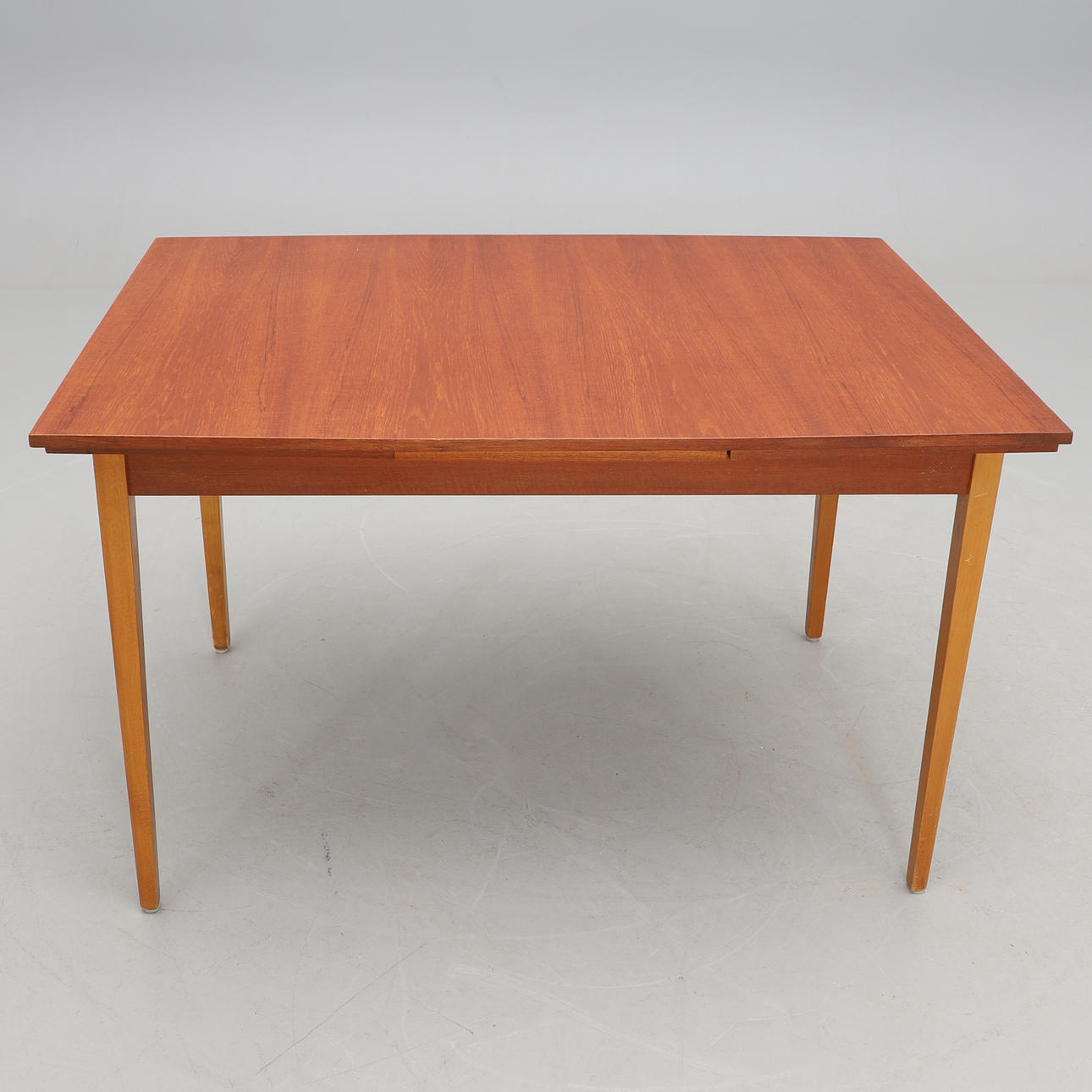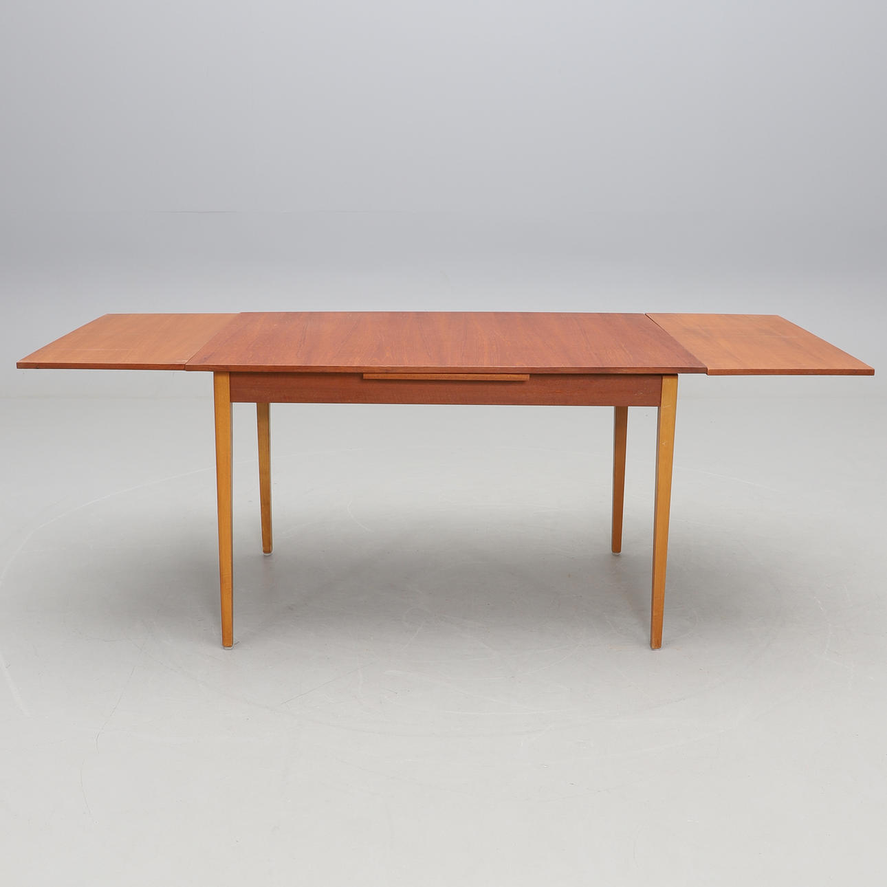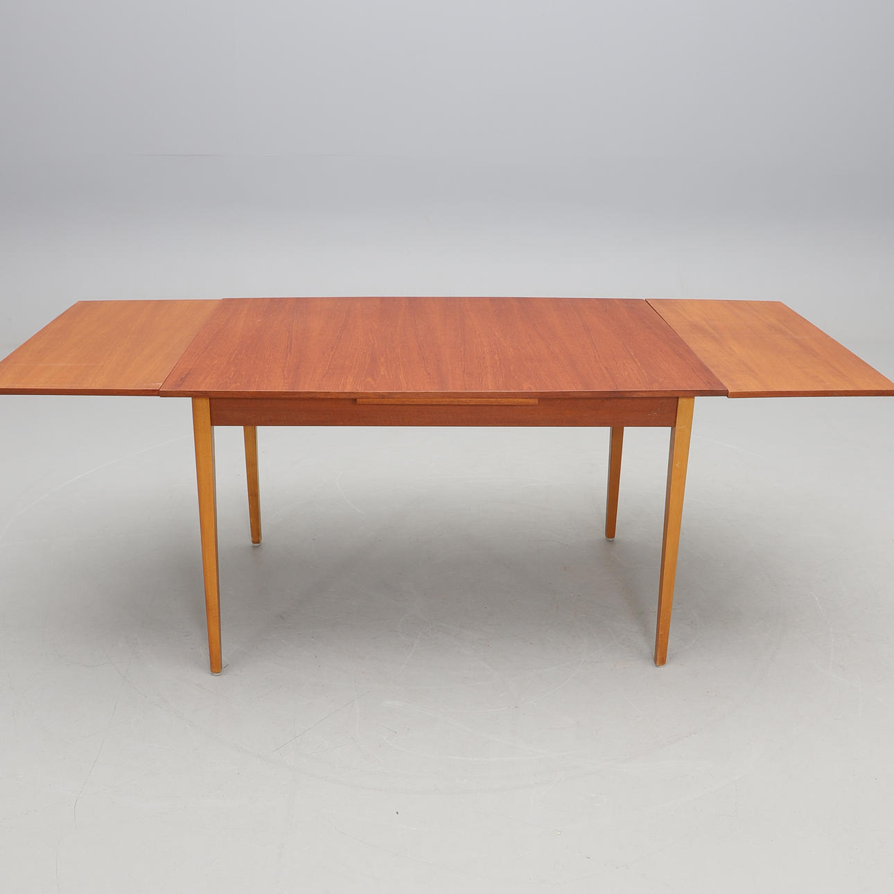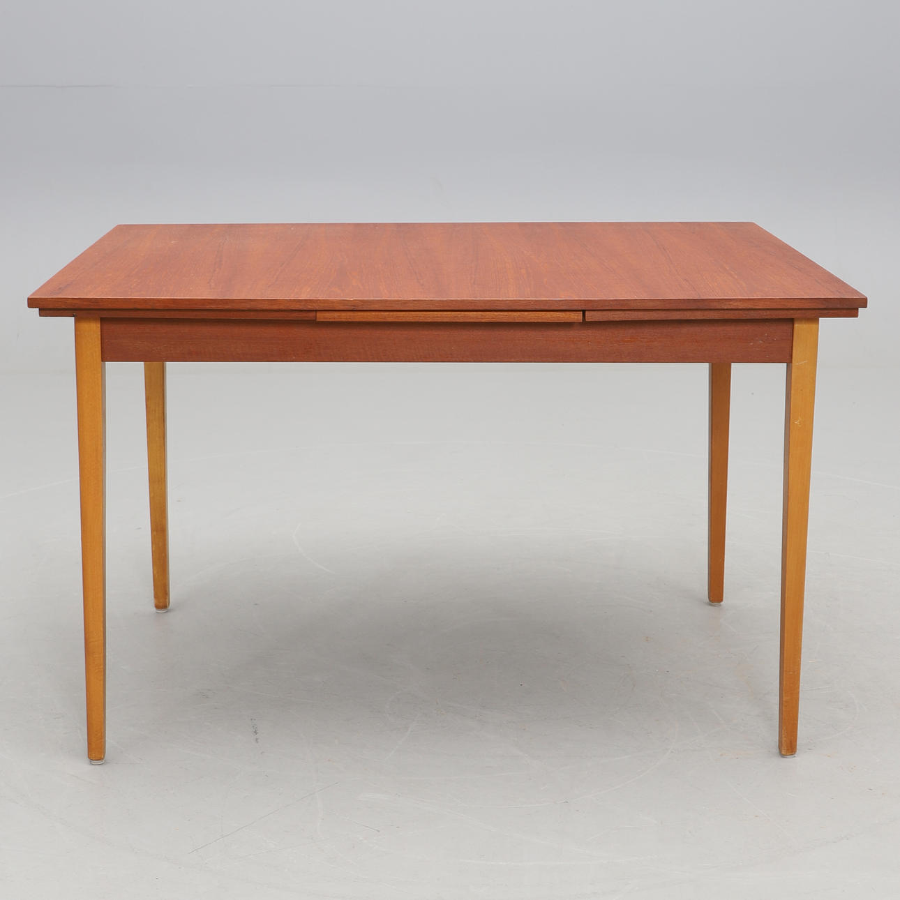 Skiva med två utdragbara skivor (längd 40 cm). Fanerad i teak. Ben i bok. Längd 121 cm. Bredd 85 cm.