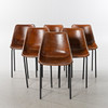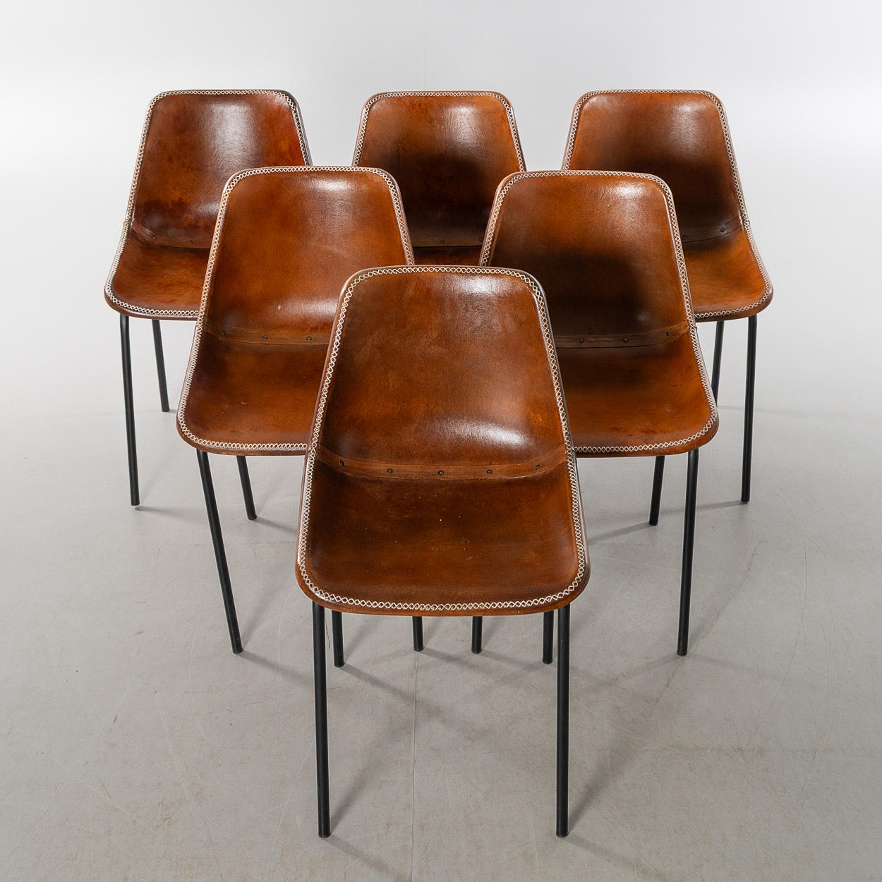 4342114. STOLAR, 6 st, formpressade, läderimitation och metallunderrede.