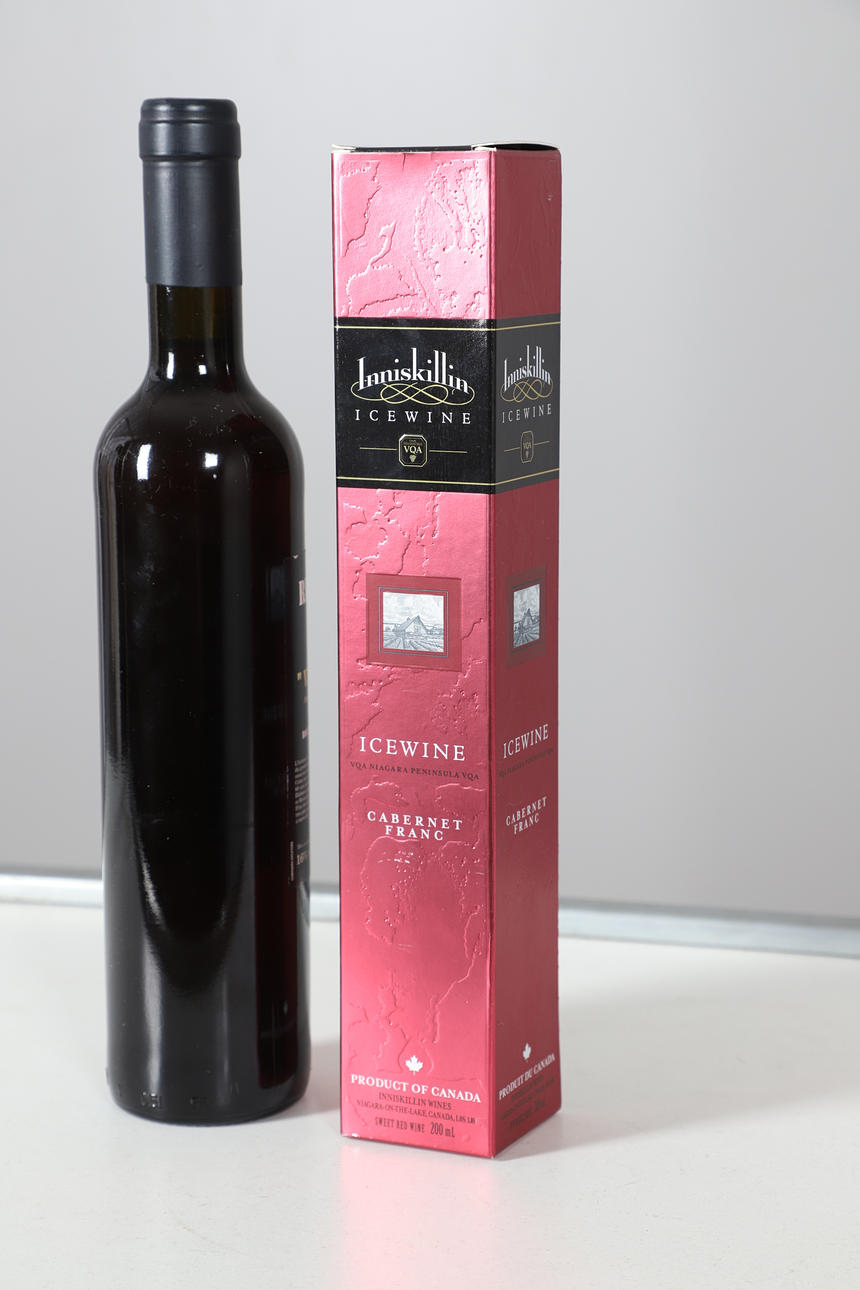 Inkludera en flaska Rivesaltes 1945 ”Vieil Homme” vin (höjd 30 cm) och en låda med Inniskillin Ice vin Cabernet Franc. (2).