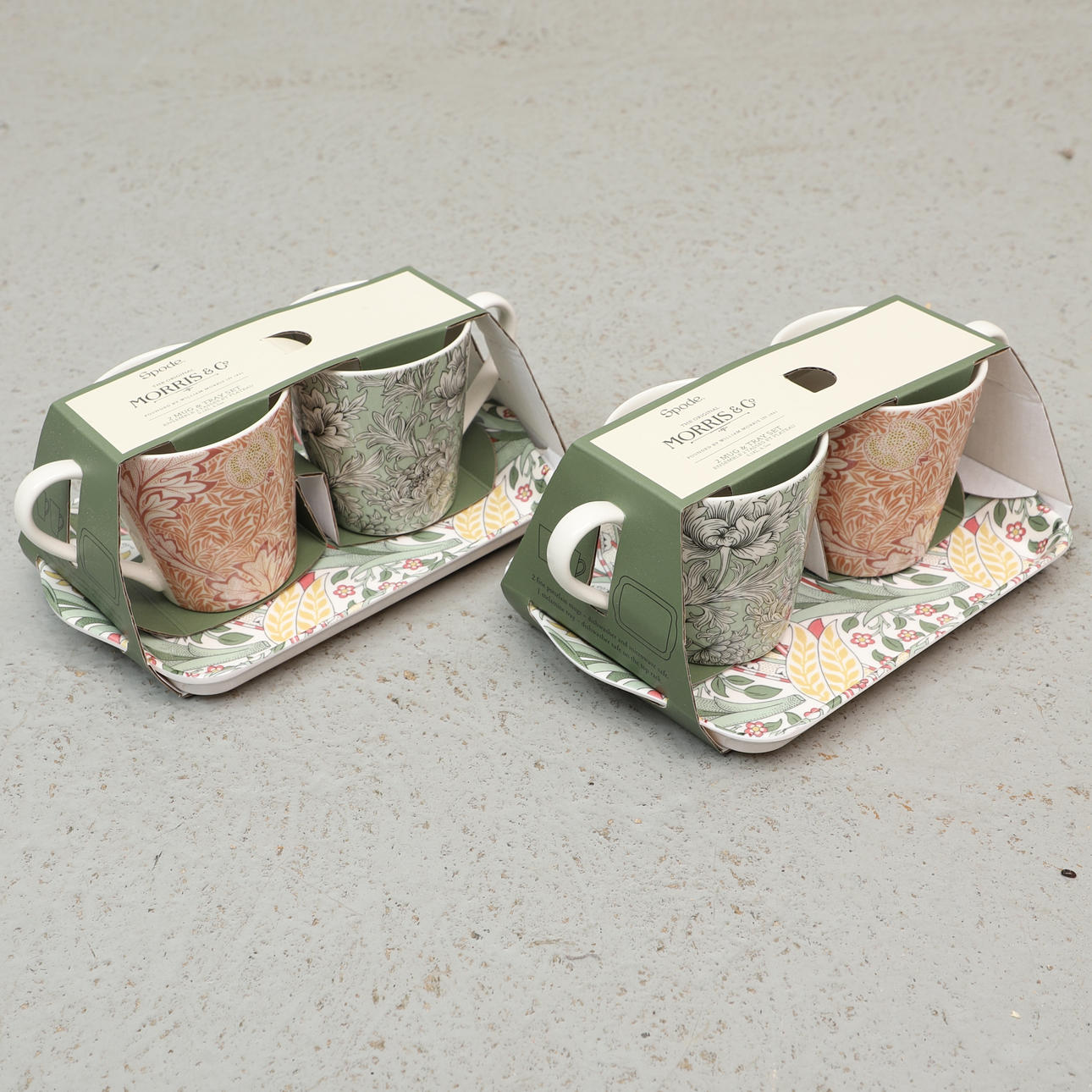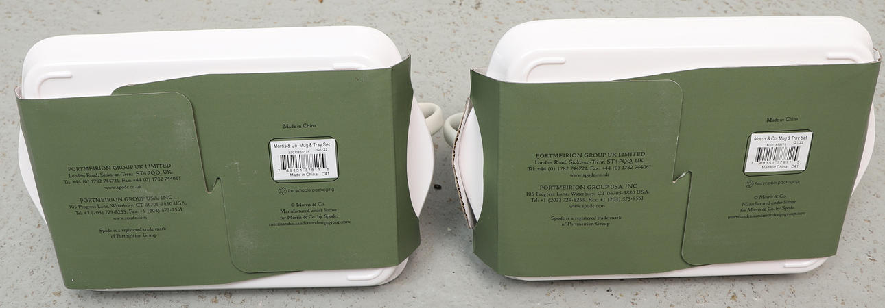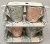 4 st muggar, porslin, höjd ca 8 cm. 2 st brickor, melanin, ca 14,5x20 cm.