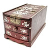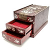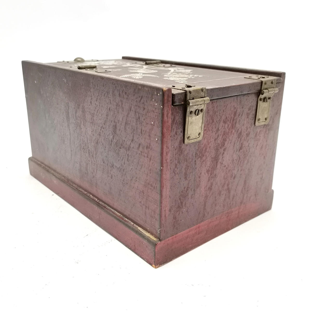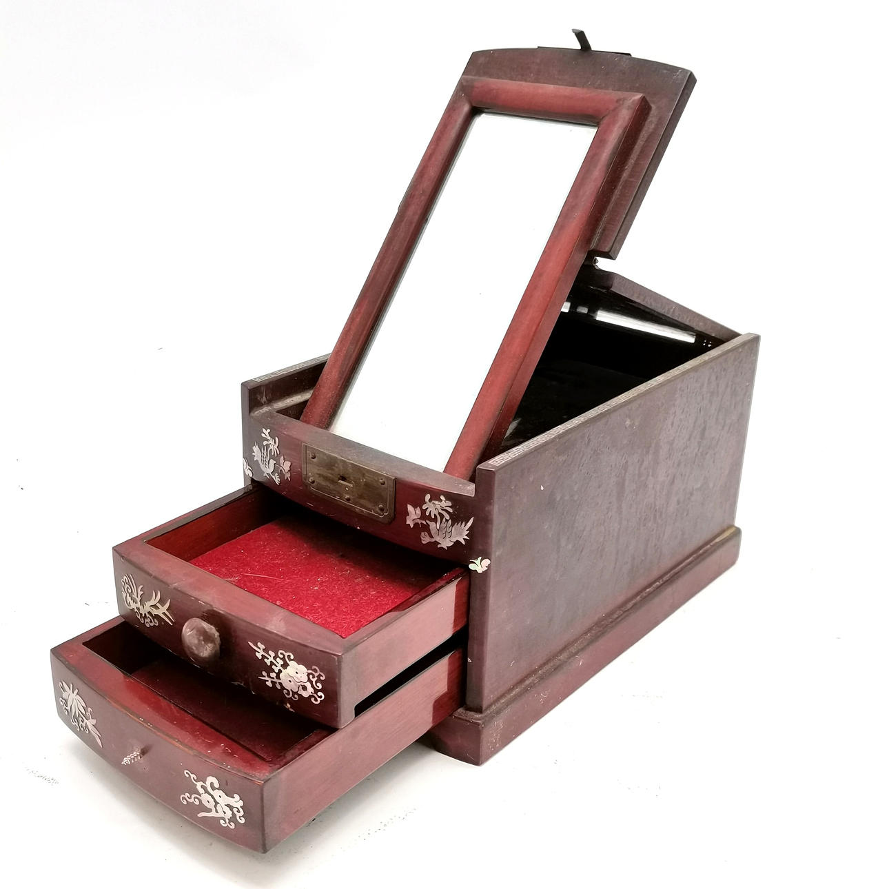 Orientalisk kinesisk smyckes/sminkbox med gångjärnslock som avslöjar fasad spegel och pärlemordetalj - 24cm x 14cm x 13cm hög.