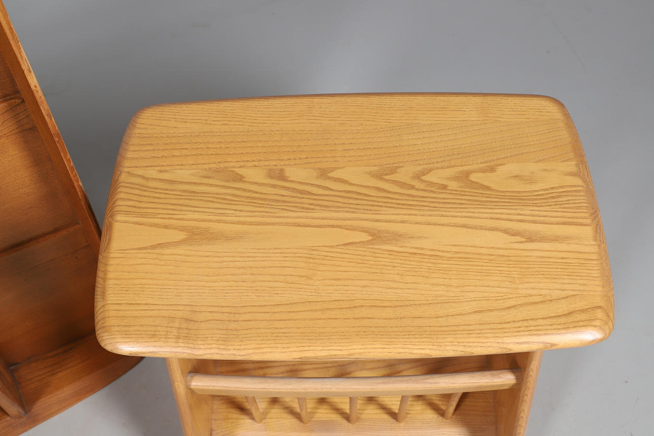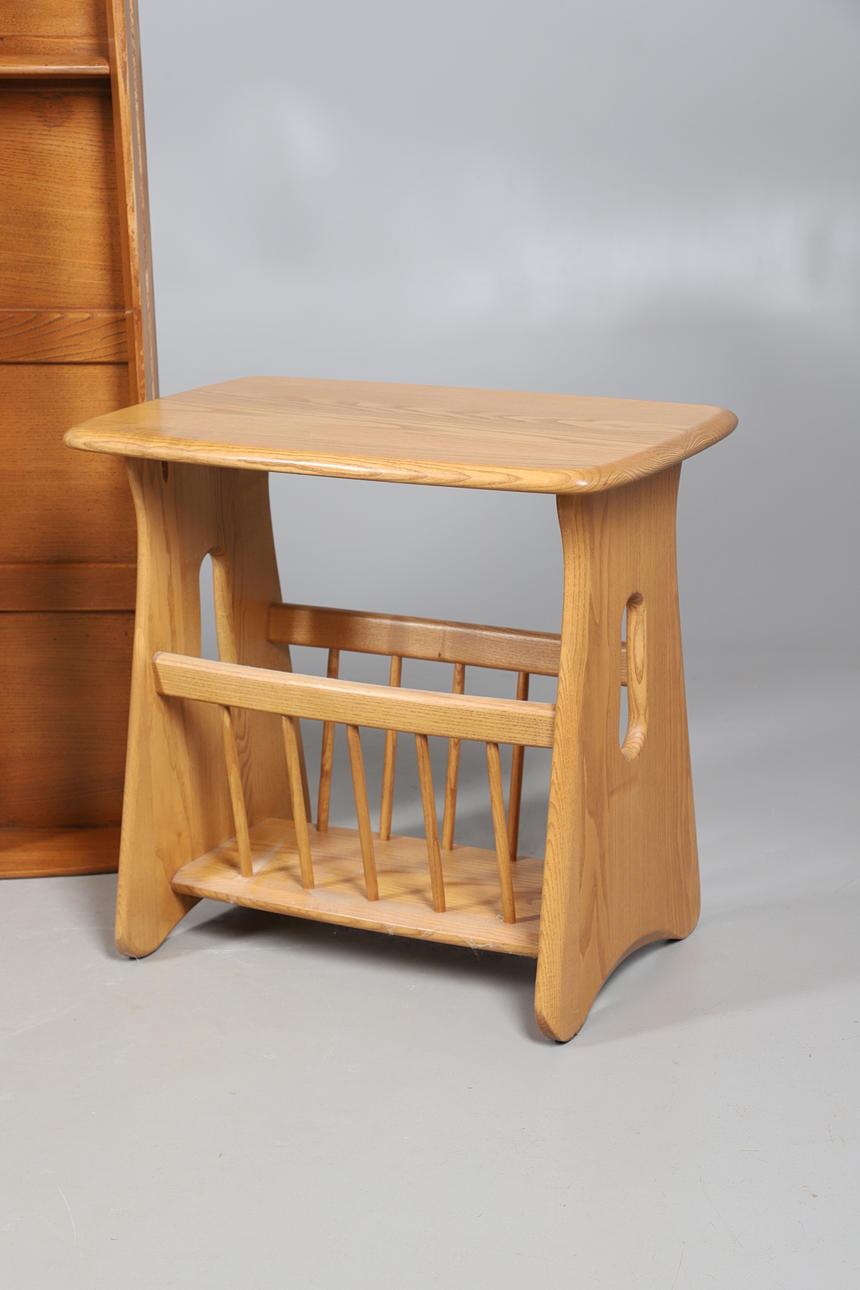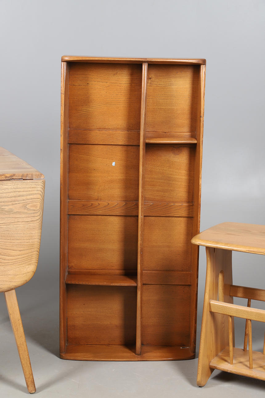 Ett blandat parti inklusive ett vintage ljust alm-köksbord med utsträckta ben (topp 135 cm x 74 cm förlängt, blekt), ett modernt Ercol magasinställ (54 cm x 35 cm, 50,5 cm högt) och ett Ercol väggmonterat tallriksställ (106 cm tvärs). (3).