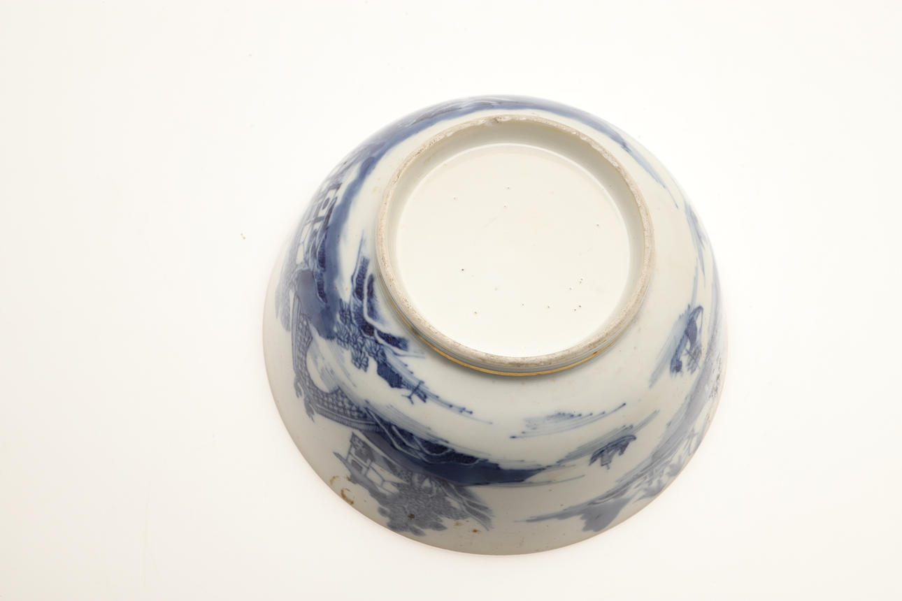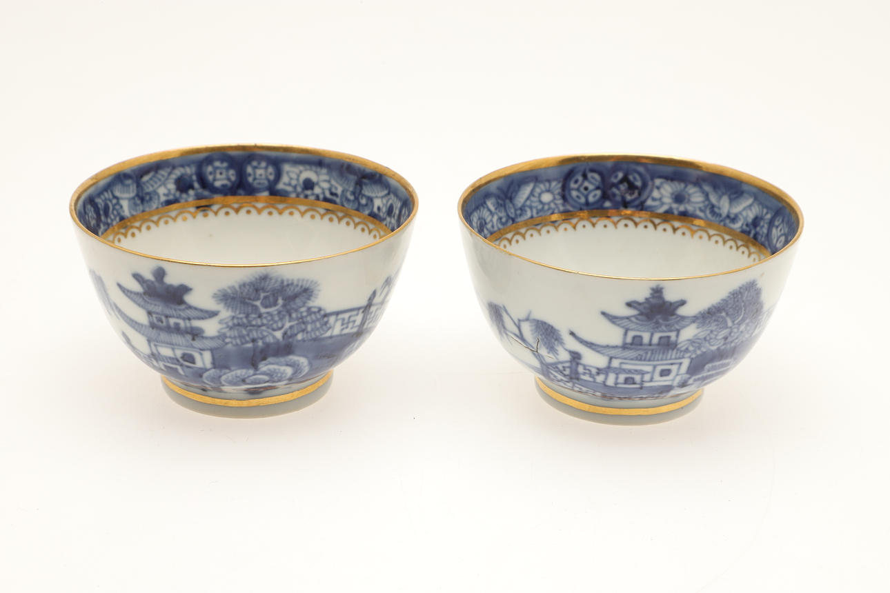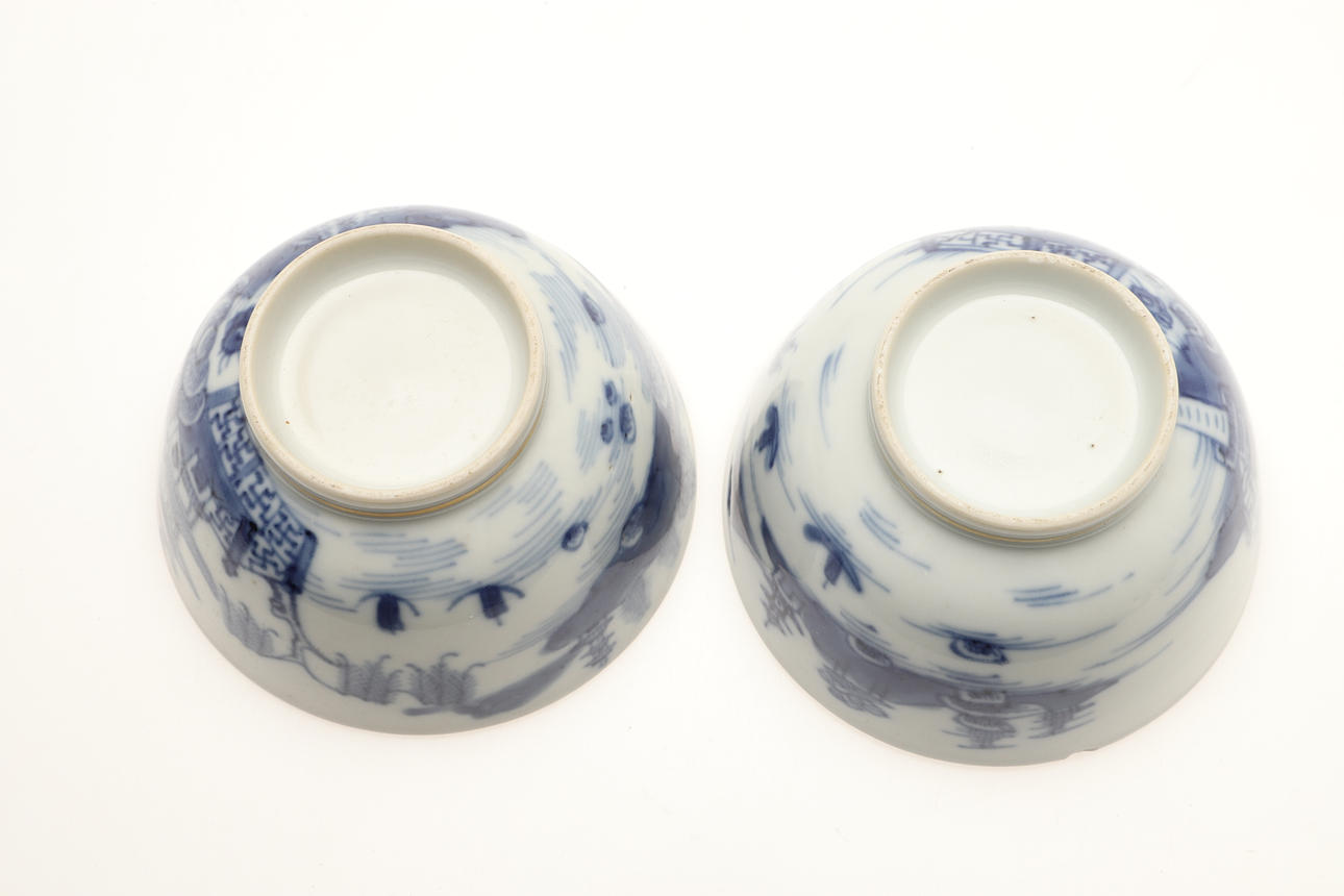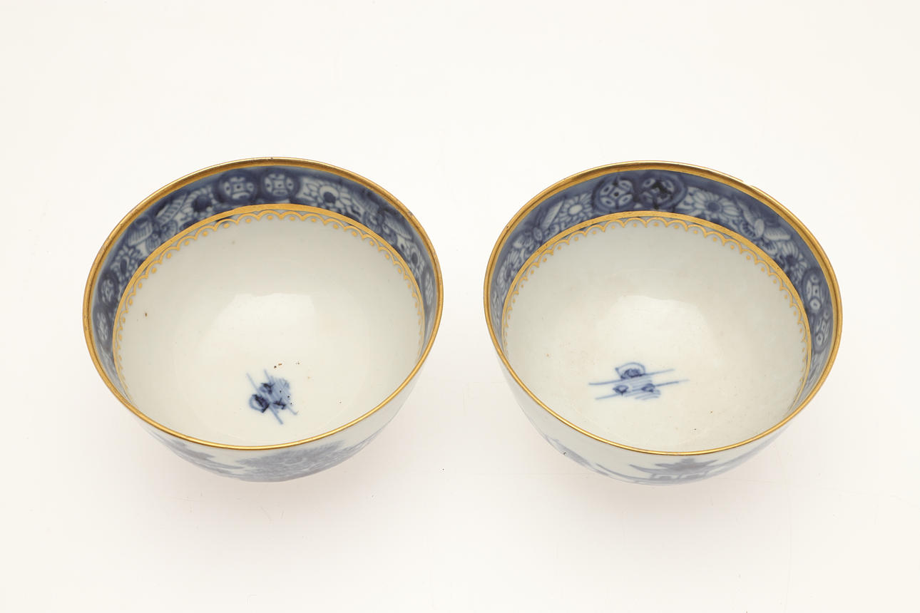 Ett fat trasigt och häftklammerat reparerat. En teskål med hårfäste vid kanten. En teskål med platt chip på kanten. Vissa missfärgningar, fritting och glasyrfel hela tiden.