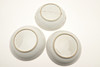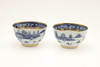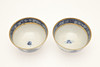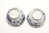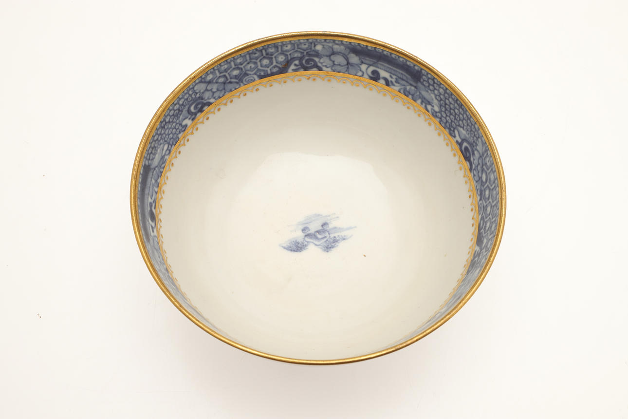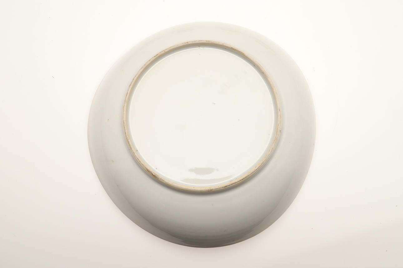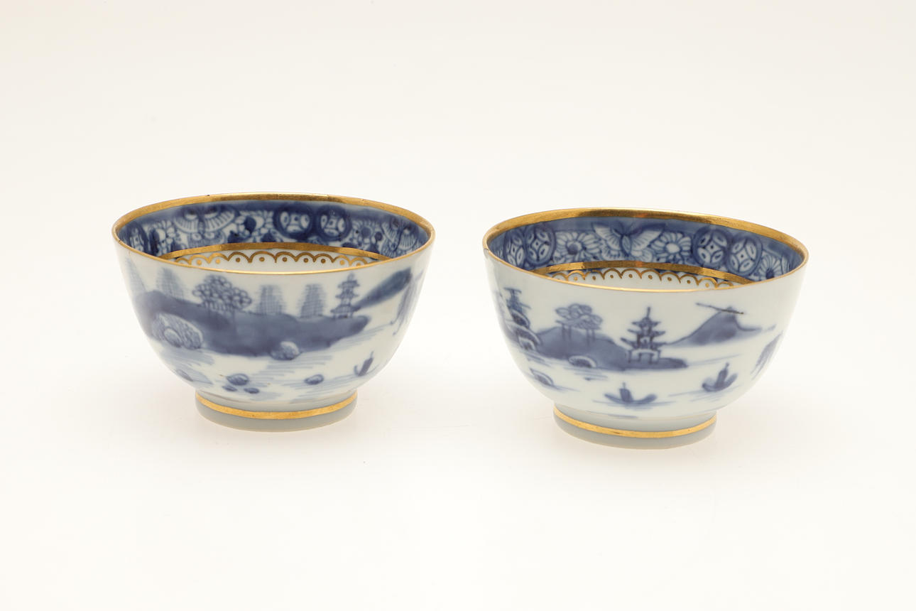 Ett fat trasigt och häftklammerat reparerat. En teskål med hårfäste vid kanten. En teskål med platt chip på kanten. Vissa missfärgningar, fritting och glasyrfel hela tiden.