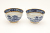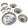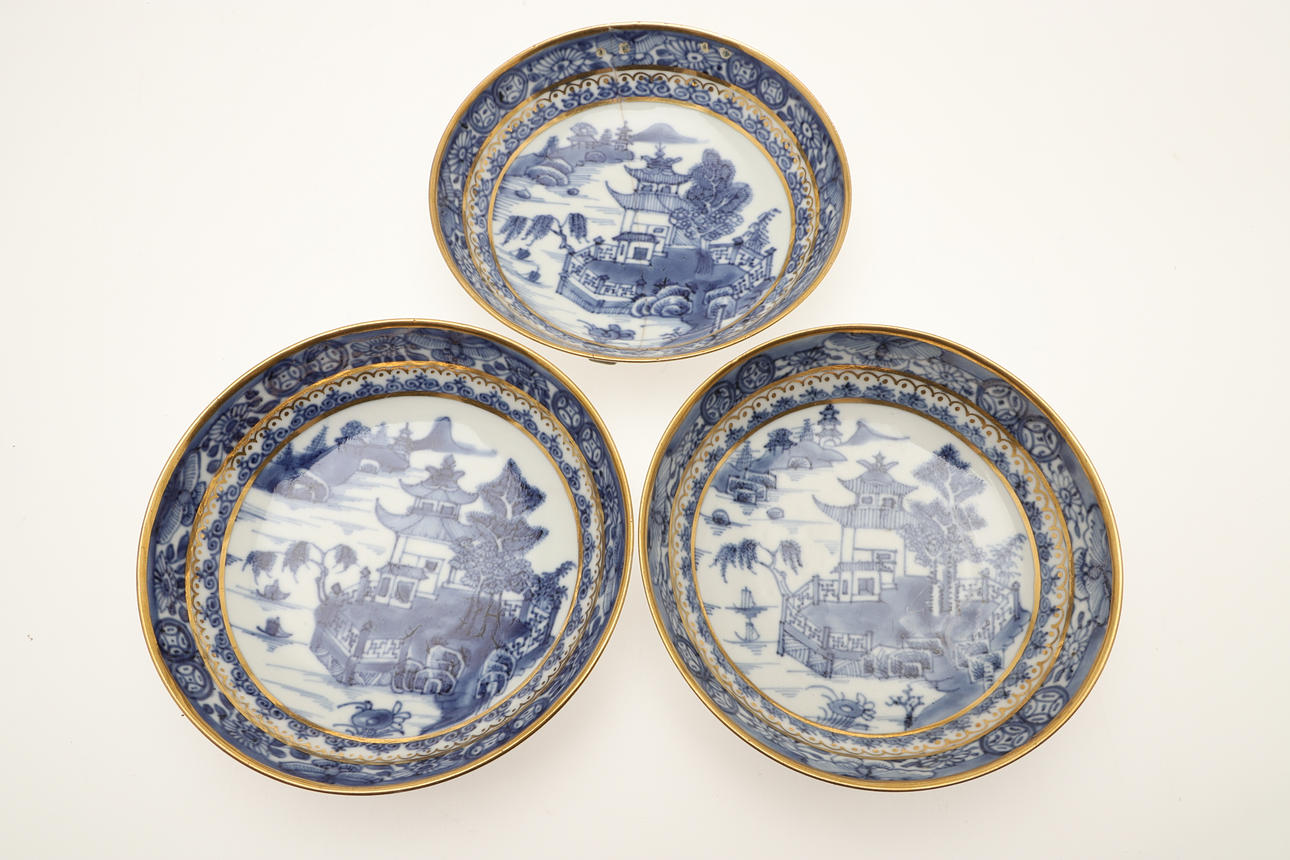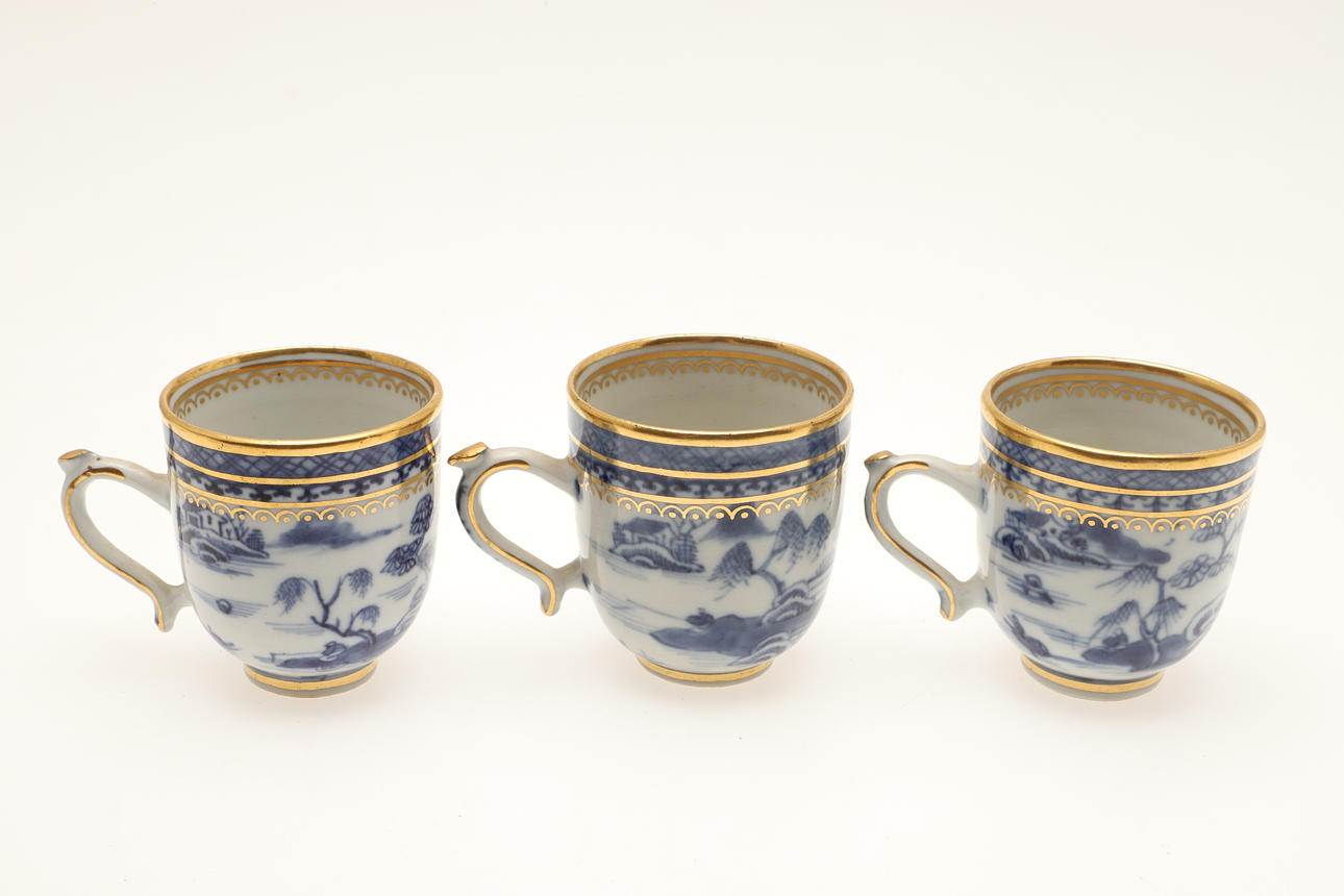 att inkludera tre kaffeburkar, två teskålar, tre fat, en fatfat och en slutskål, var och en målad med underglasyrblå dekoration, förgylld linje kant, omärkt, fatfatfatet 20,5 cm diameter (10).