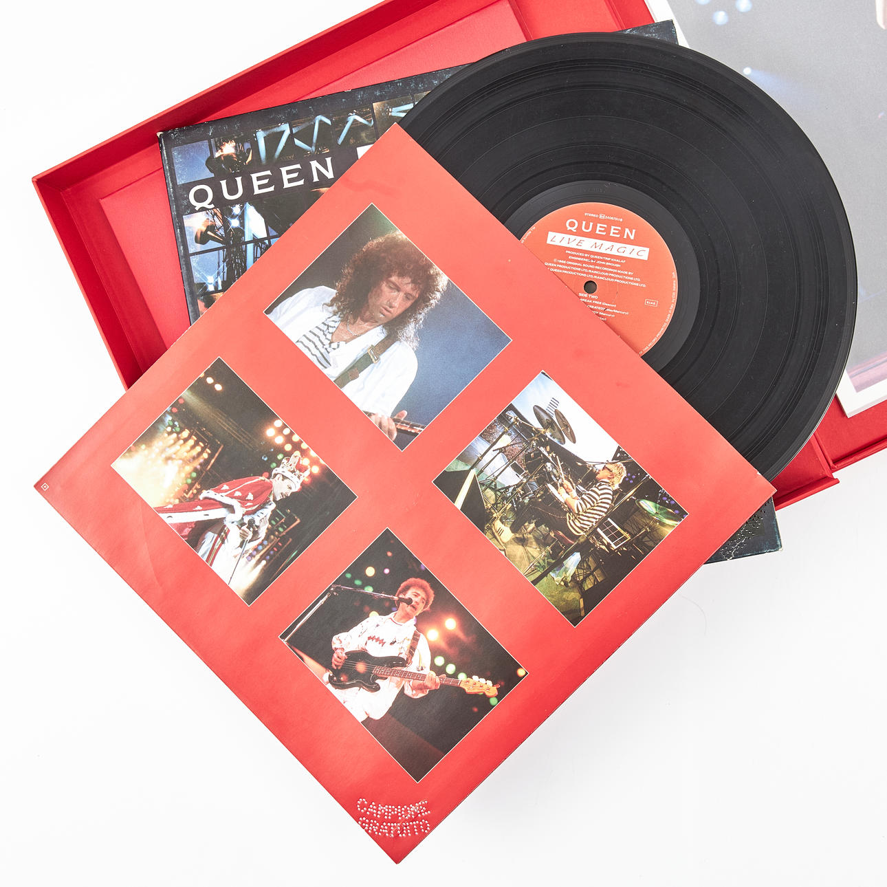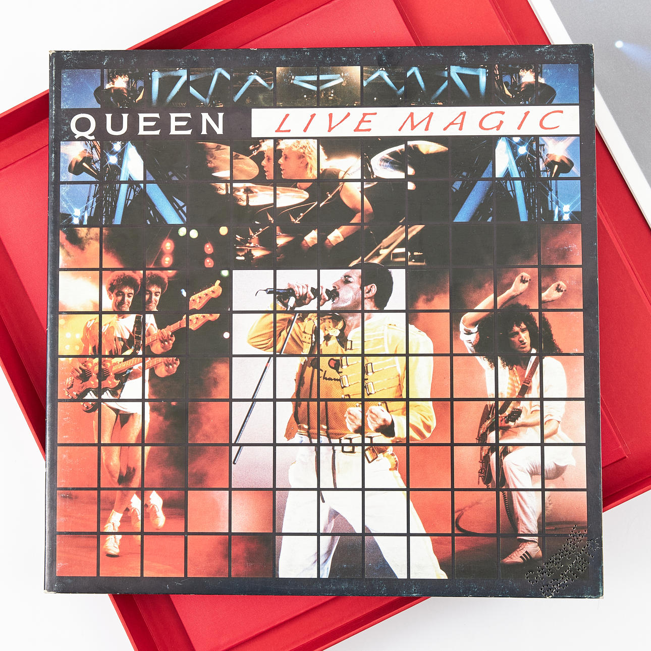 Solander box nr 70/100, 36 x 36 x 5 cm. Innehåller Lp "Queen LIVE MAGIC", 1 st C-print 30 x 30 cm samt en bok "Queen - the last tor av Torleif Svensson.