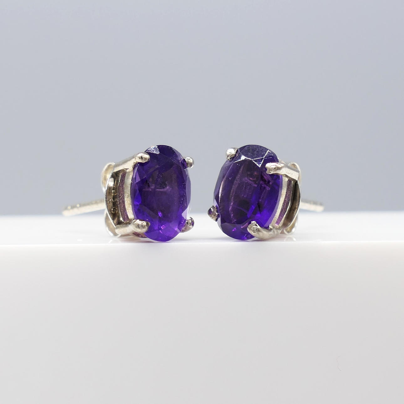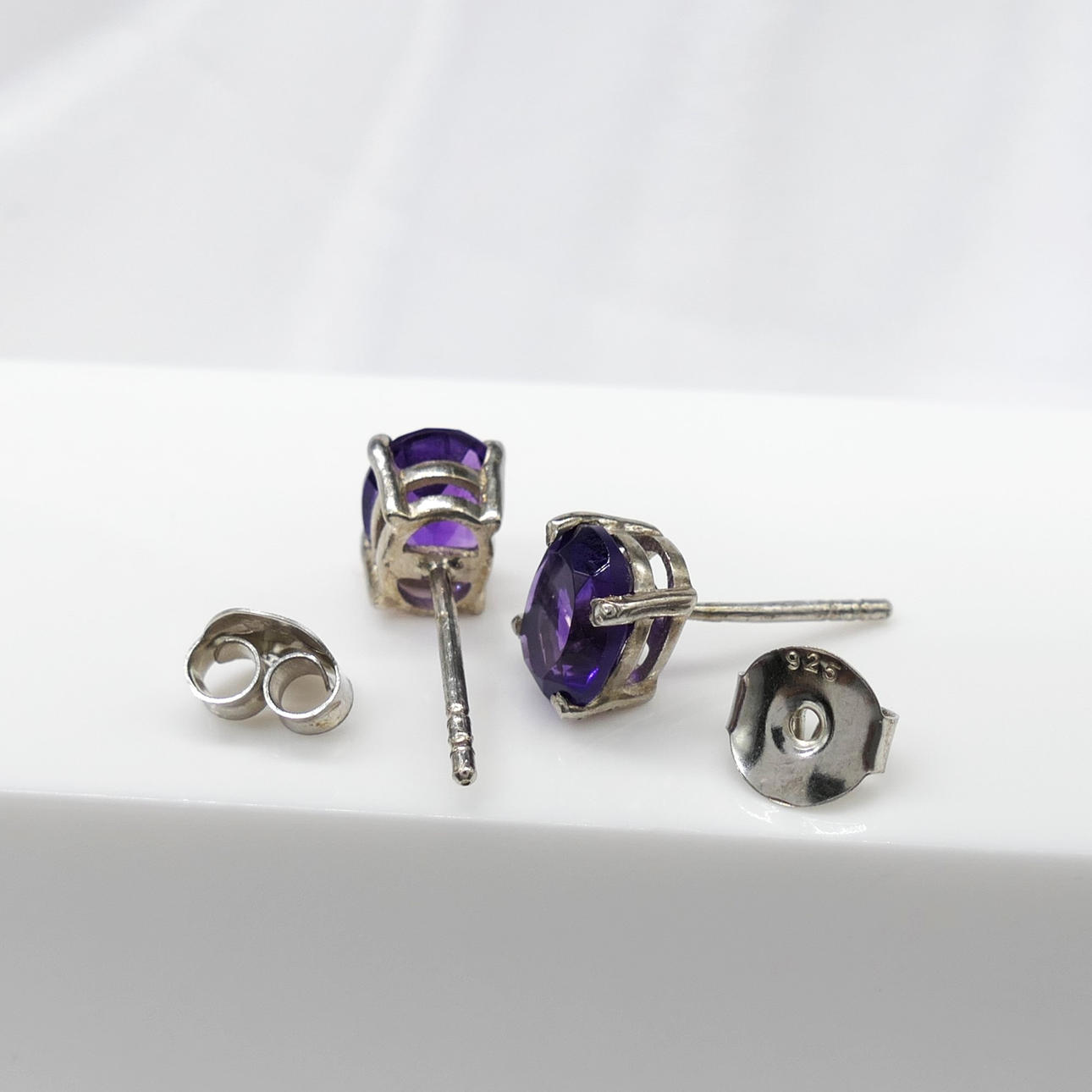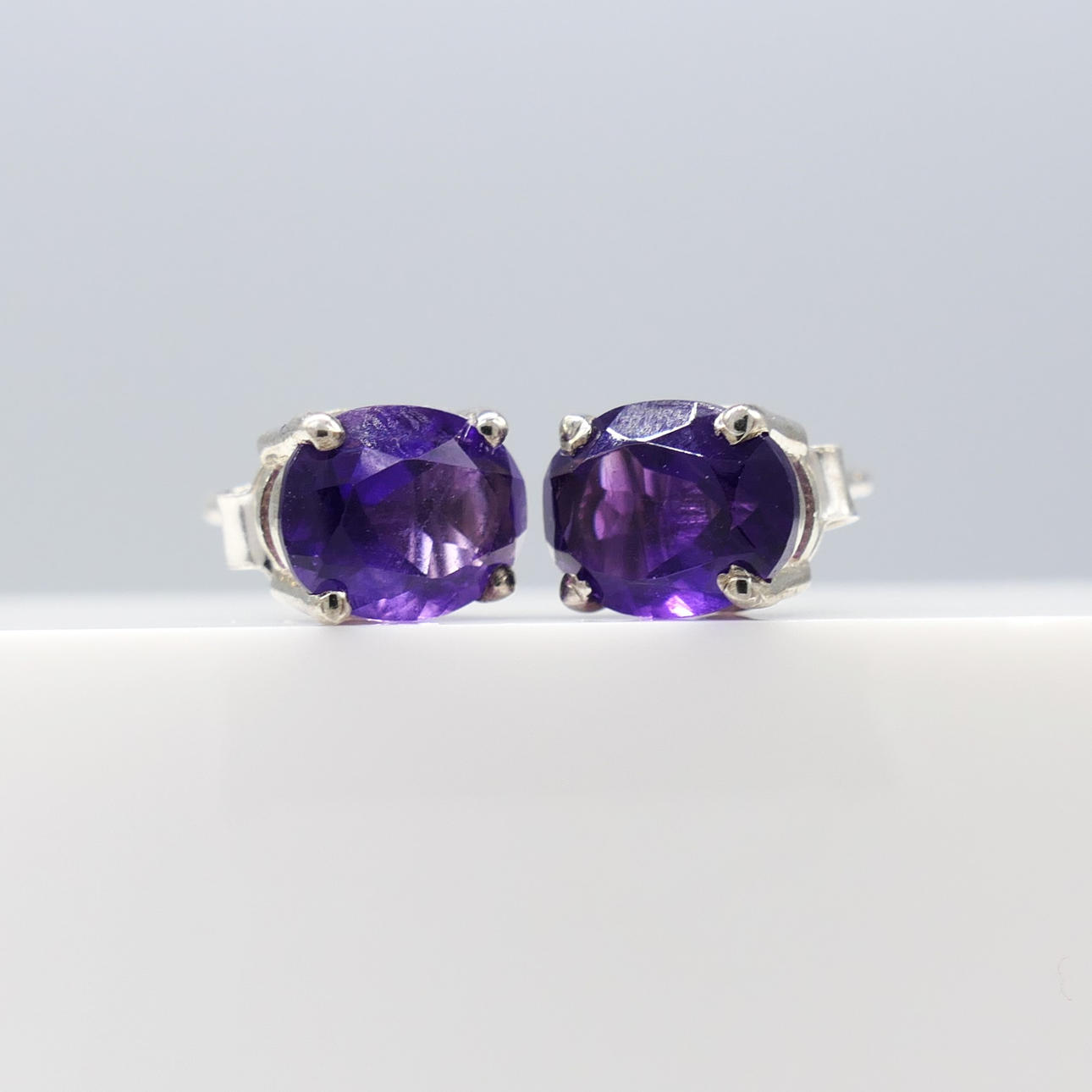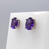 Ett par örhängen i silver av naturlig ametist ädelsten, försedda med fjärilsrygg