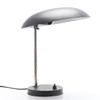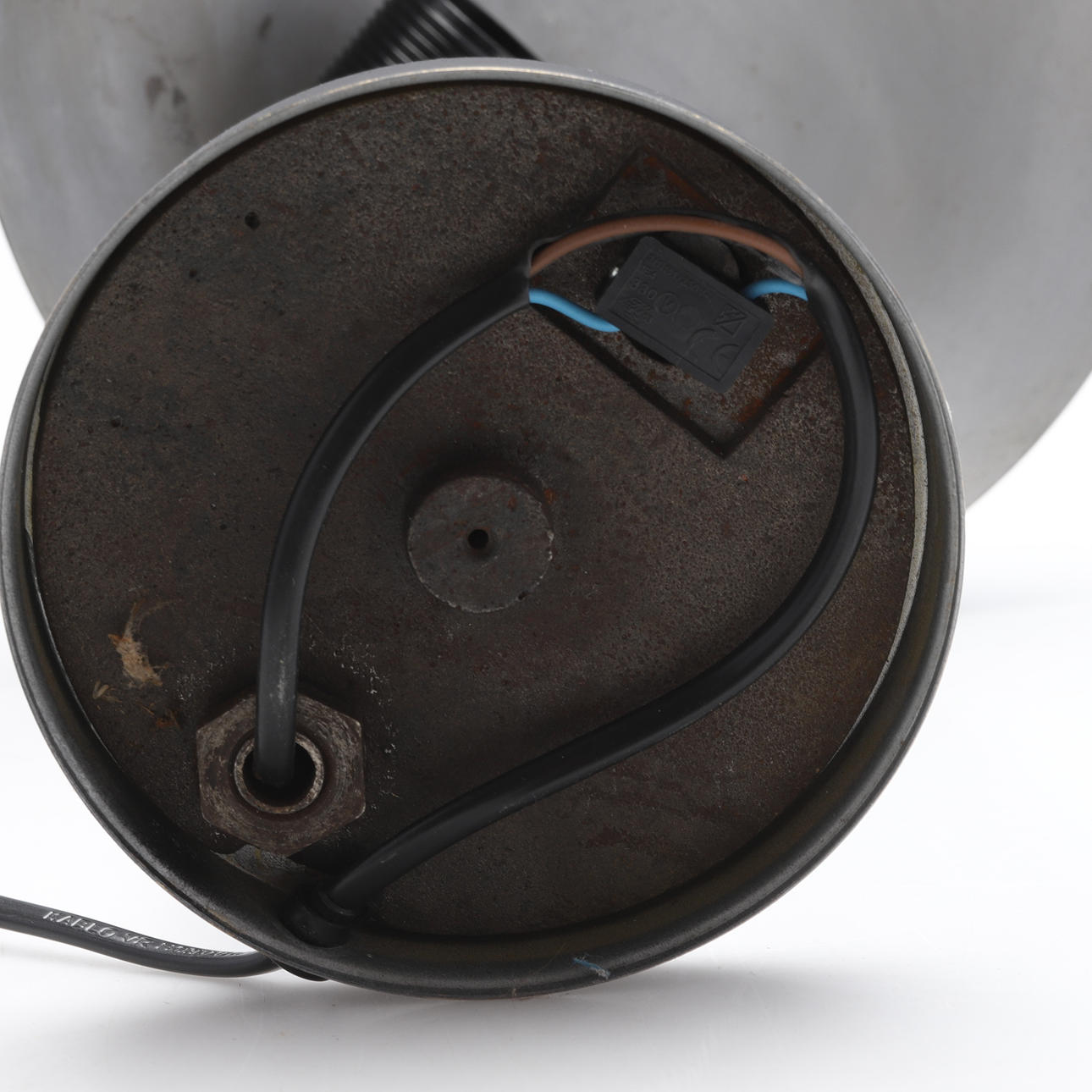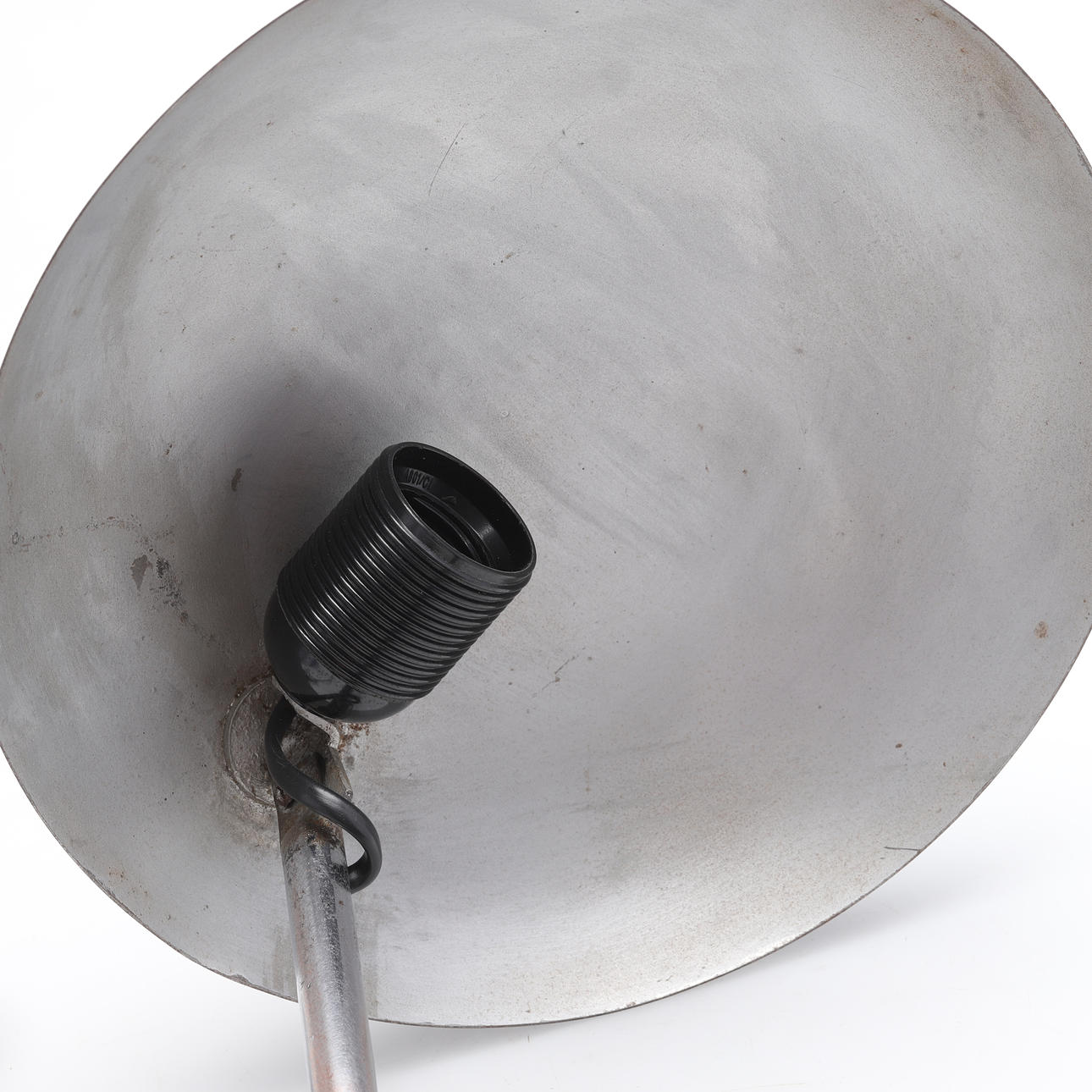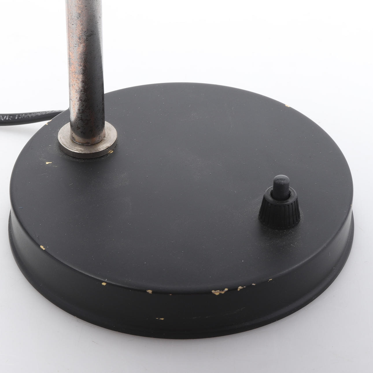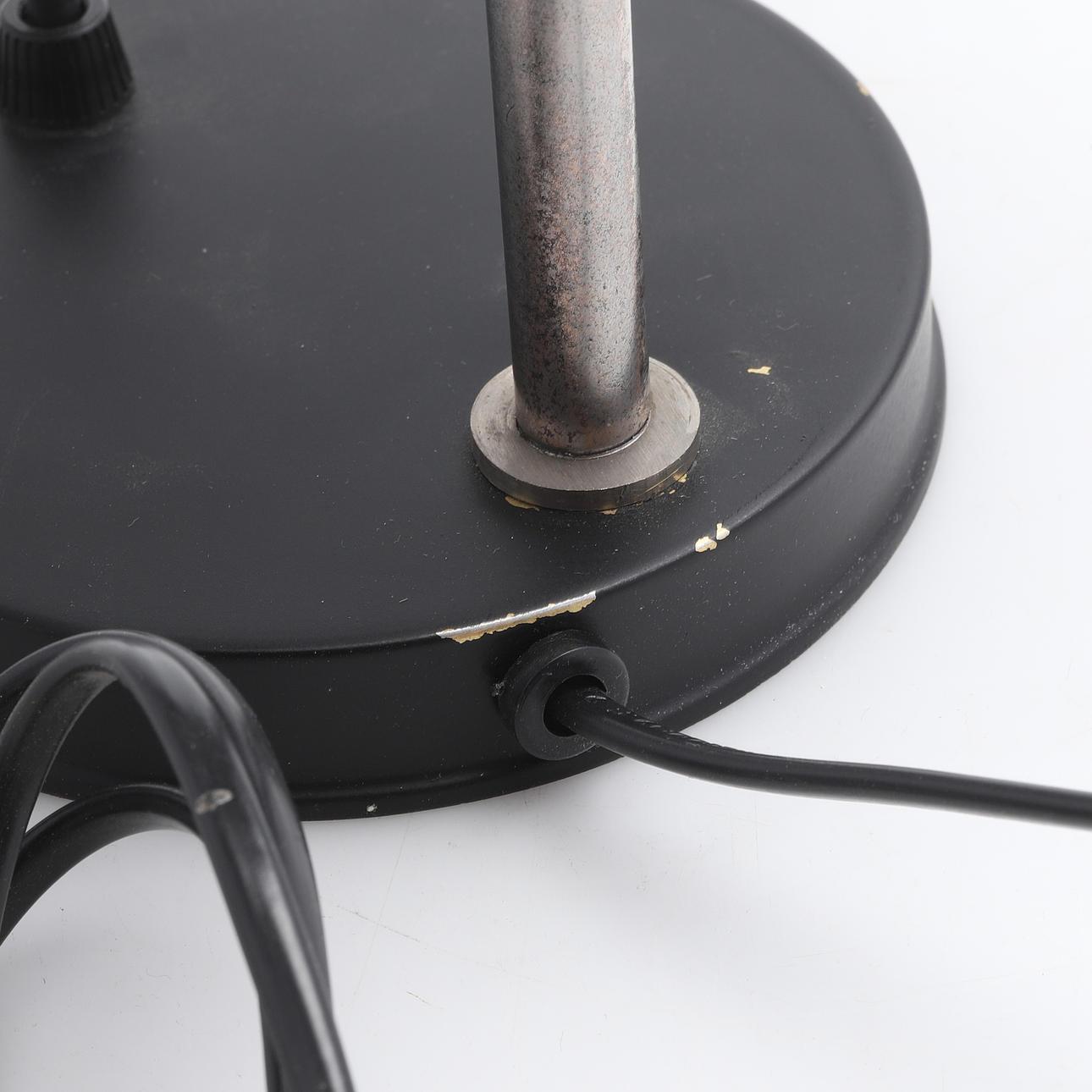 Svartlackerad samt kromad metall. Ställbar skärm. Höjd ca ca 30 cm. Diameter ca 24 cm.