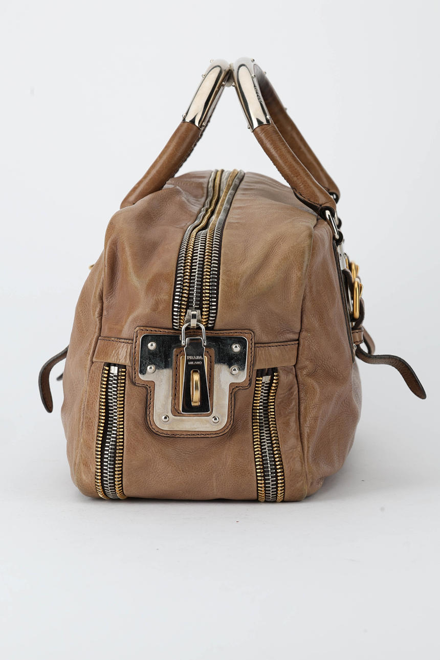 Väska i beiget läder med hardware i vitmetall. Genomgående dragkedjor längst sidorna. Märkt invändigt PRADA, MADE IN ITALY. Handtag drop ca 11 cm. Ca 34 x 17x13 cm.