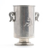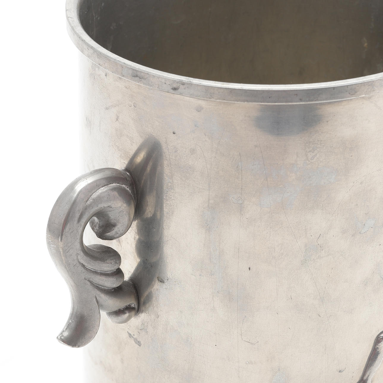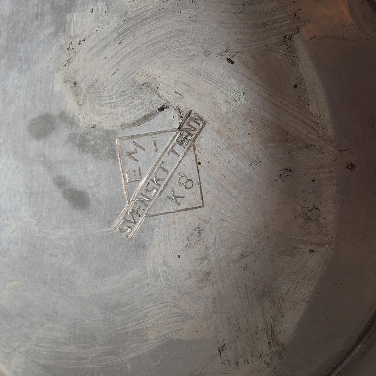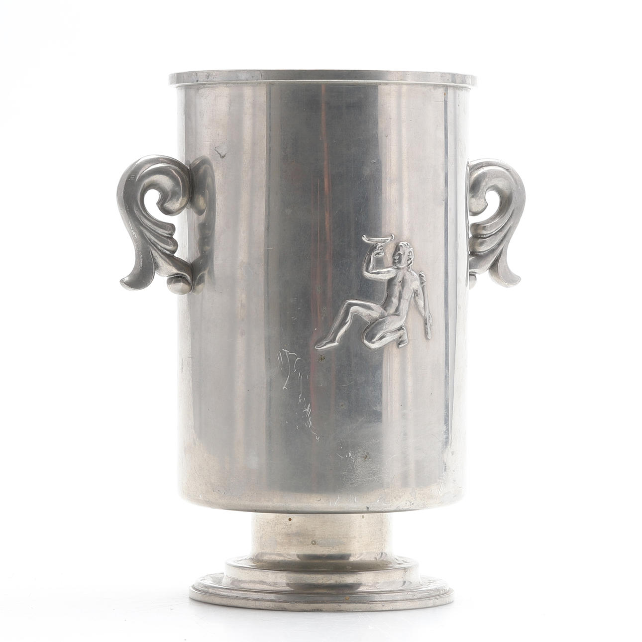 Tenn. Märkt. Med hänklar och klassicerande figur i relief. Diameter 12, höjd 20,5 cm.