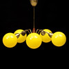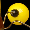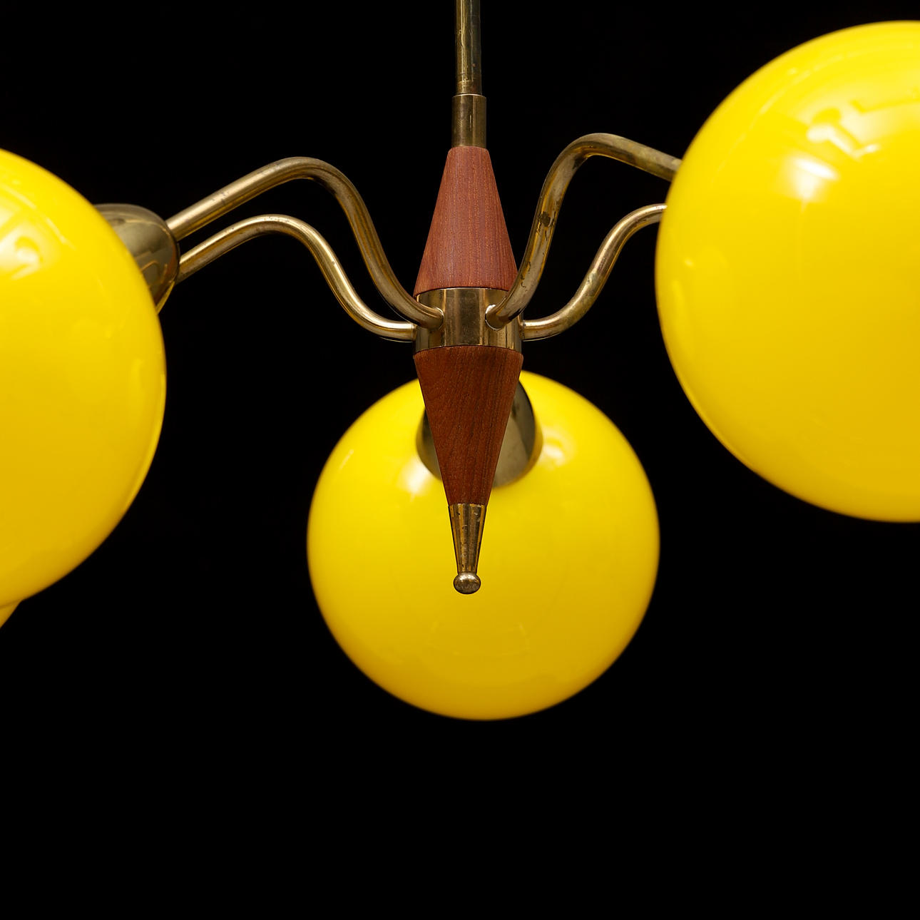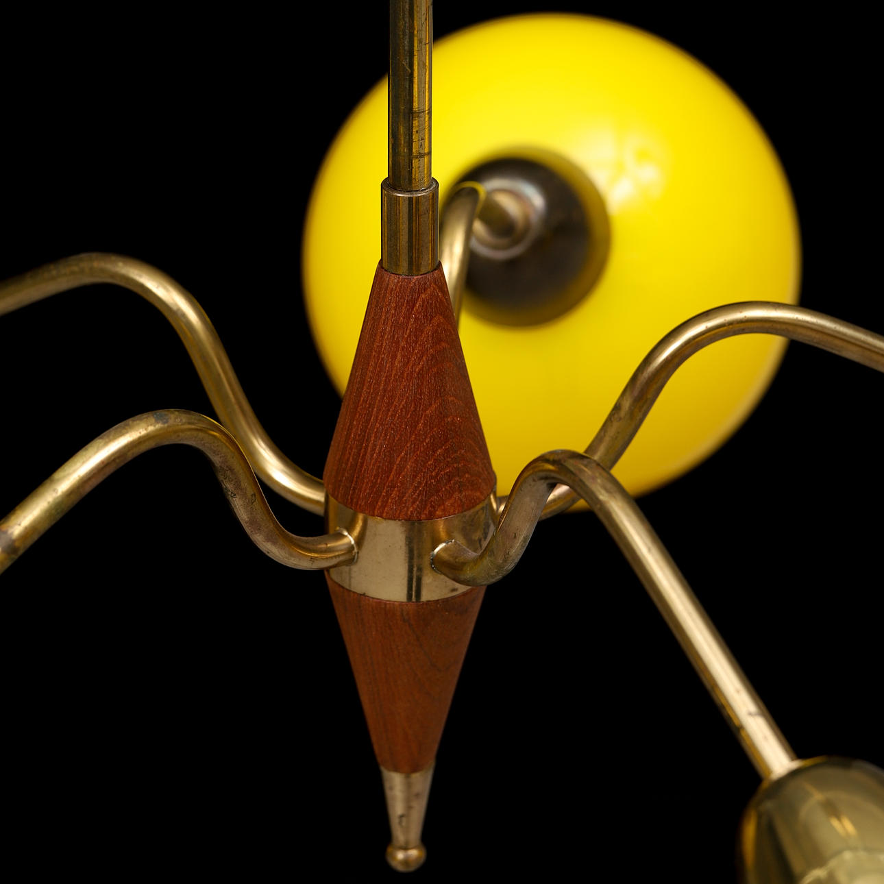 Stomme i mässing och teak. 5 lamparmar med runda kupor i gult glas. Höjd 47 cm. Diameter ca 65 cm.