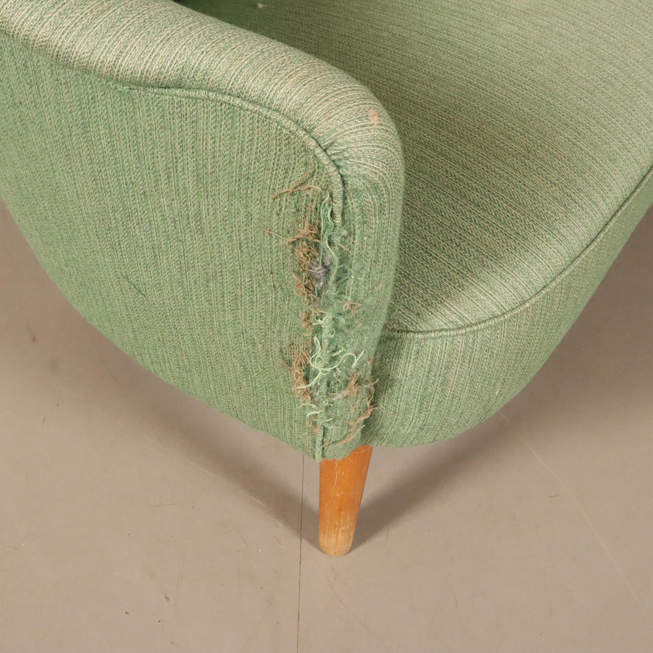 ena sidan med skador i tyg, bruksslitage.