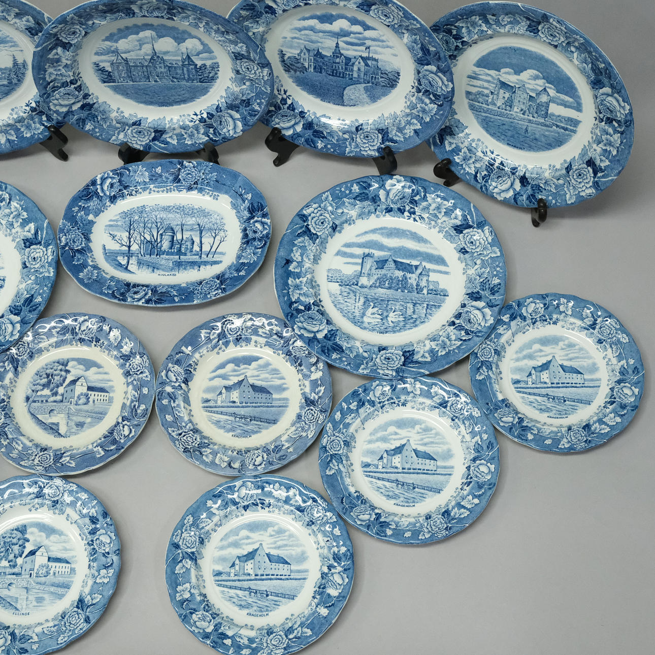 9 tallrikar, diameter 17,5cm, 7 tallrikar, diameter 24cm samt fat, längd 23cm.