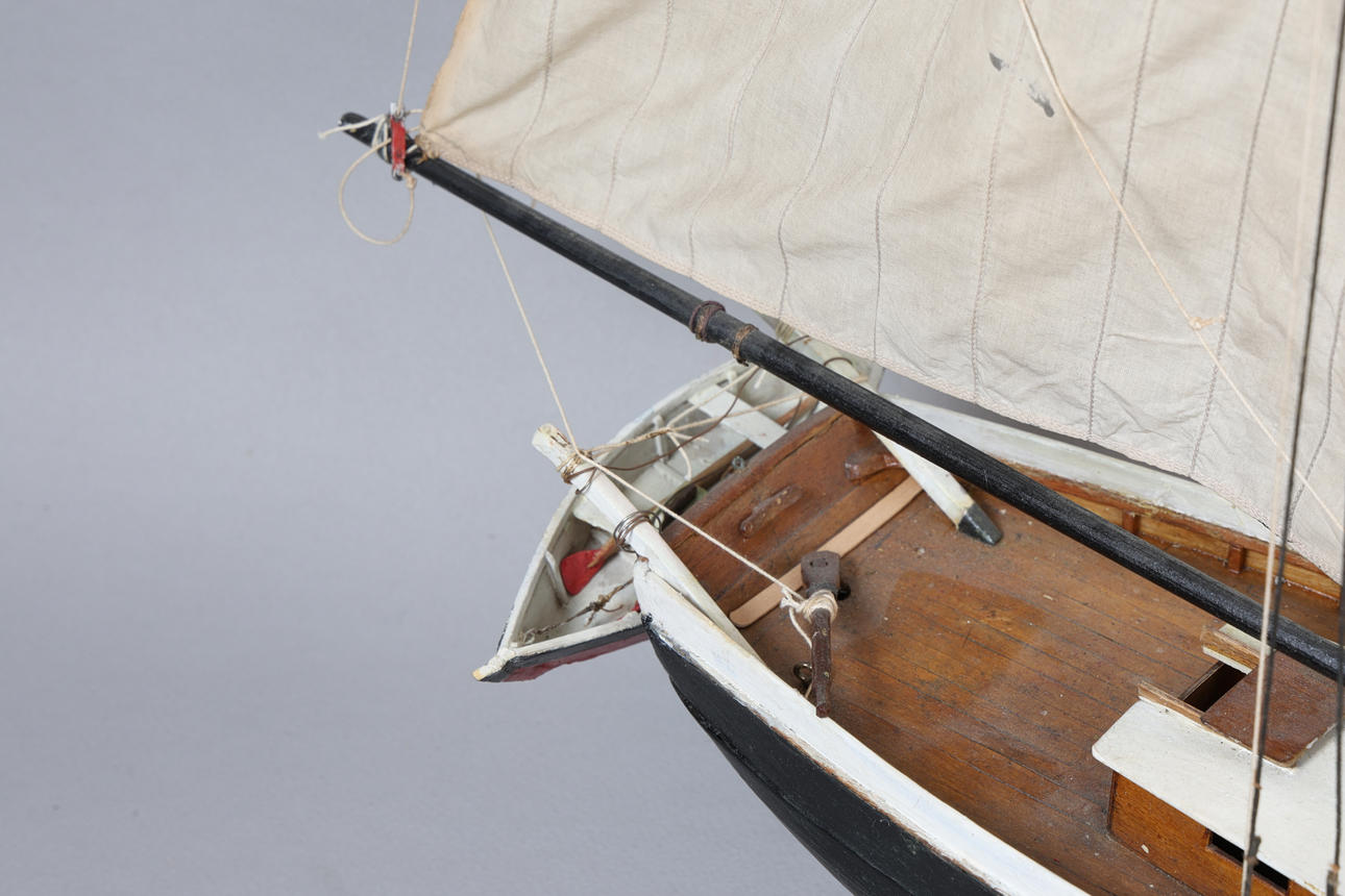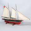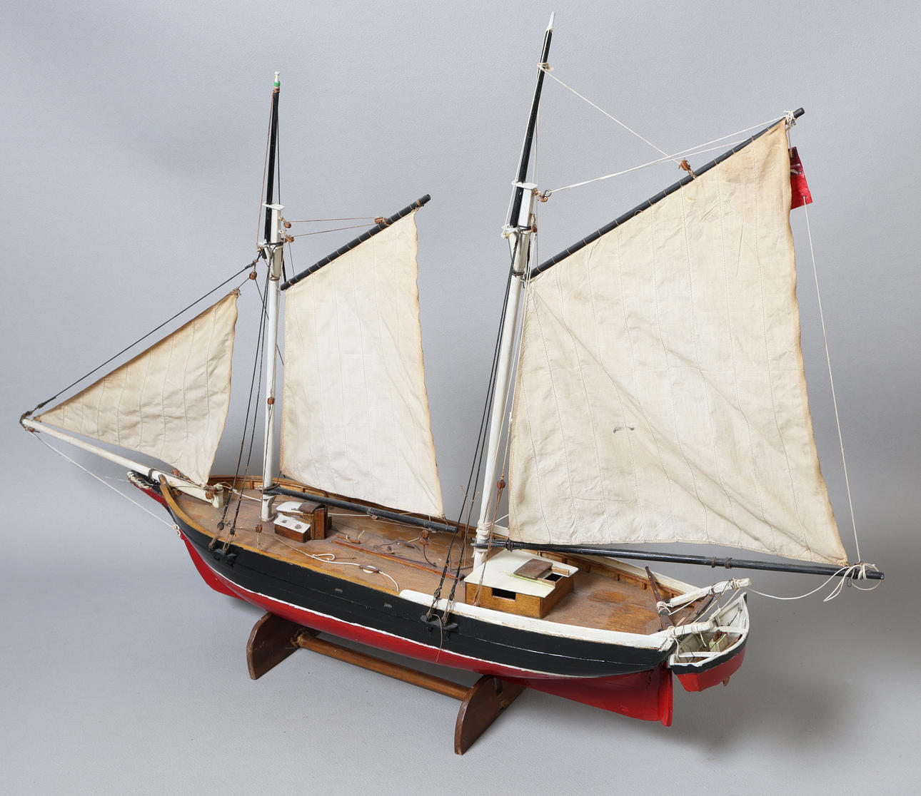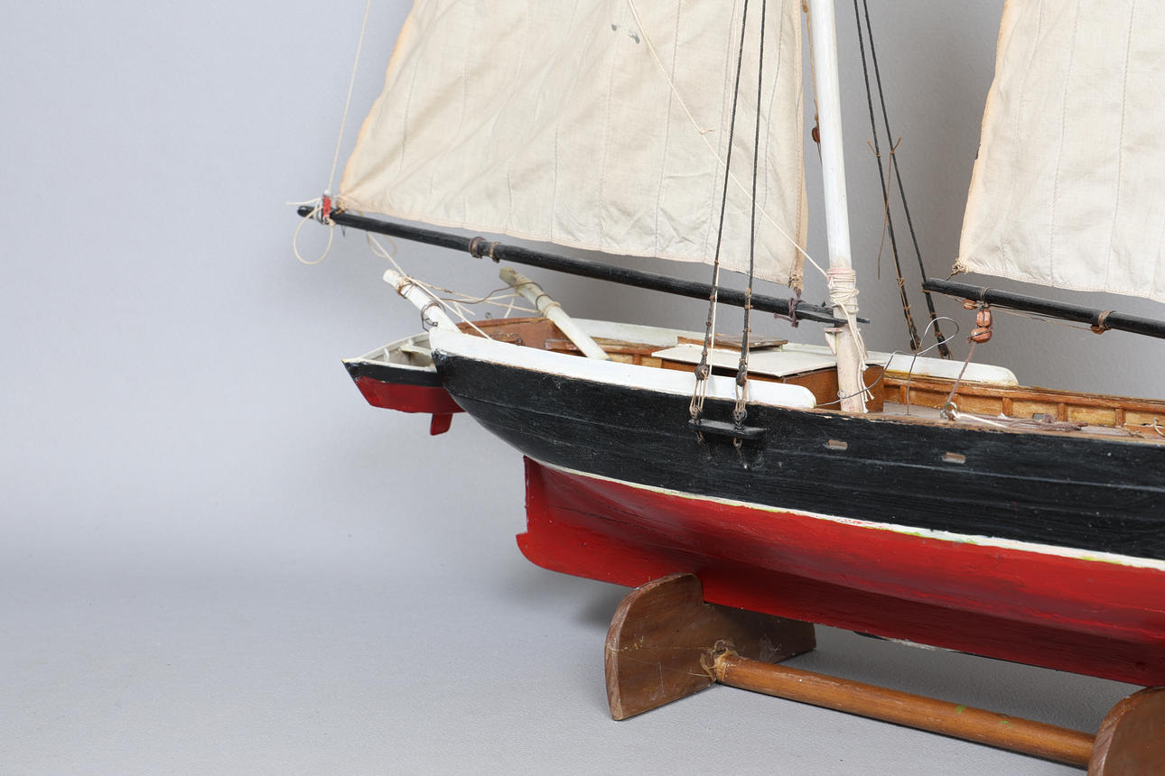 Har två master med tre segel ovanför ett svart och rödmålat skrov, 75cm bred 55cm hög.