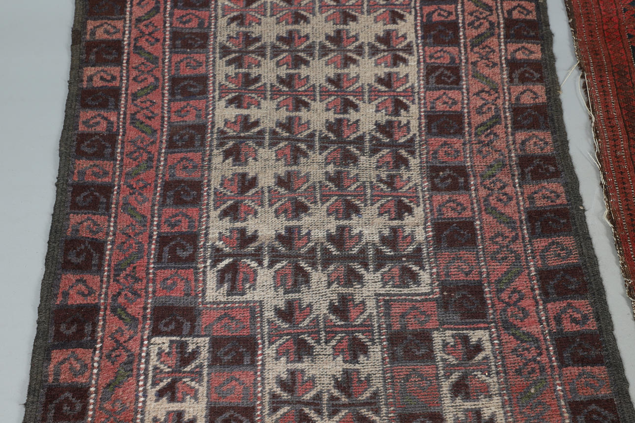 En röd markmatta från Mellanöstern med två rader medaljonger inom flera gränser (171cm x 129cm) och en liten mellanösternrosa mark- och elfenbensfältmatta (133 cm x 80 cm). (2).
