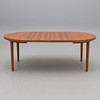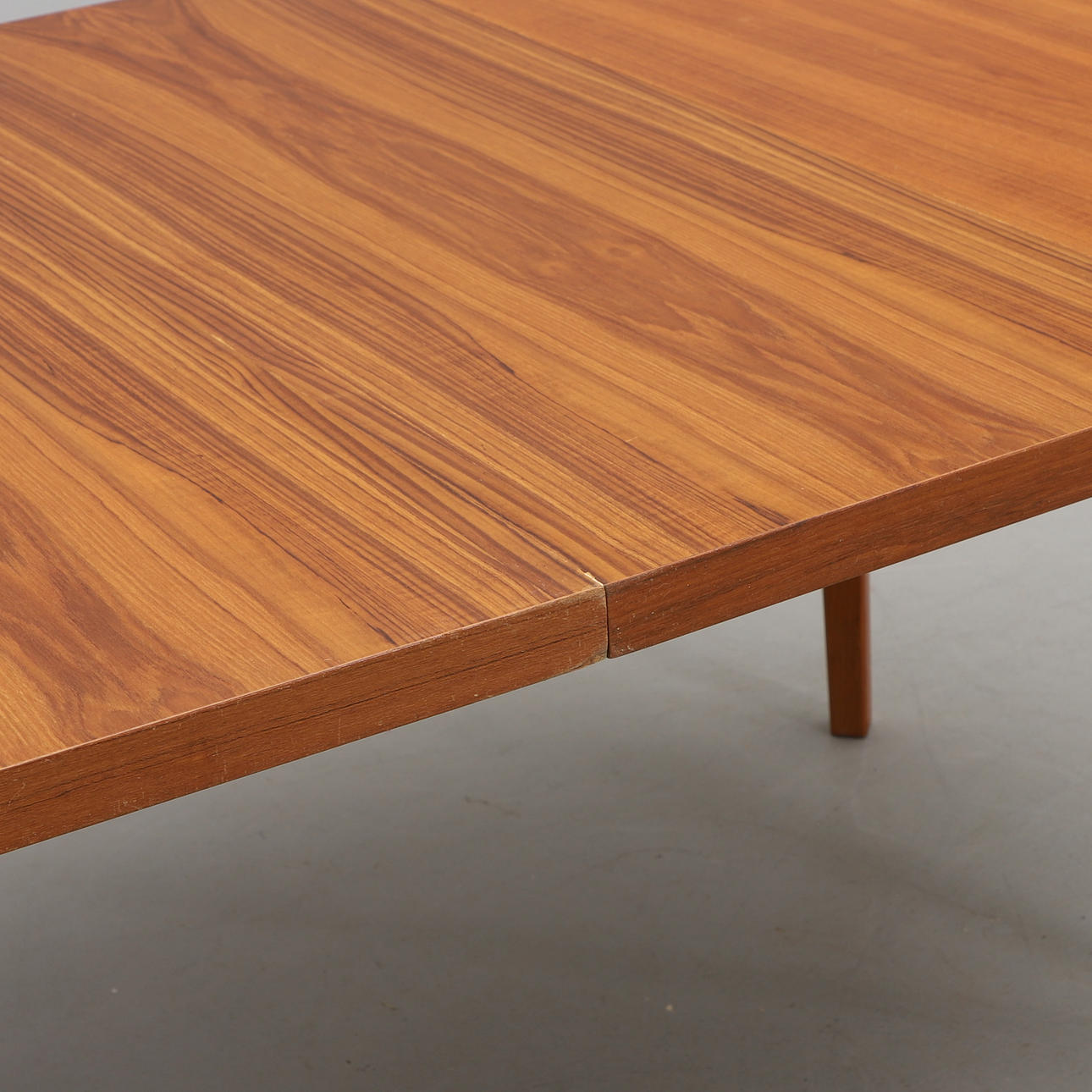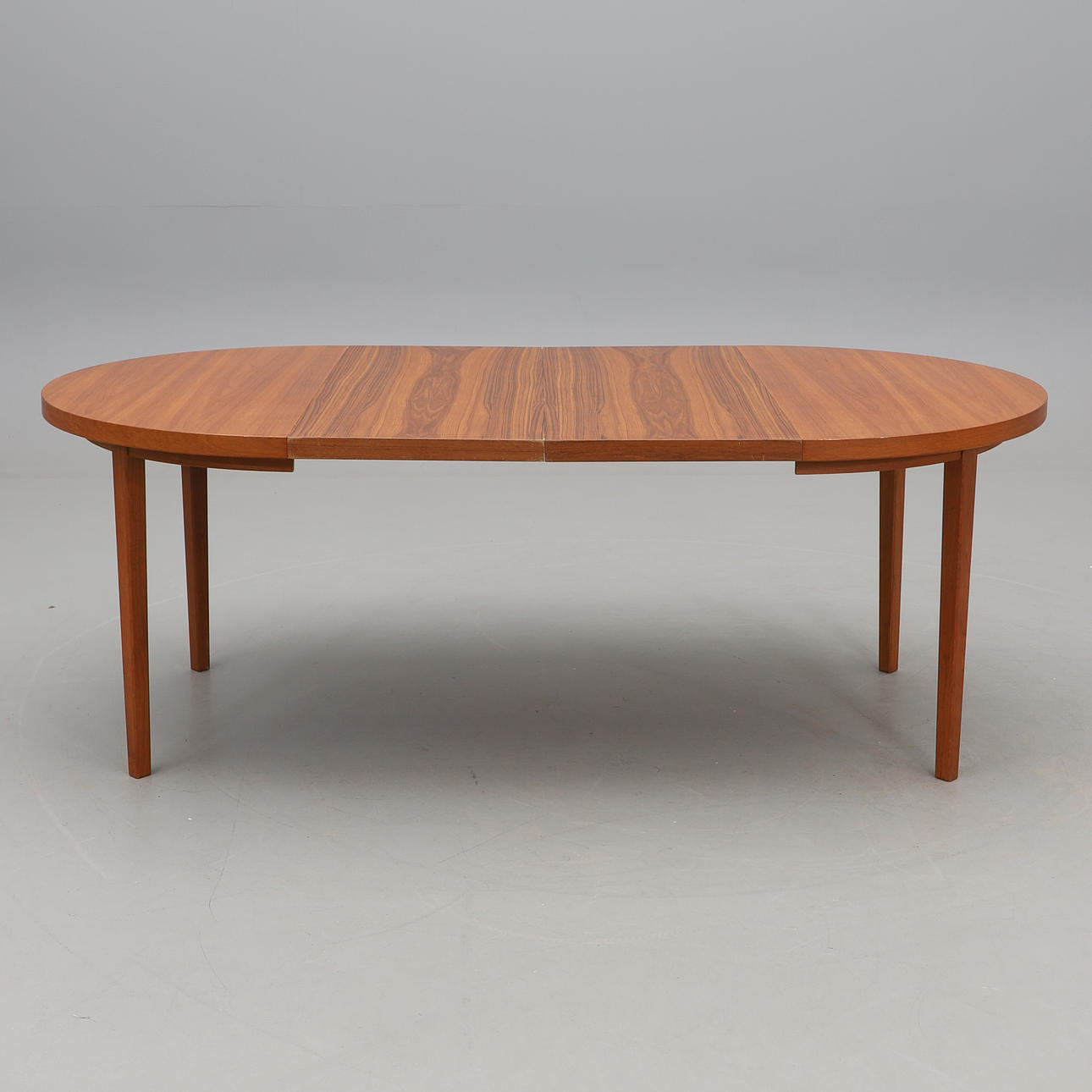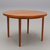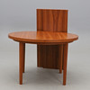 Teak- och valnötsfanerat. Rund delbar teakfanerad skiva, två valnötsfanerade iläggsskivor à 45 cm. Diam 112, höjd 72 cm.