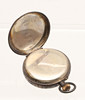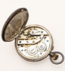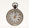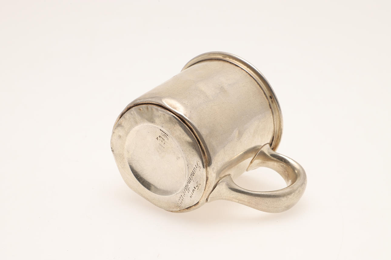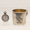 Dopmuggen med personliga gravyrer (en daterad 12.25.29), stämplad Gorham Sterling, höjd 7cm, vikt 2.9ozt. Tillsammans med ett kontinentalt silver (möjligen tysk, märkt 0.935) fickur med vit emalj urtavla (4cm Diameter). (2).