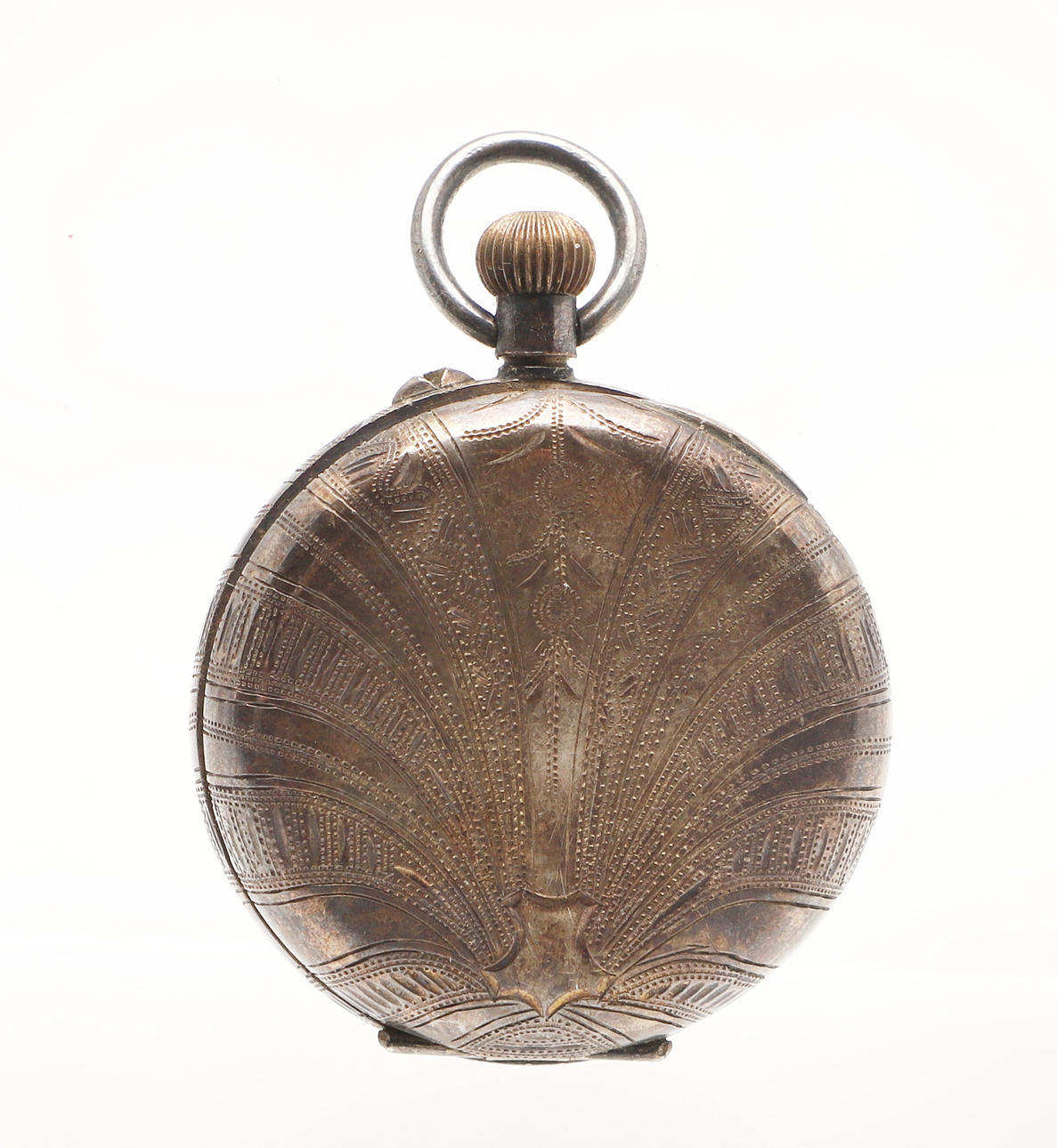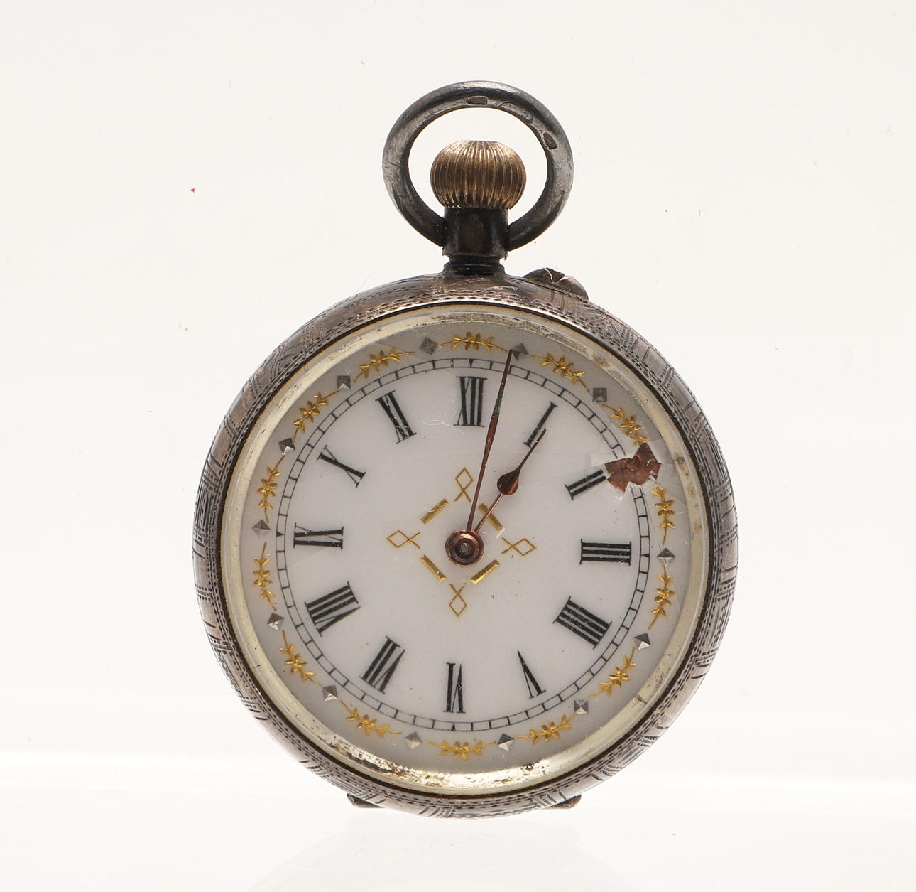 Dopmuggen kraftigt sliten, med olika bucklor och knackar/märken mm, fickuret slingrar sig men tickar inte och springer inte och med sprucken urtavla. Se bilder online.