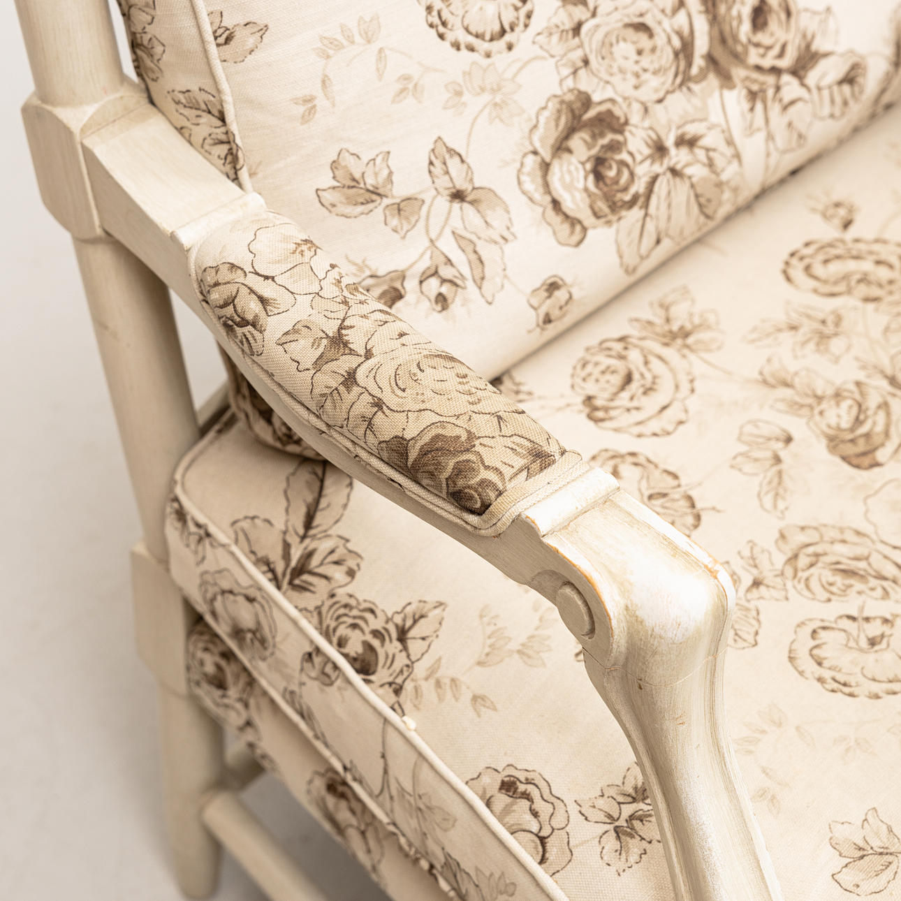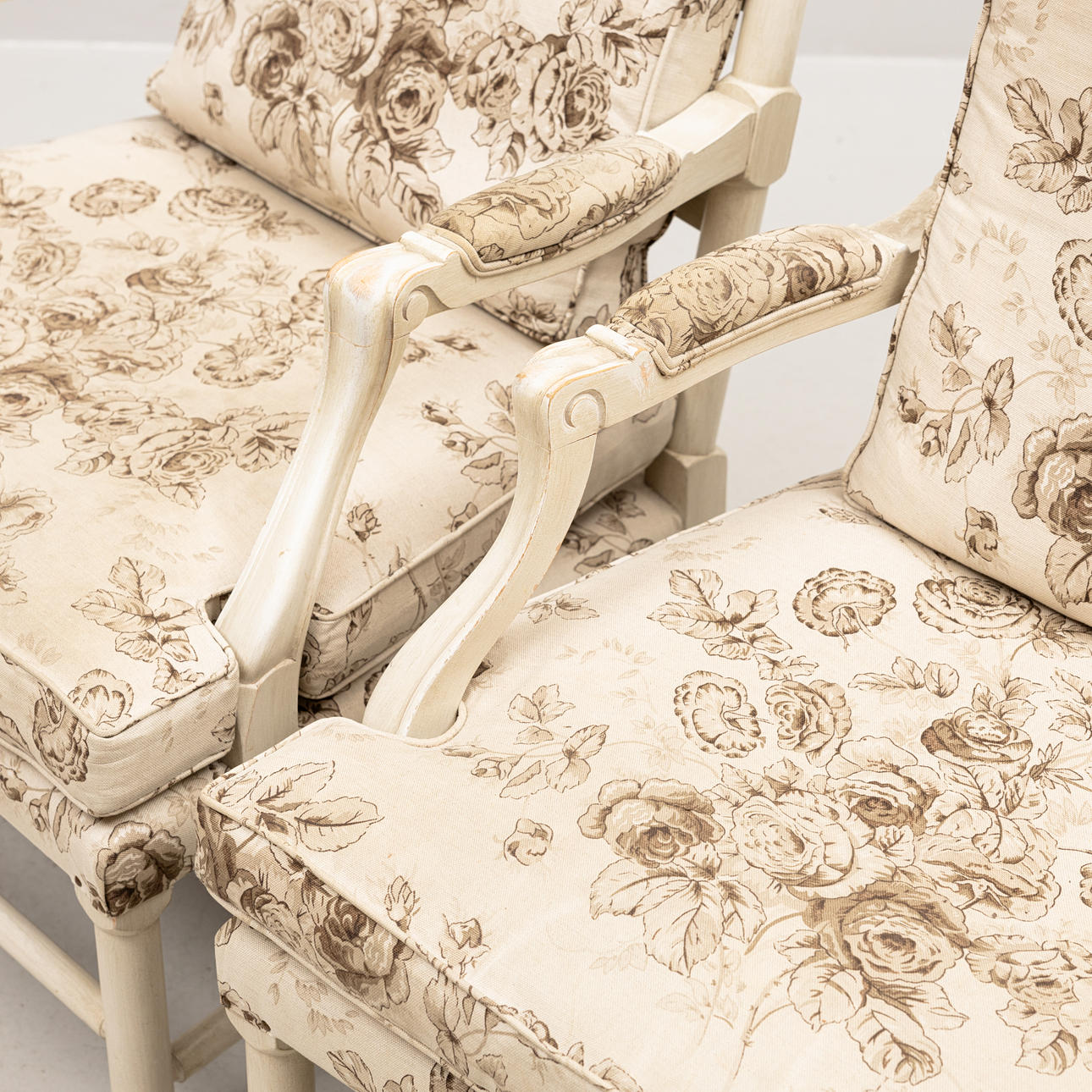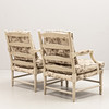 Klädda armstöd, genombruten rygg, gråmålade, stoppad löstagbar sits och rygg, beige tyg med brunbeige blommönster, bredd ca 66, djup 62, sitthöjd 45 och höjd 87 cm.