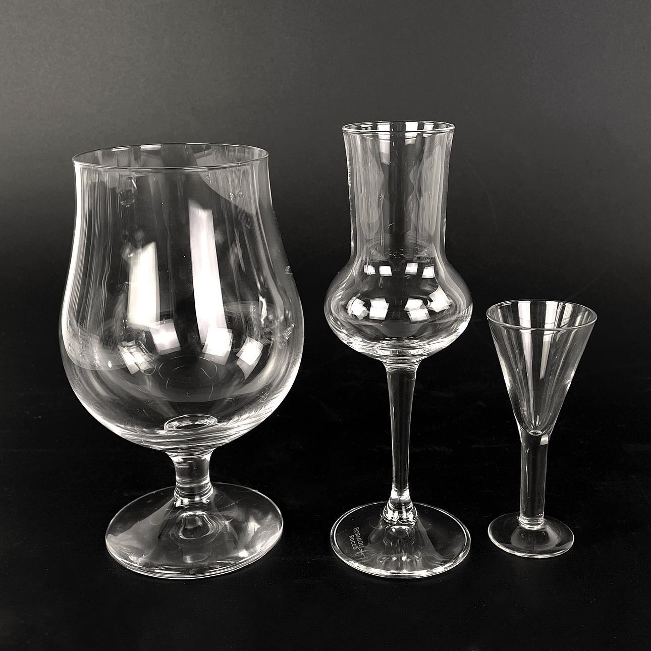 6 st grappaglas Riserva, Bormioli Rocco, höjd ca 16,5 cm, 8 st ölglas, höjd ca 15,5 cm. 9 st snapsglas, höjd ca 9,5 cm.