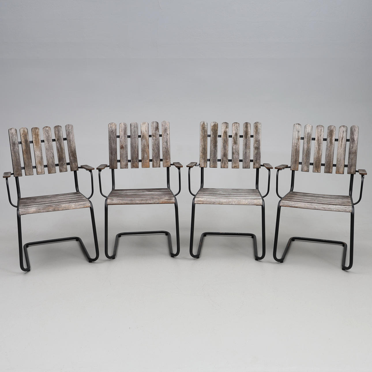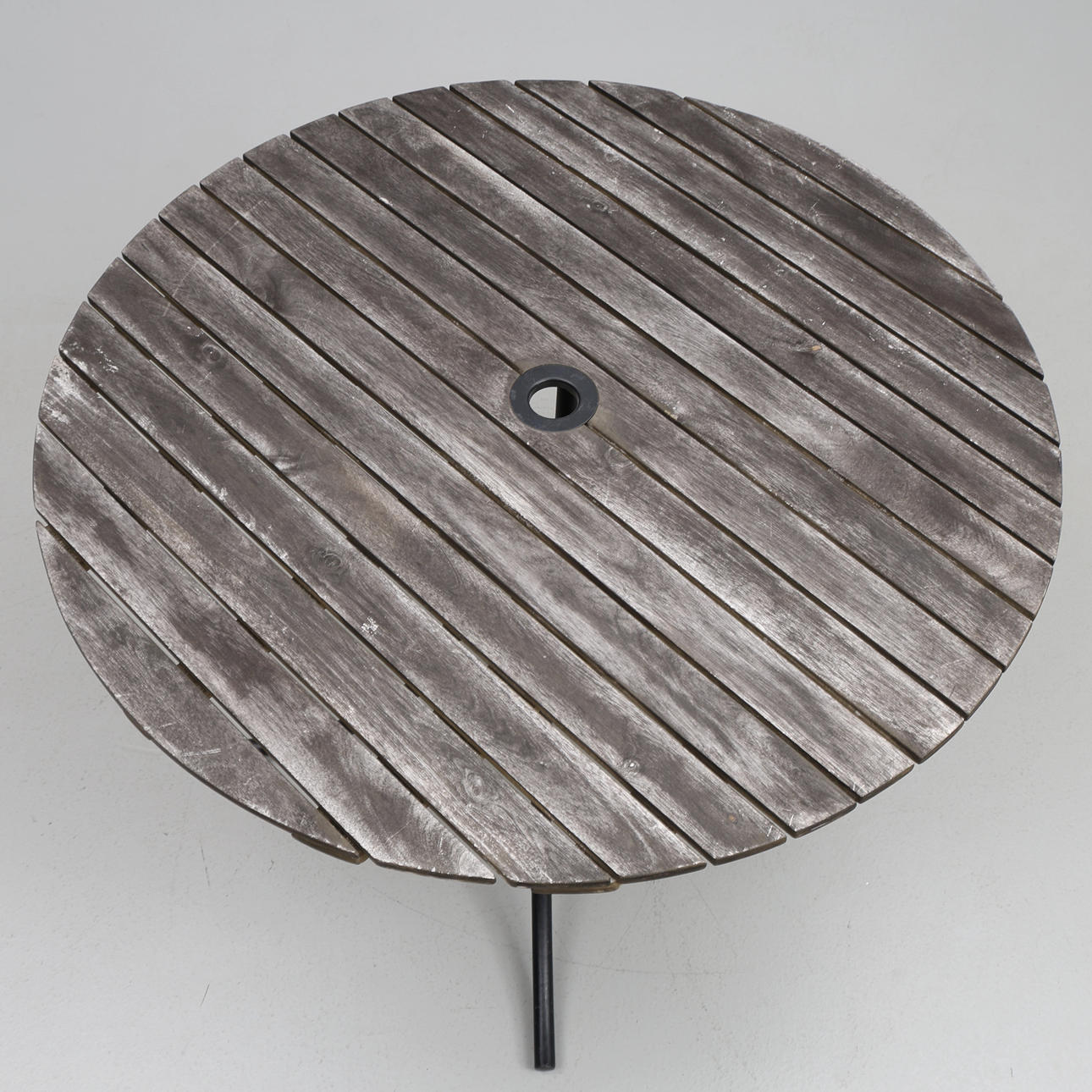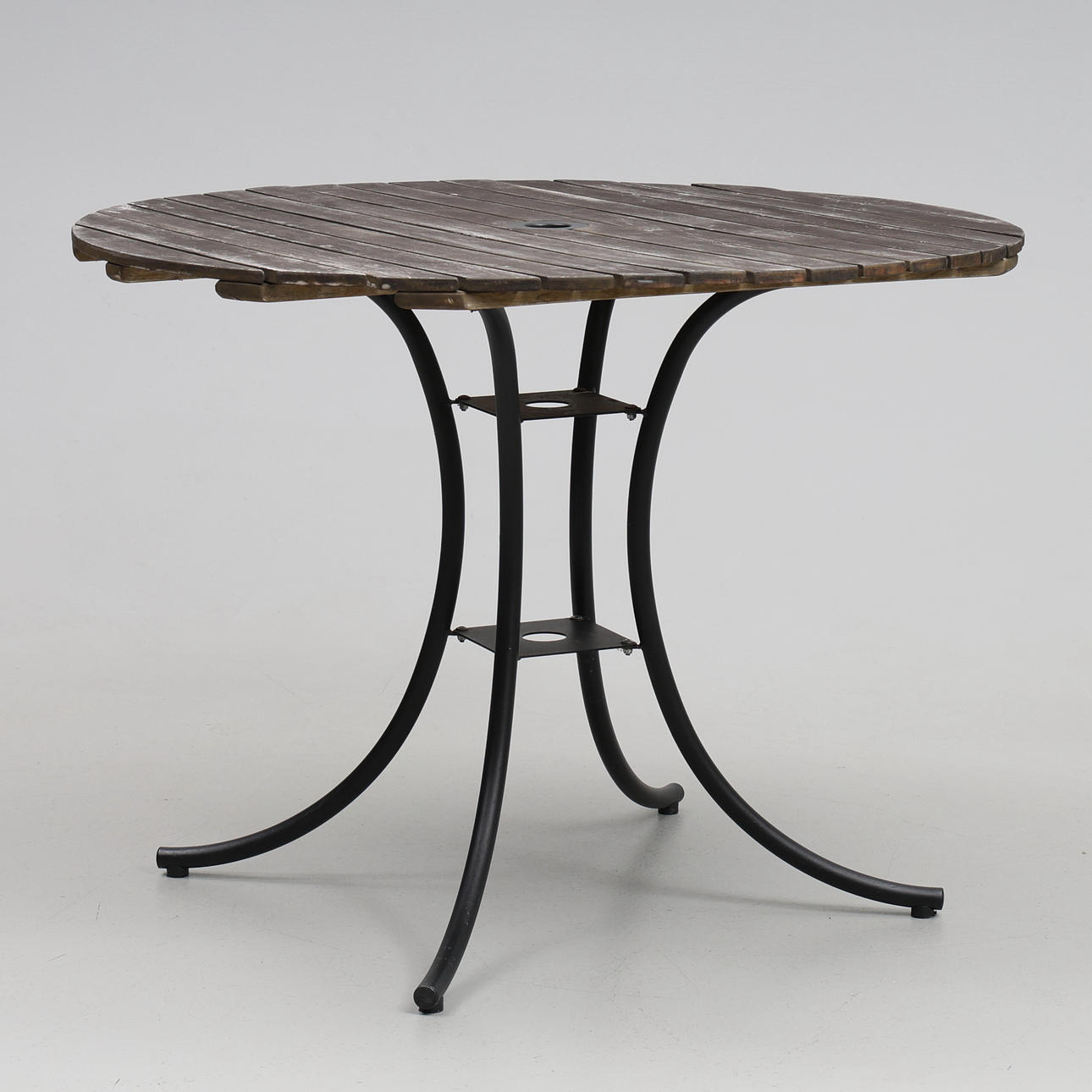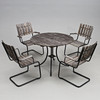 Rörstomme i metal med träribbor, troligen teak. Bord, ca. 104 cm Ø Stol, ca. 62 x 60 x 91 cm FSC-märkt (Miljömärkning trä).
