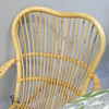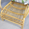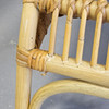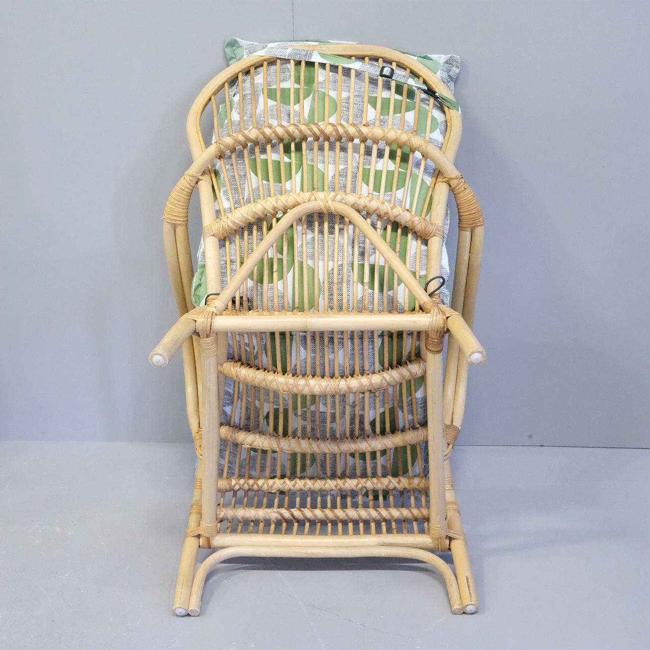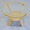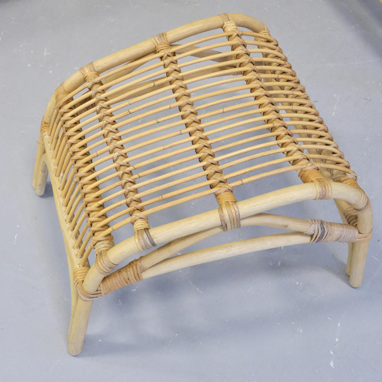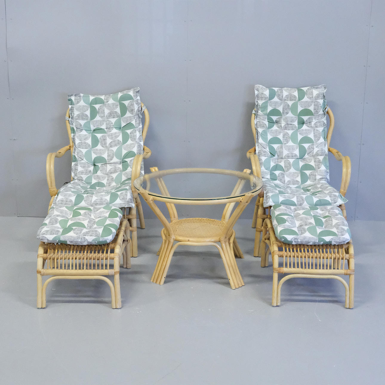 Två fåtöljer, höjd 89cm, sitthöjd 40cm. Två fotpallar, höjd 34cm, djup 52cm, bredd 48cm. Bord med glasskiva, höjd 52cm, diameter 73cm.